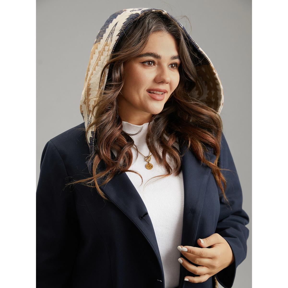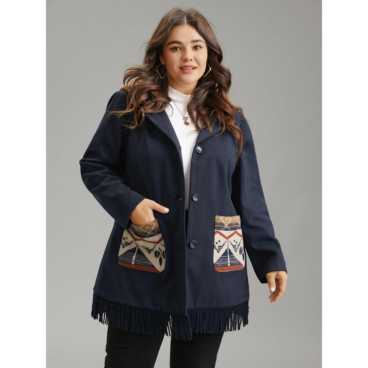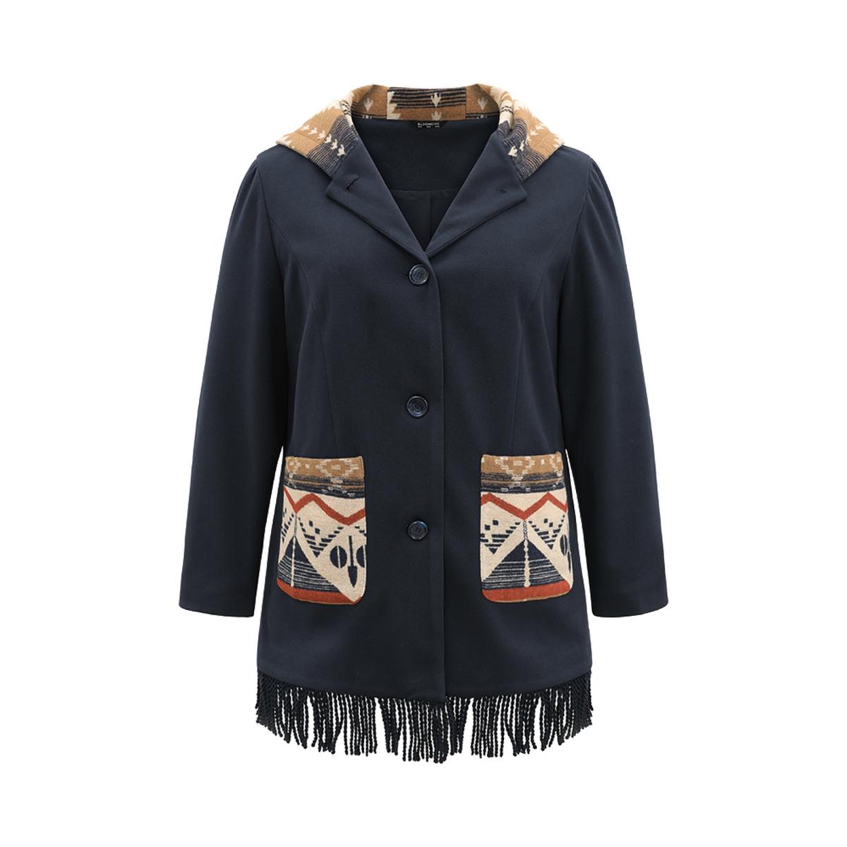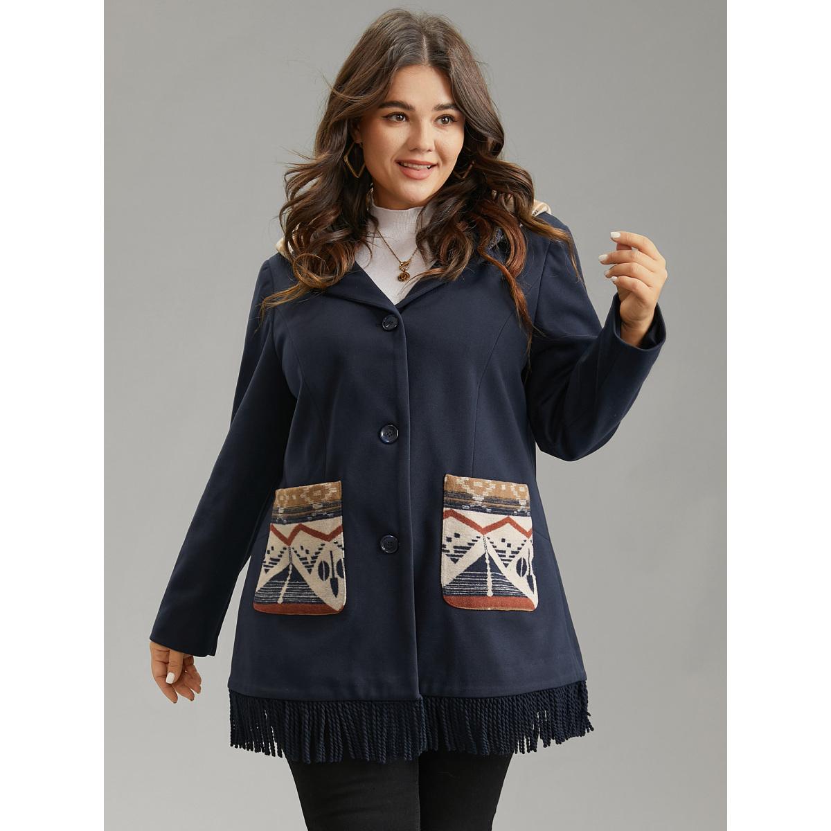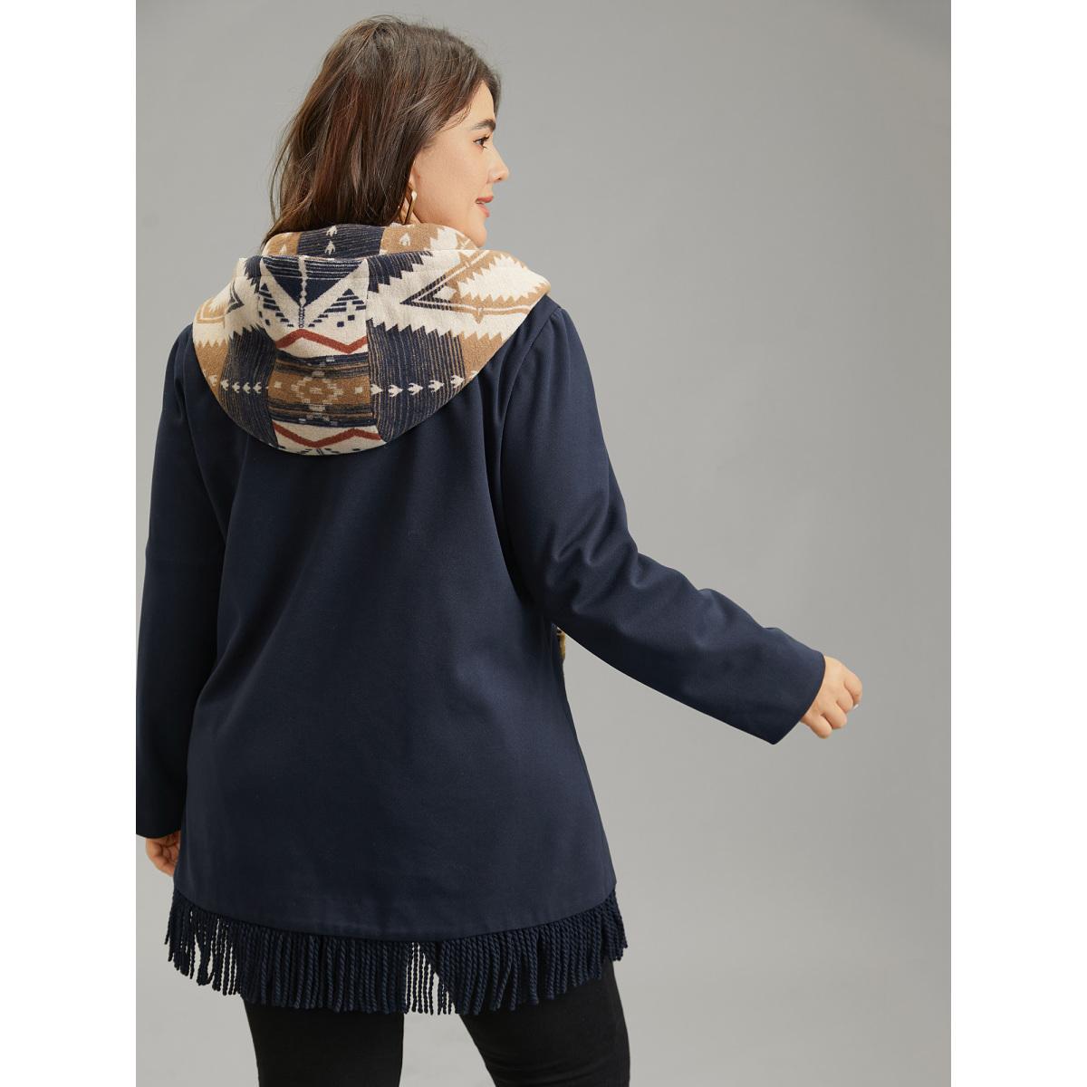 Plus Size Geometric Contrast Hooded Tassel Trim Coat Women Midnight Elegant Lined Ladies Dailywear Winter Coats BloomChic 18-20/2X