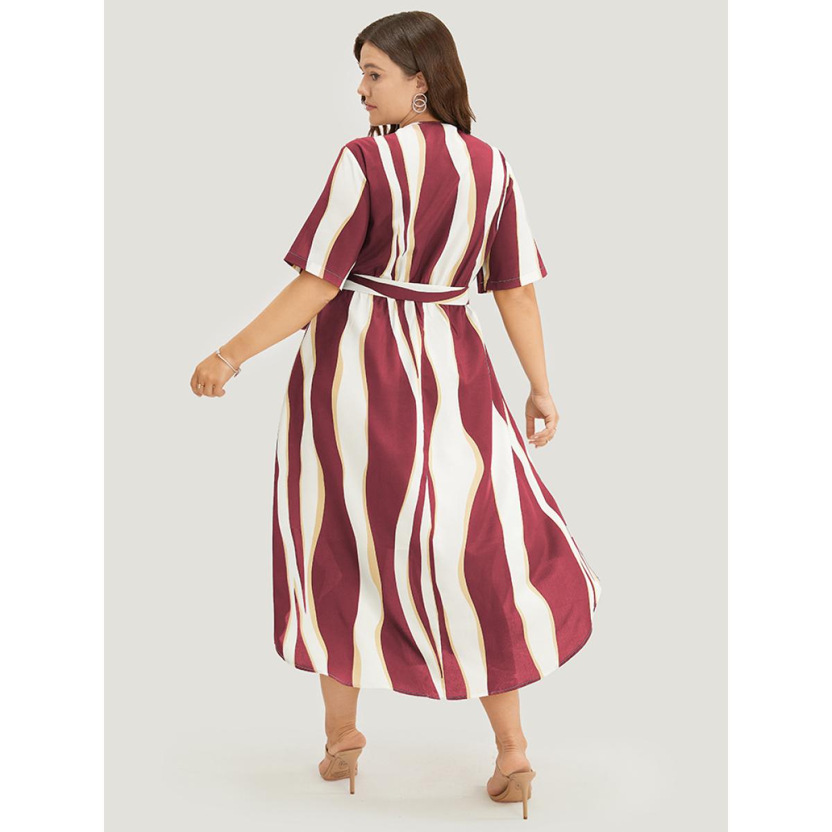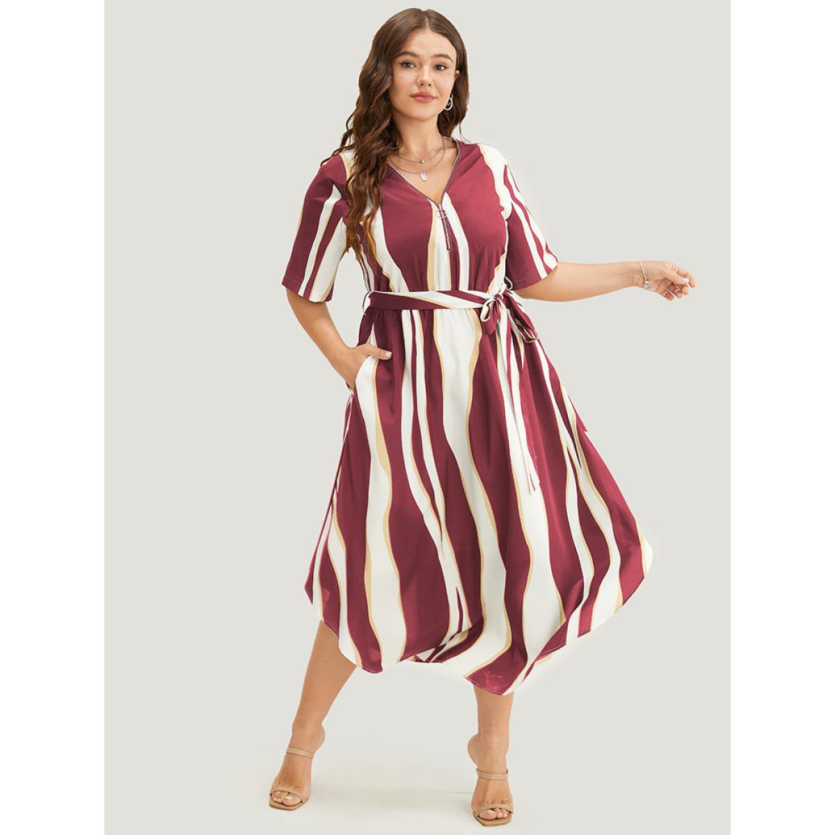 Plus Size Geometric Contrast Pocket Ruffle Belt Half Zipper Arc Hem Dress Burgundy Women Office Lined V-neck Short sleeve Curvy Midi Dress BloomChic 18-20/2X