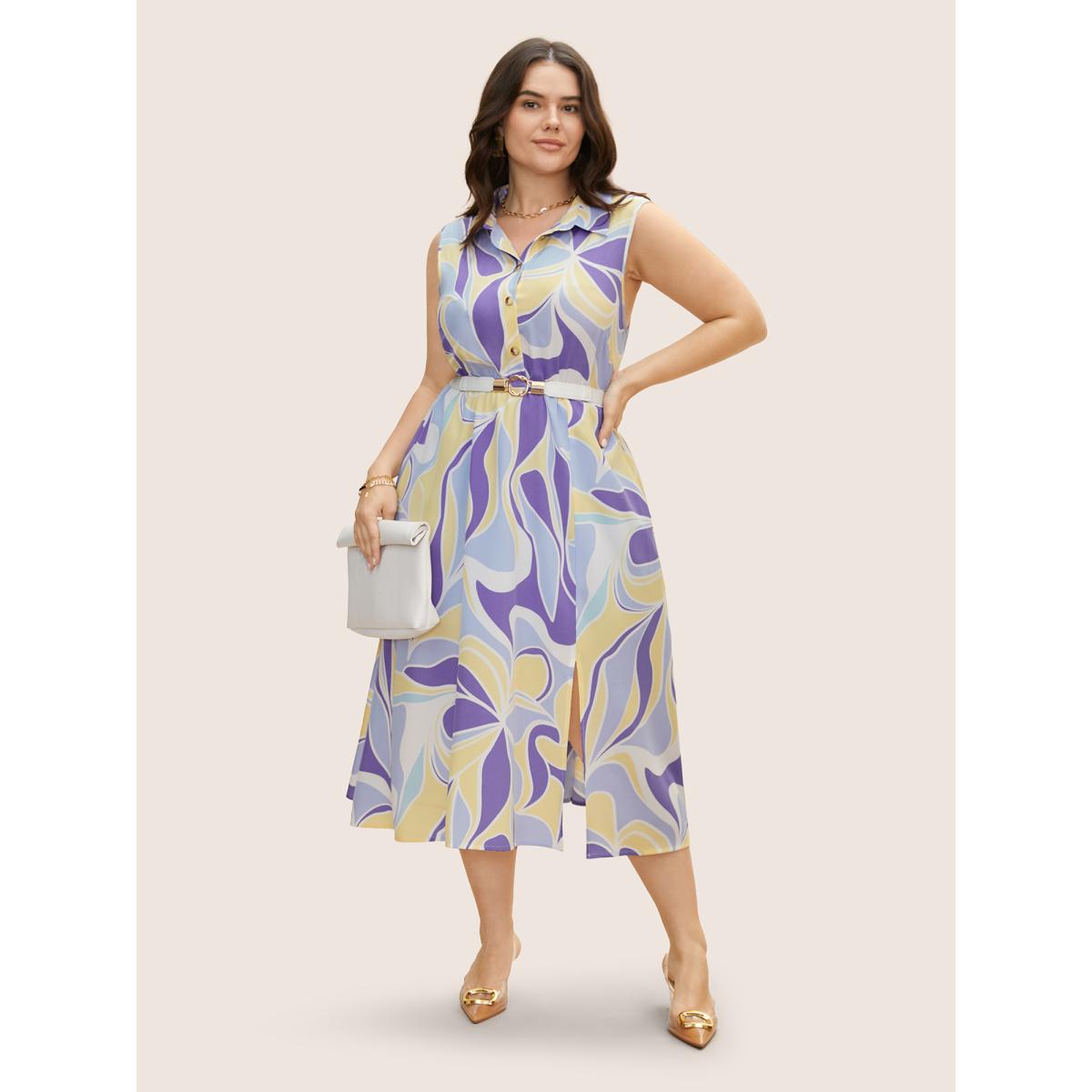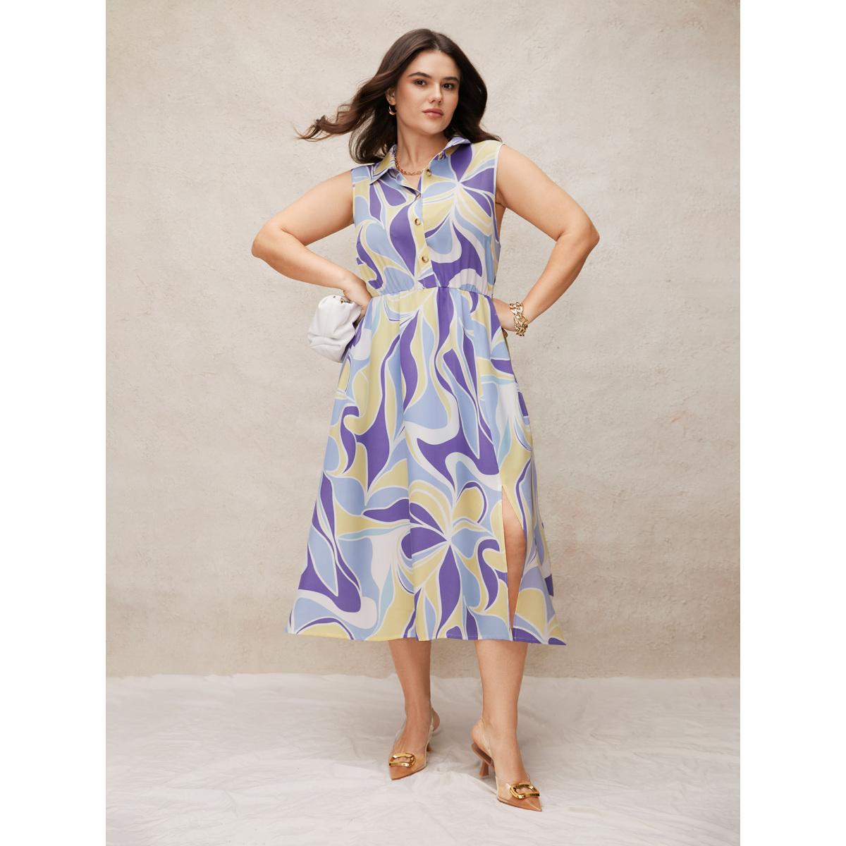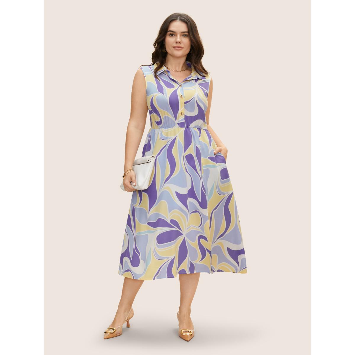Plus Size Geometric Elastic Waist Button Up Tank Dress Lavender Women At the Office Button Shirt collar Sleeveless Curvy BloomChic 26/4X