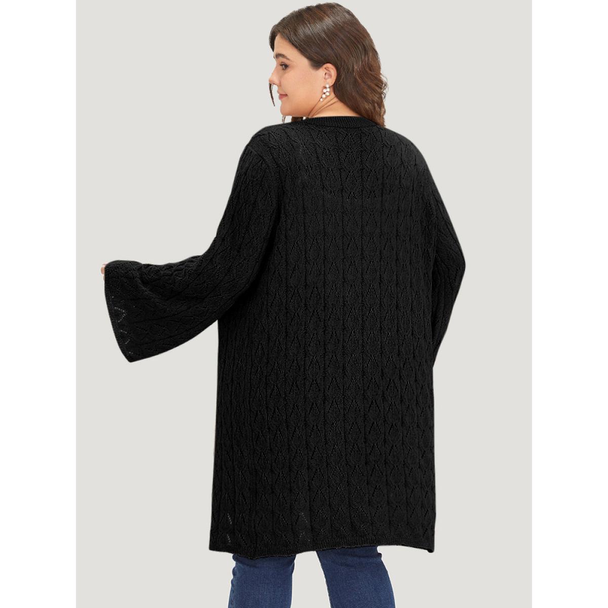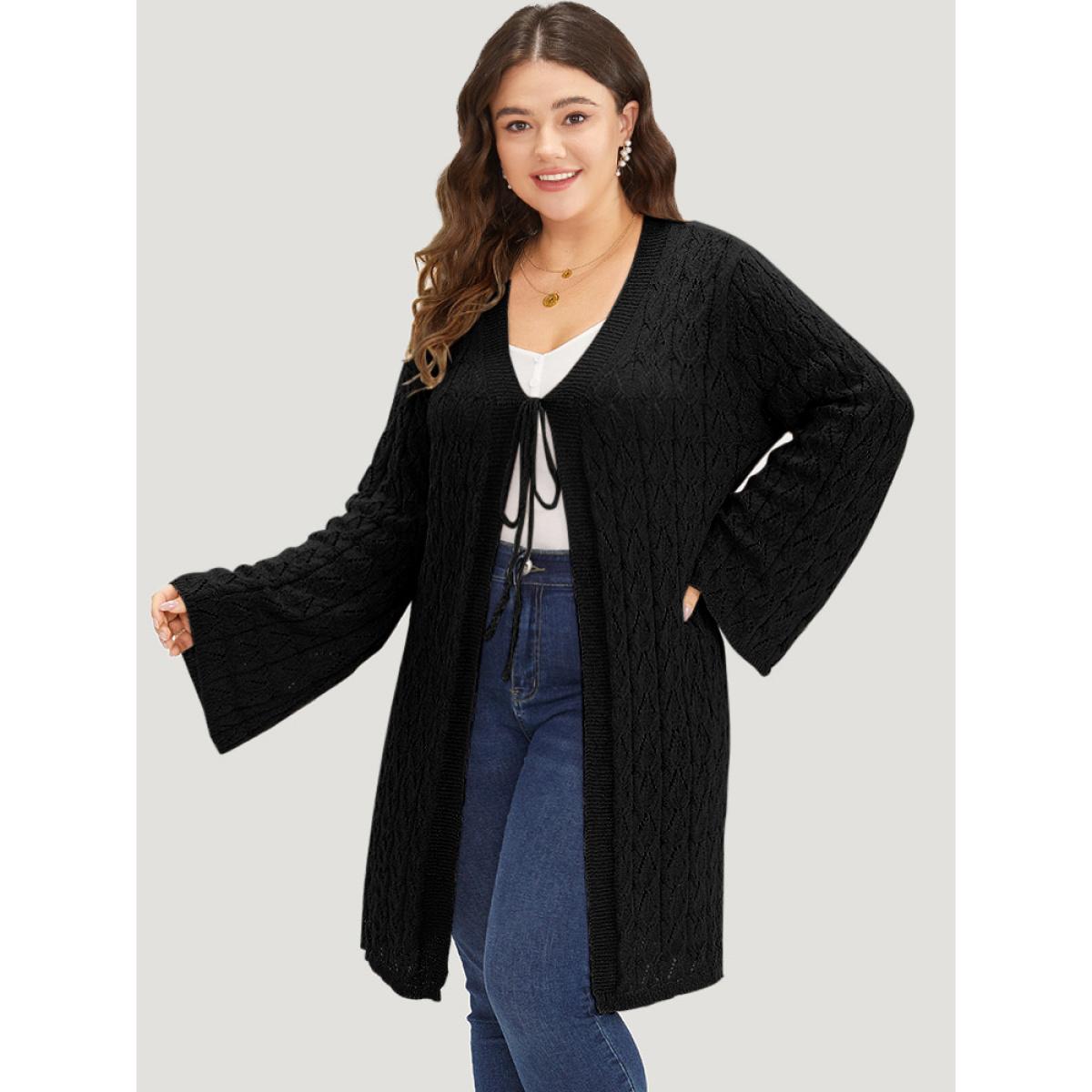 Plus Size Geometric Eyelet Tie Front Bell Sleeve Tunic Cardigan Black Women Casual Loose Long Sleeve Dailywear Cardigans BloomChic 26/4X