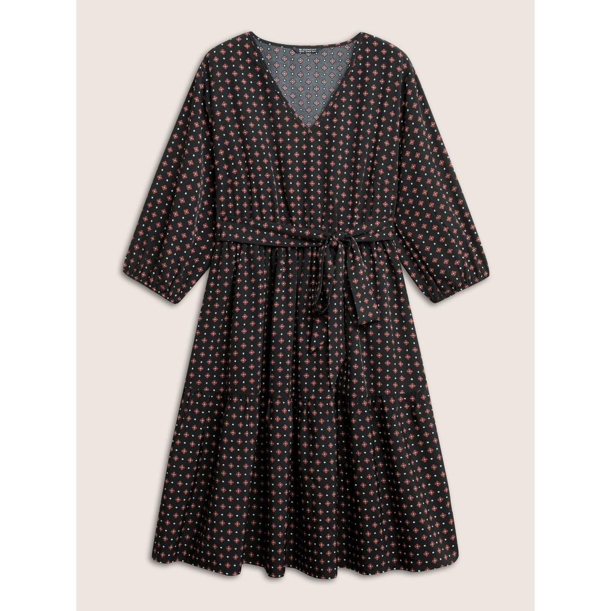 Plus Size Geometric Graphic Belted Pocket V Neck Dress Black Women Resort Non V-neck Elbow-length sleeve Curvy Midi Dress BloomChic 12/L Product Image