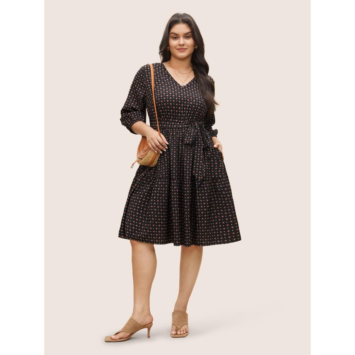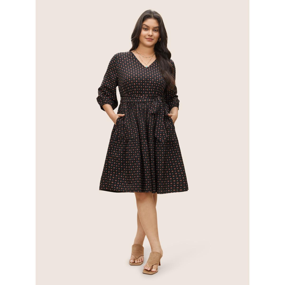 Plus Size Geometric Graphic Belted Pocket V Neck Dress Black Women Resort Non V-neck Elbow-length sleeve Curvy Midi Dress BloomChic 12/L