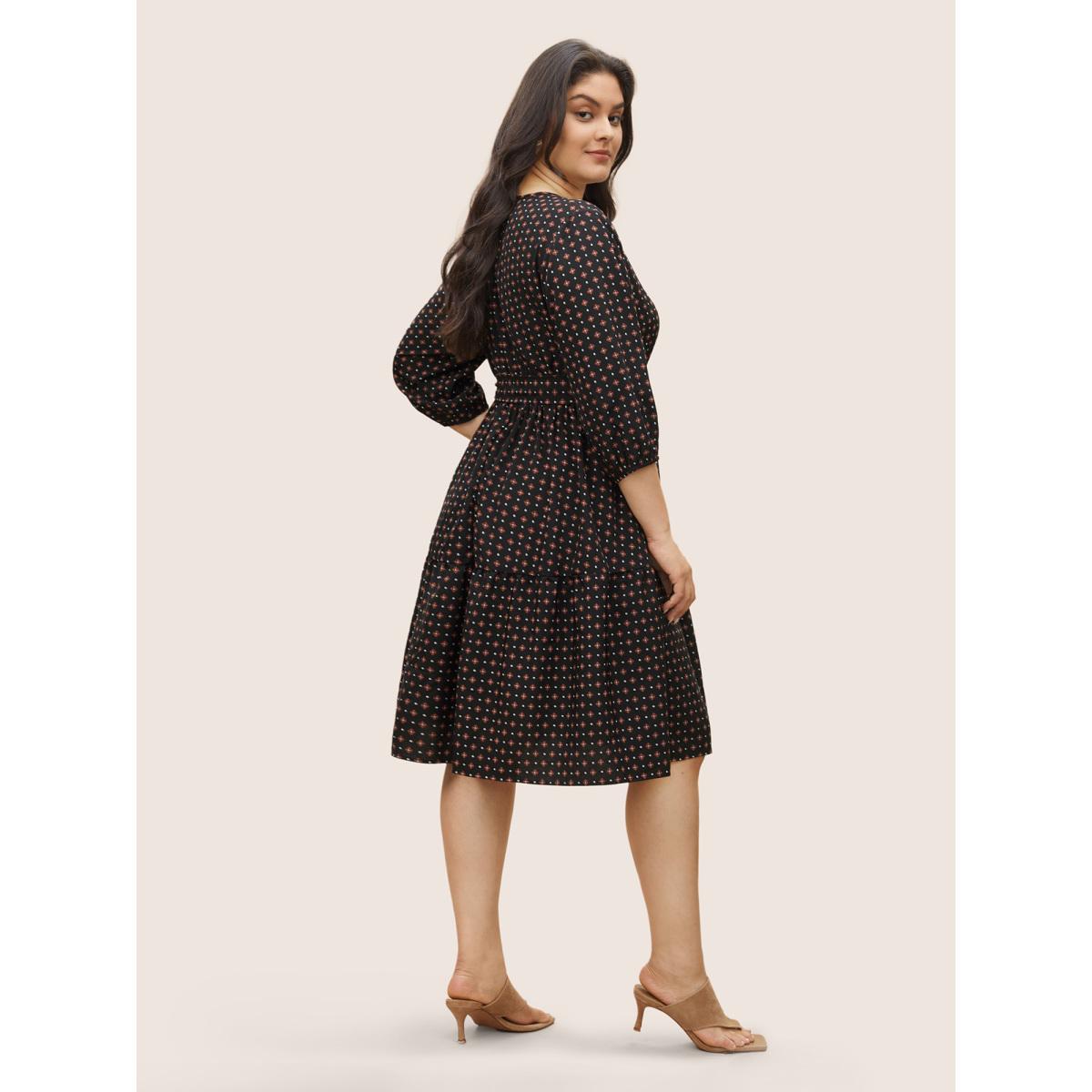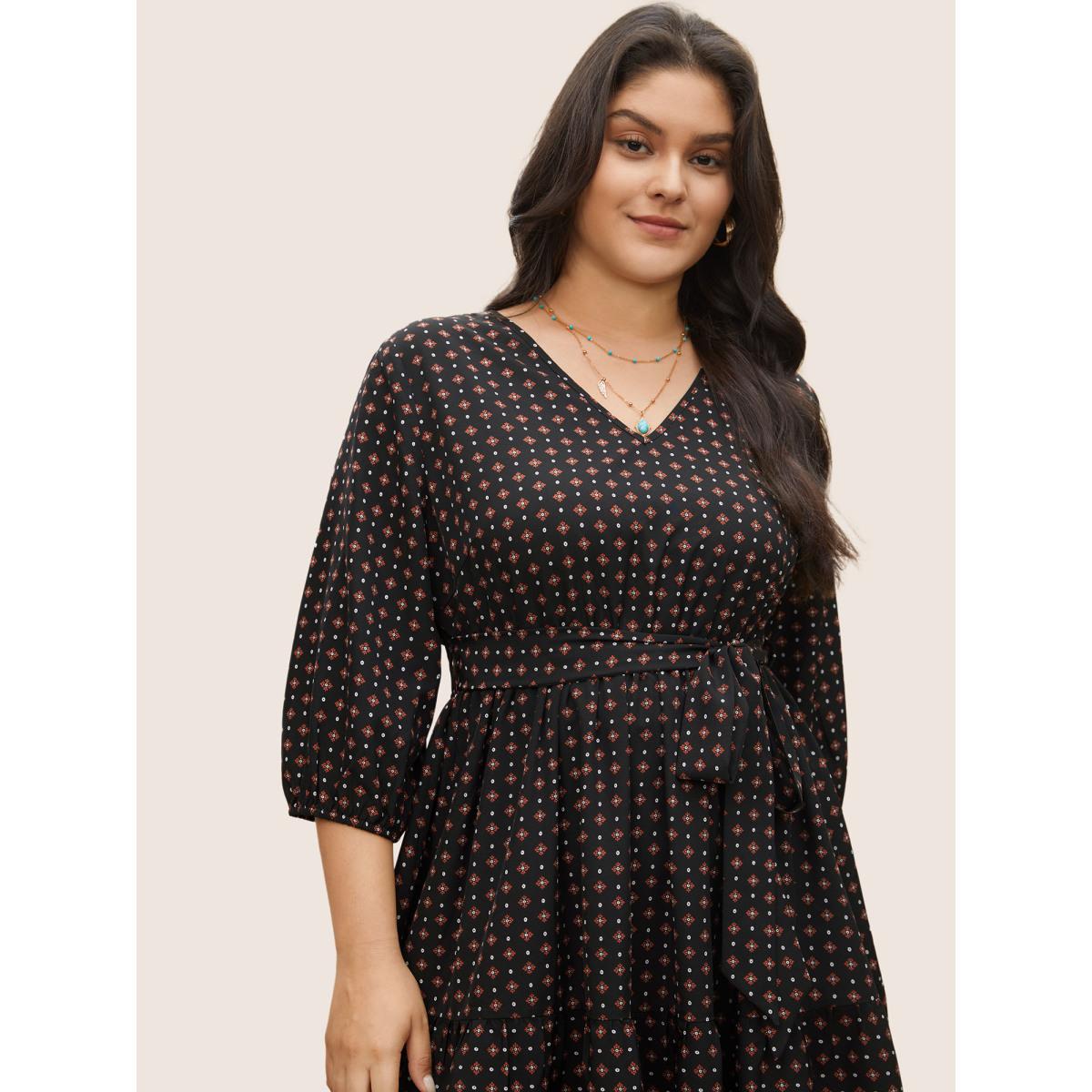 Plus Size Geometric V Neck Lantern Sleeve Dress Black Women Resort Non V-neck Elbow-length sleeve Curvy BloomChic 12/L