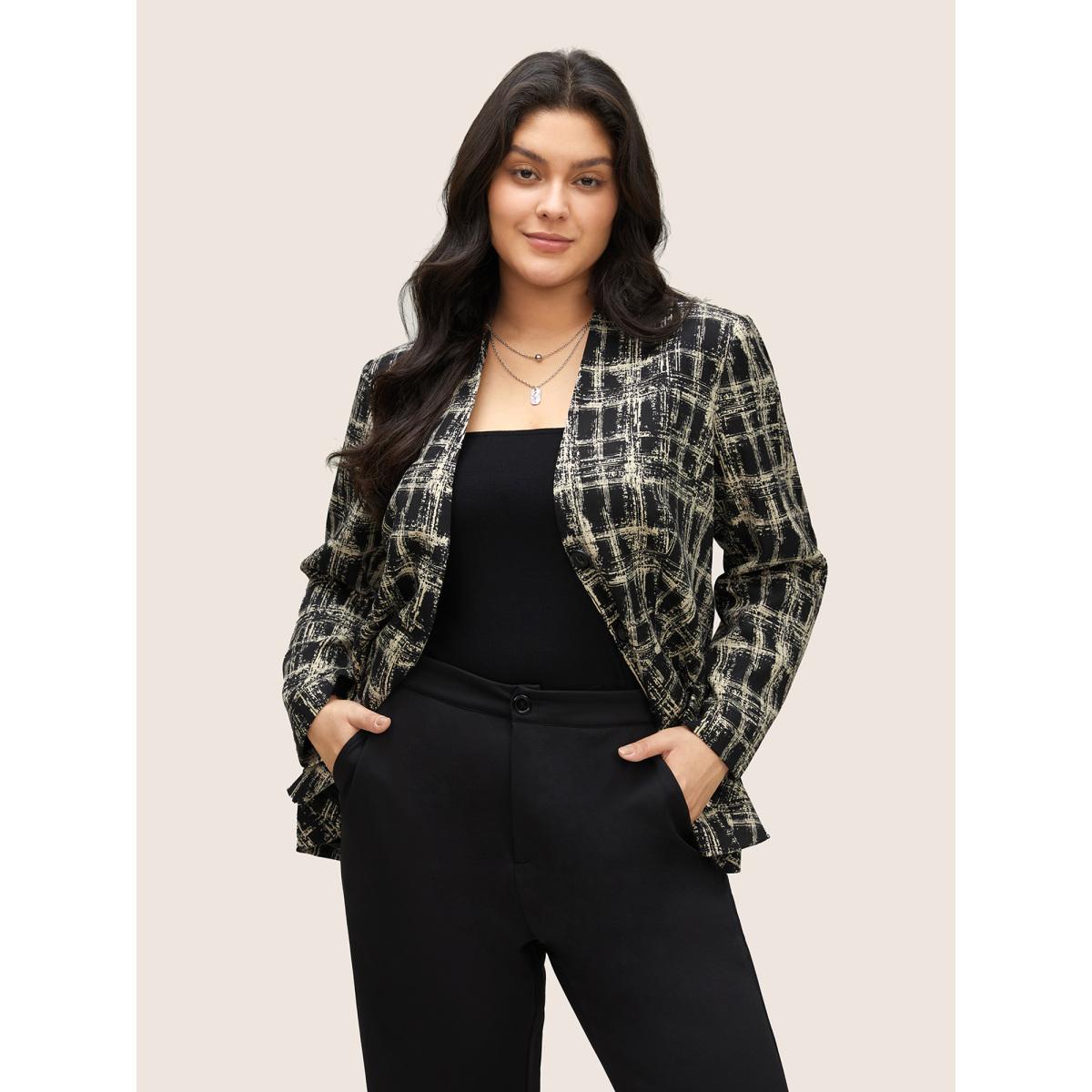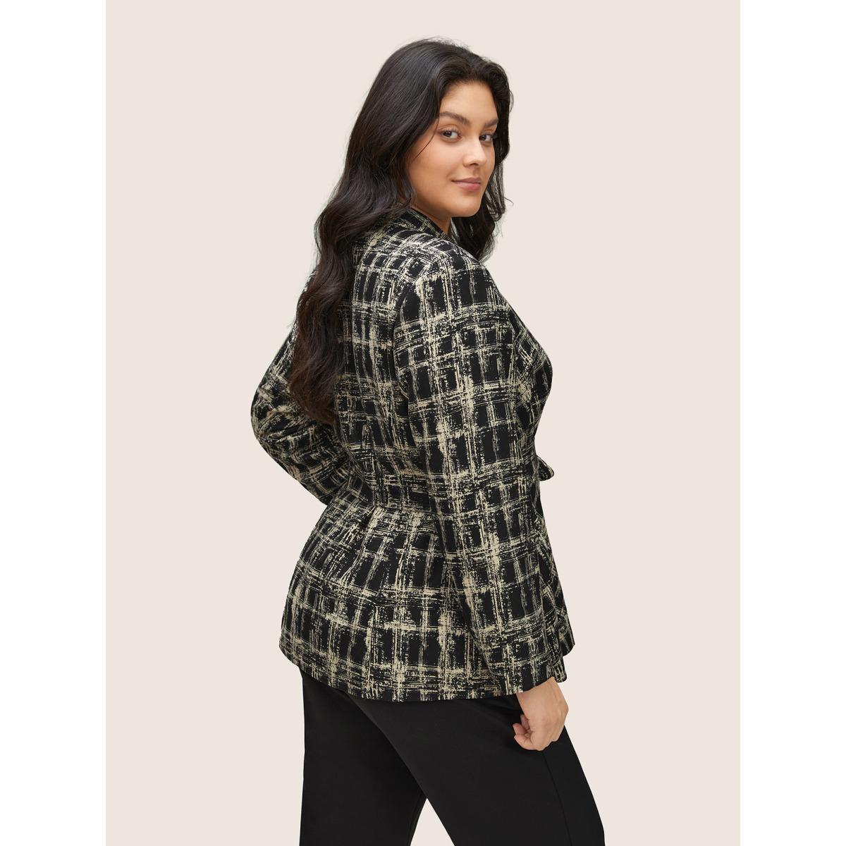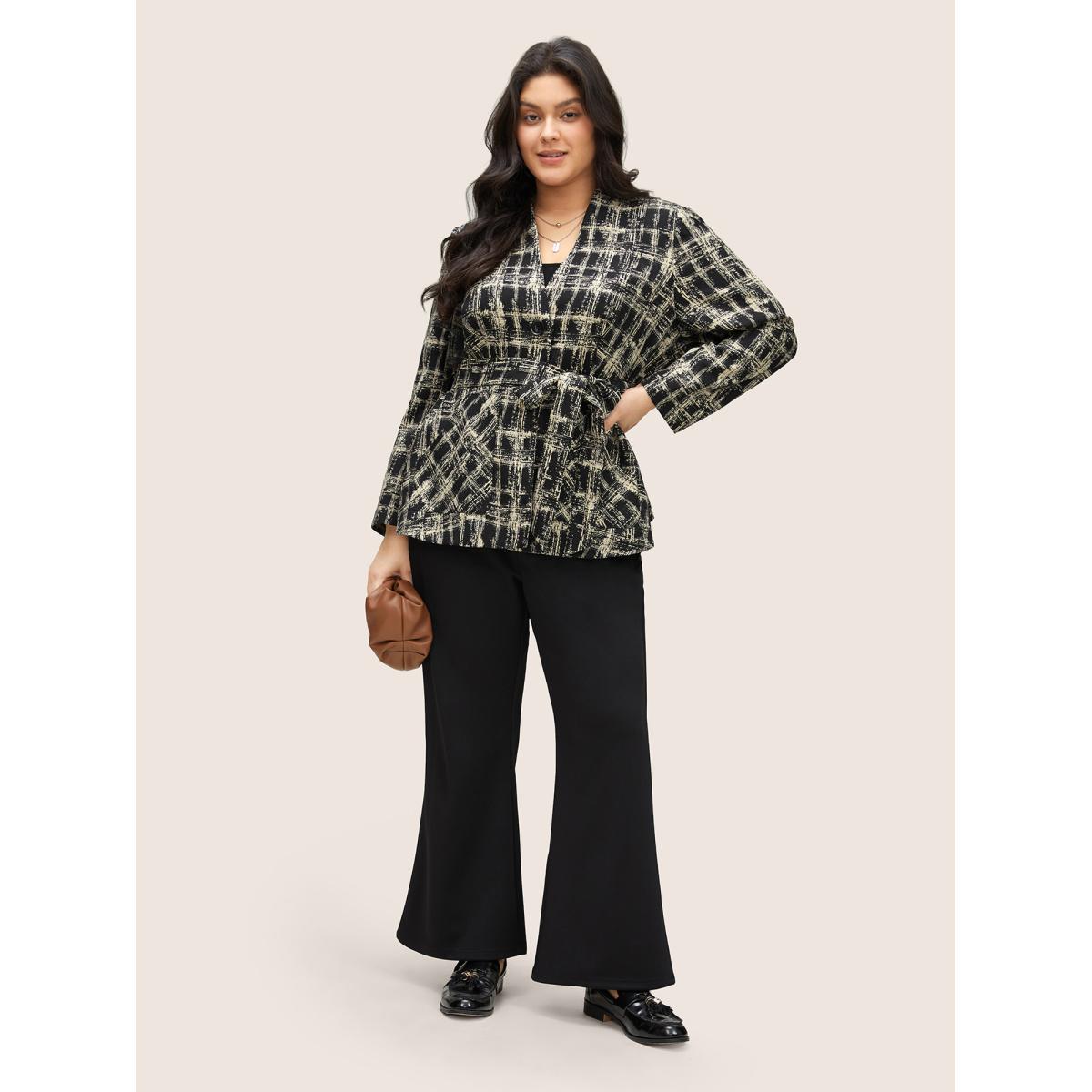 Plus Size Geometric Pocket Belted Lined Blazer Black Women Work Geometric Non Sleeve Long Sleeve V-neck 14-16/1X Patch pocket Belt At the Office Blazers BloomChic