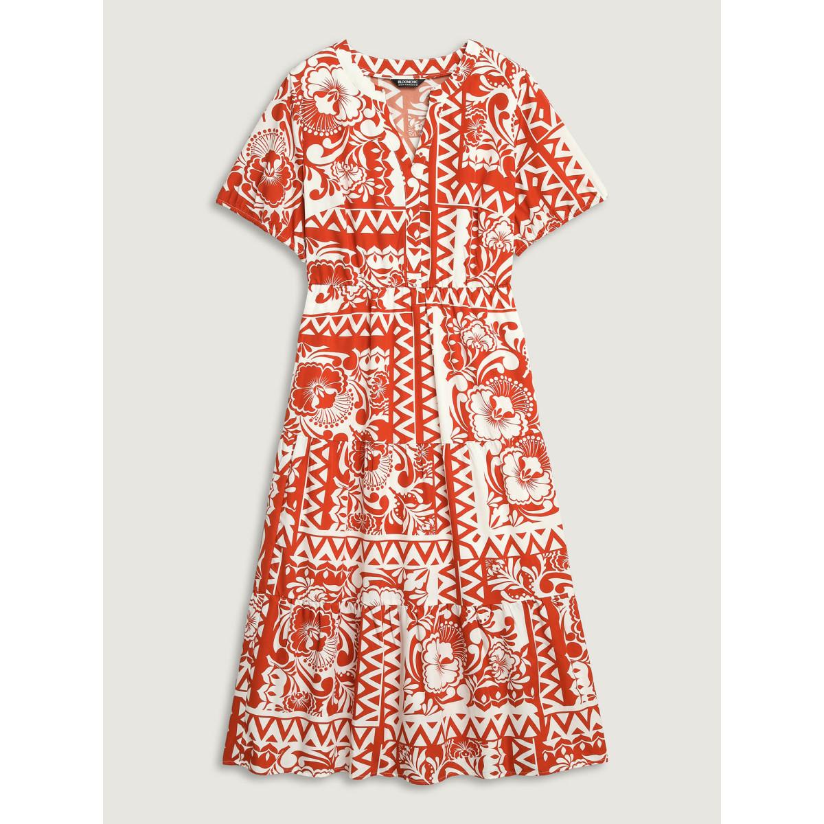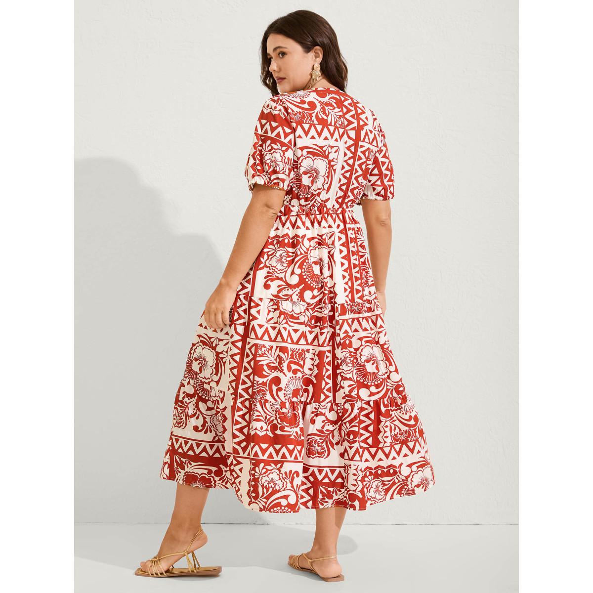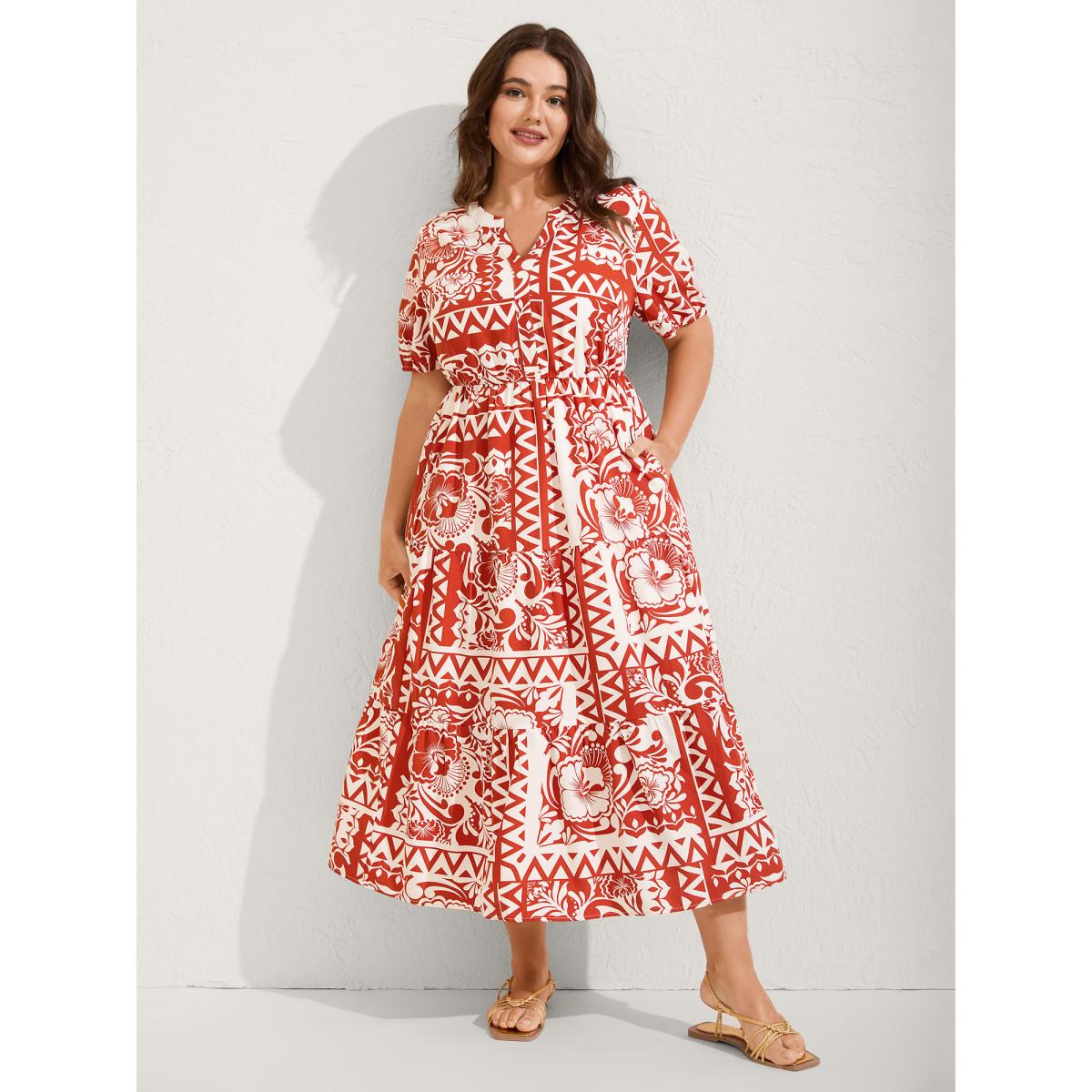Plus Size Geometric Shirred Button Up Ruffle Hem Dress RedViolet Women Vacation Printed Notched collar Elbow-length sleeve Curvy Midi Dress BloomChic 28/5X