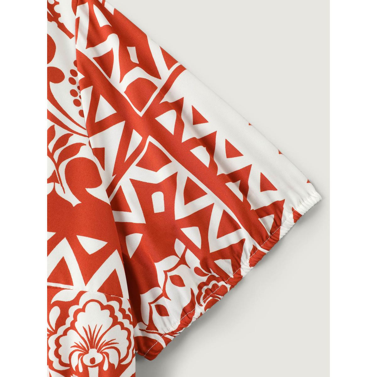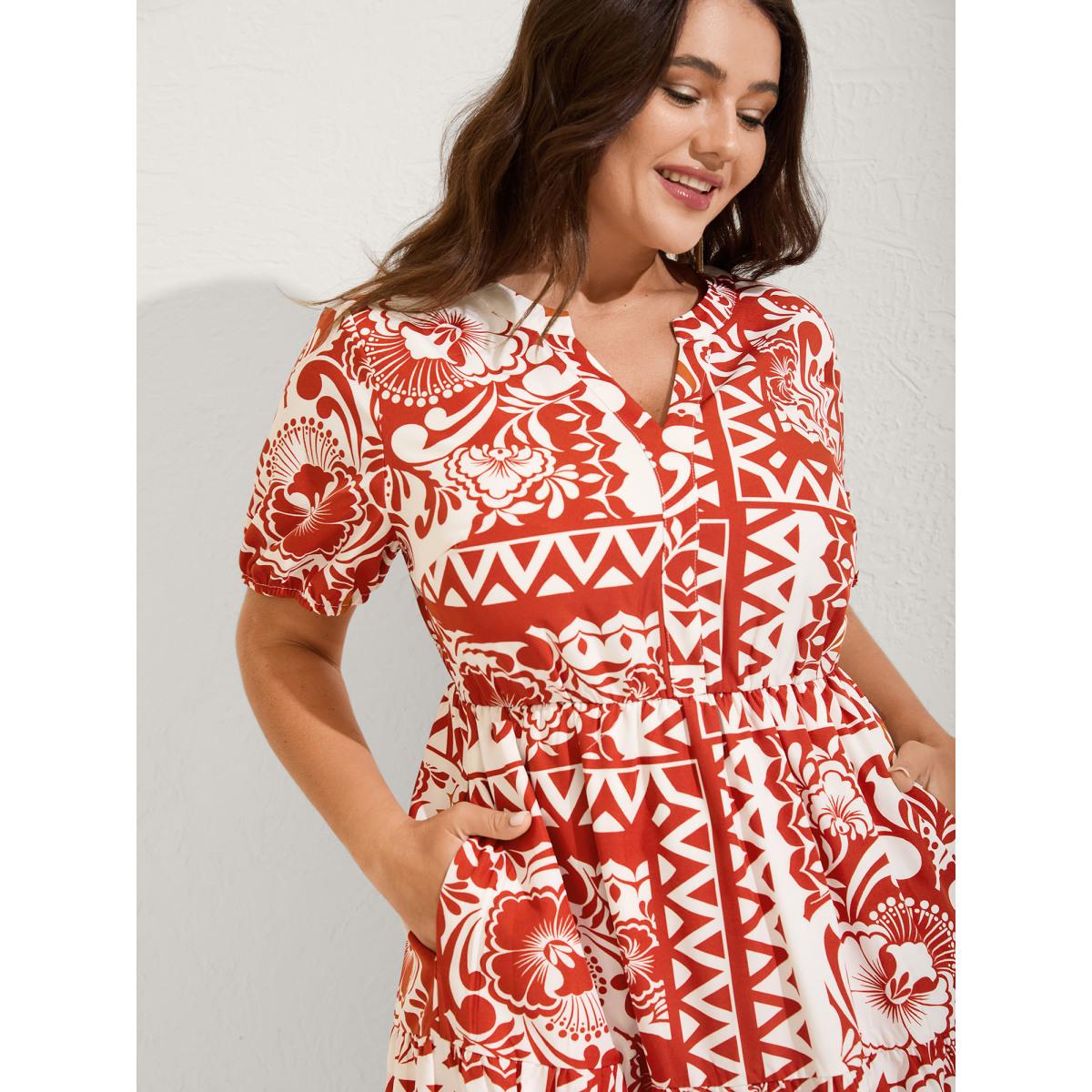Plus Size Geometric Surplice Neck Flutter Layered Hem Dress Rust Women Vacation Elastic cuffs Overlap Collar Elbow-length sleeve Curvy Midi Dress BloomChic 26/4X