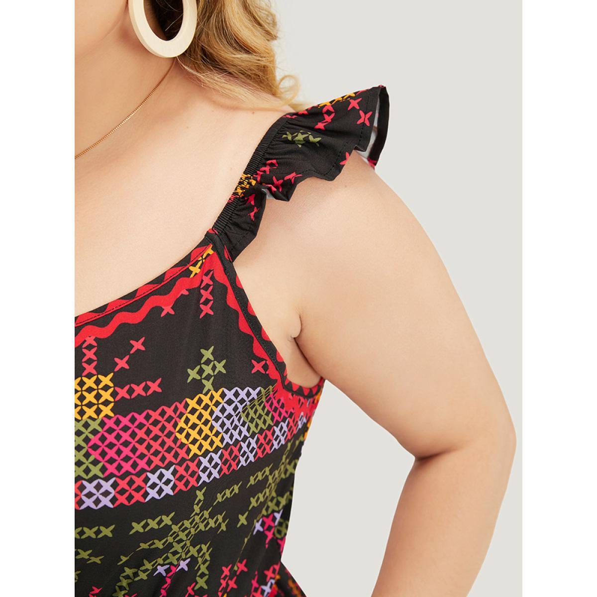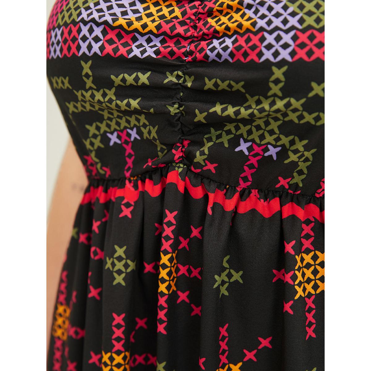 Plus Size Geometric Print Ruffle Trim Pocket Ruched Detail Cami Dress Raspberry Women Vacation Ruched V-neck Sleeveless Curvy Midi Dress BloomChic 22-24/3X
