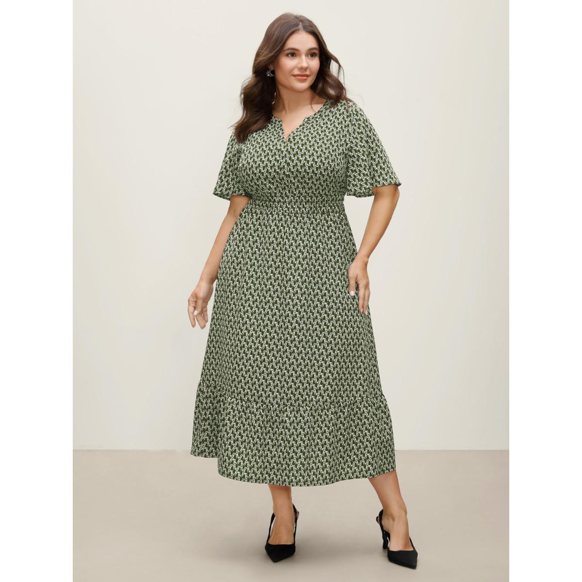 Plus Size Geometric Print Waist-Cinched Tiered Midi Dress ArmyGreen Women Office Elastic Waist Flat collar with V-notch Short sleeve Curvy BloomChic 22-24/3X