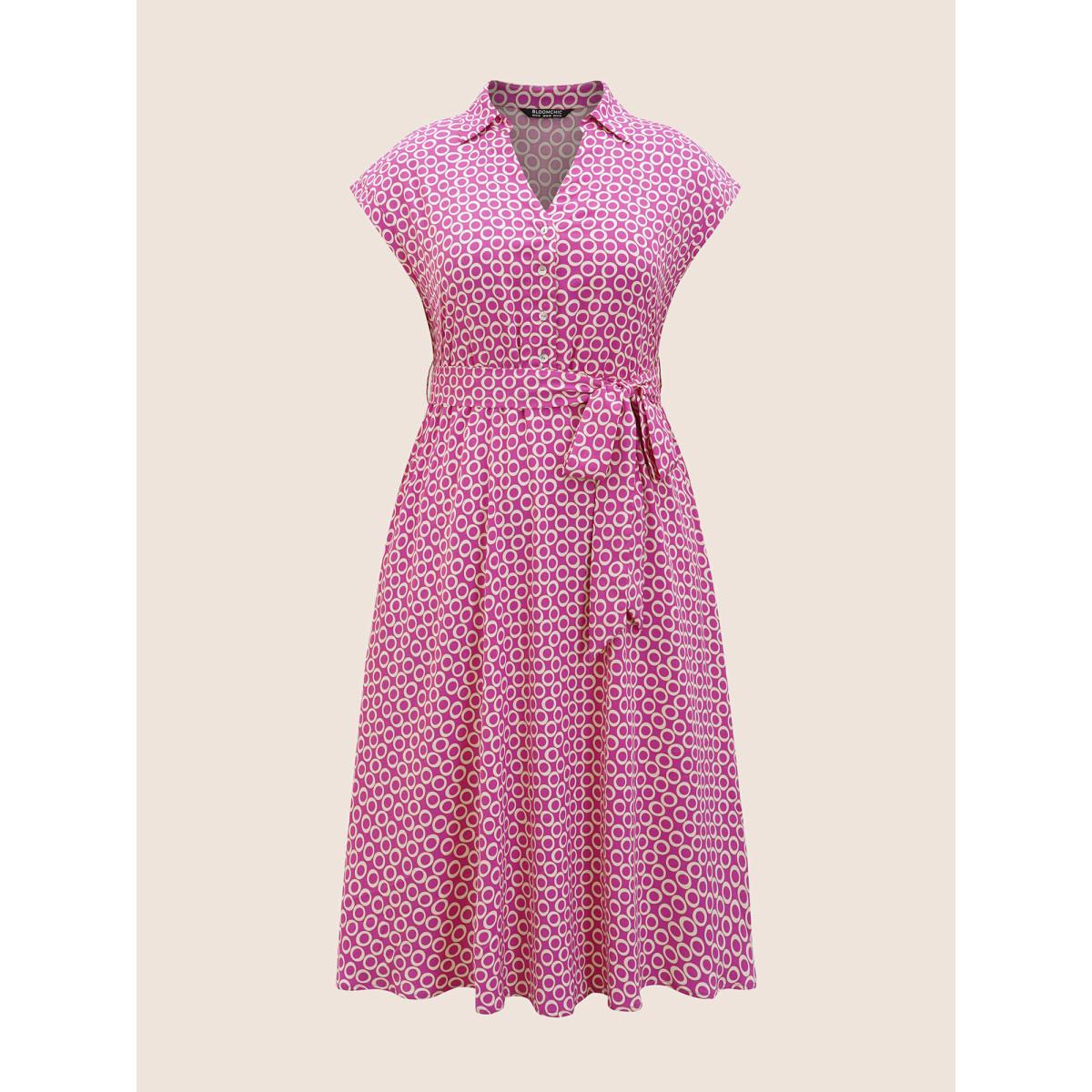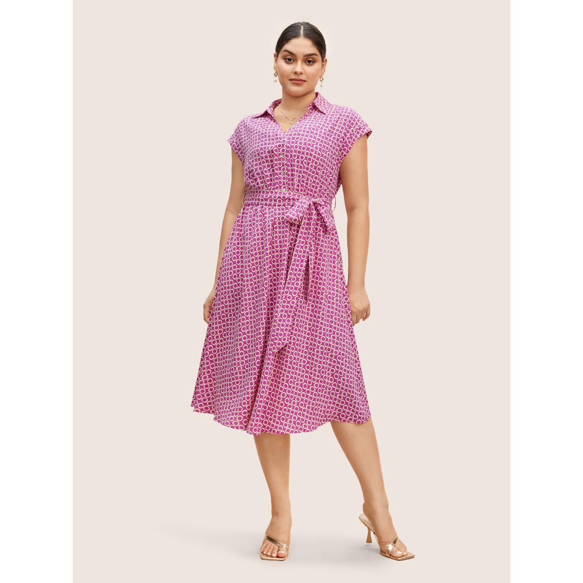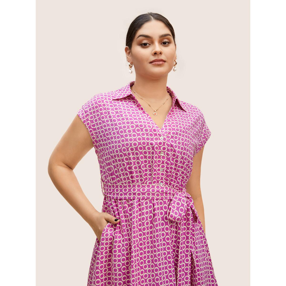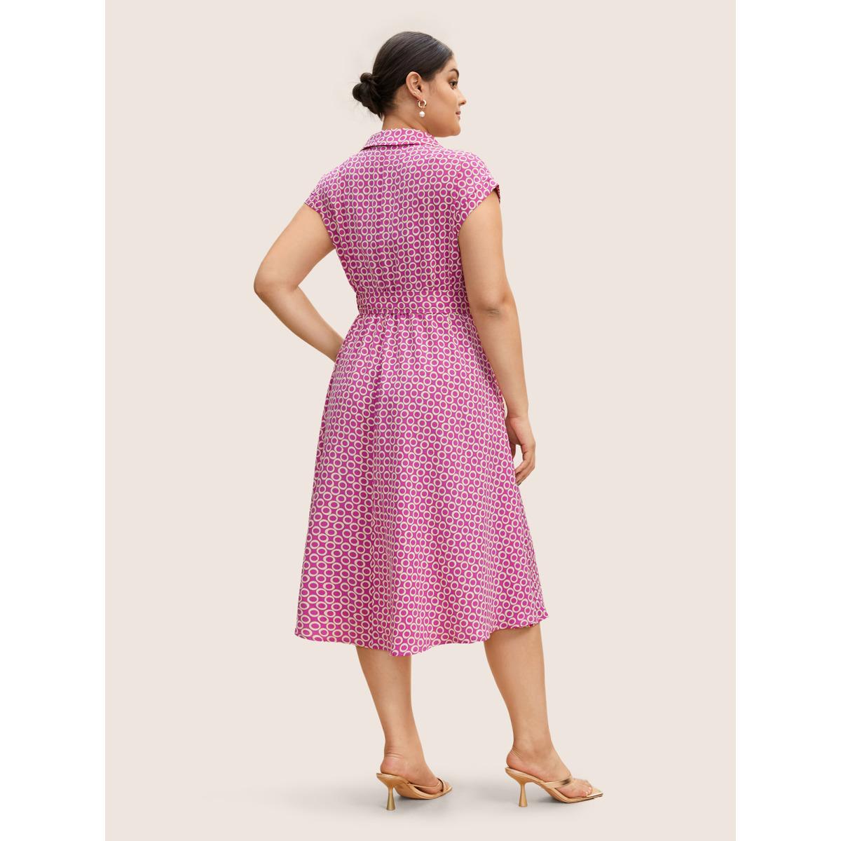 Plus Size Geometric Shirt Collar Cap Sleeve Midi Dress RedViolet Women Work From Home Belted Shirt collar Cap Sleeve Curvy BloomChic 14-16/1X