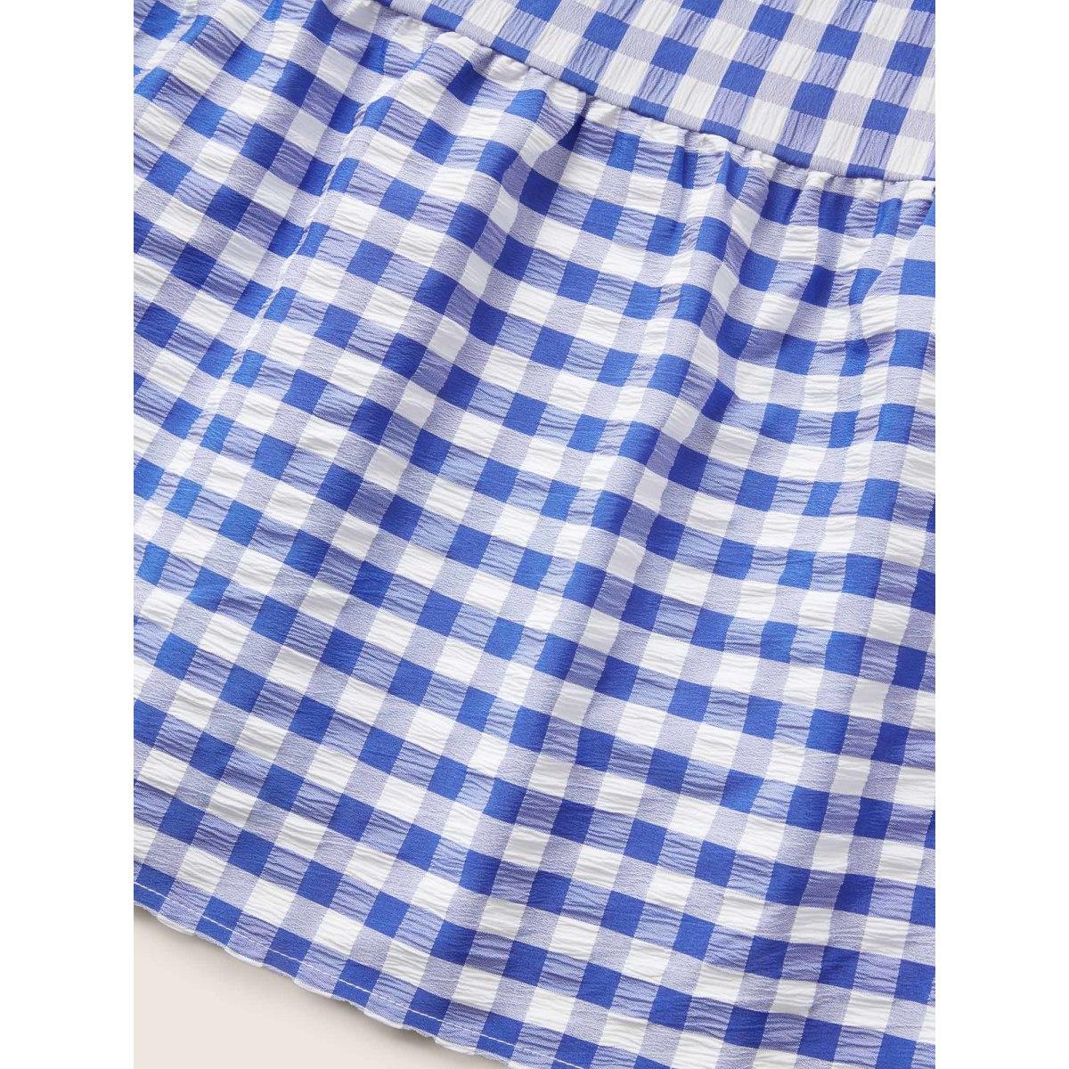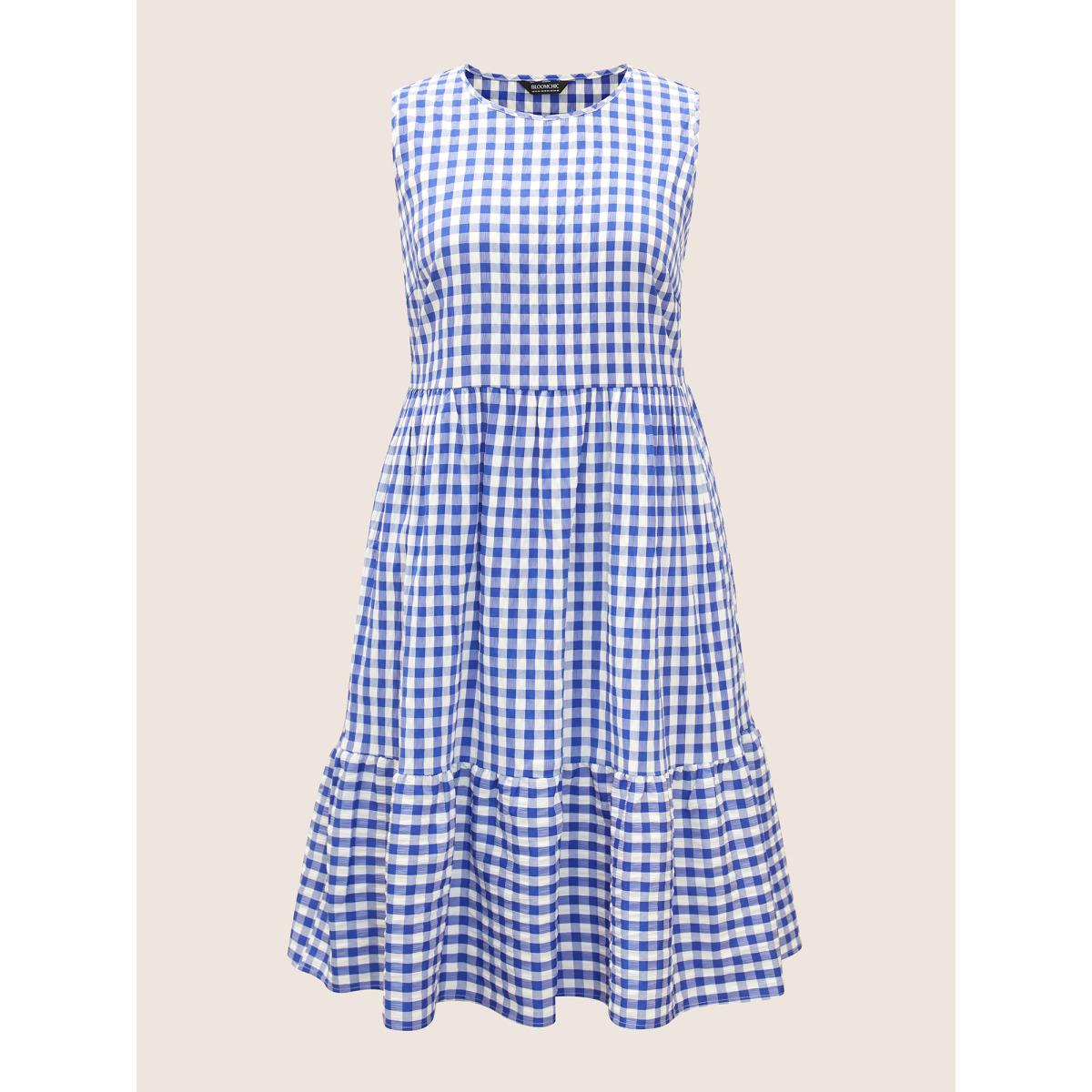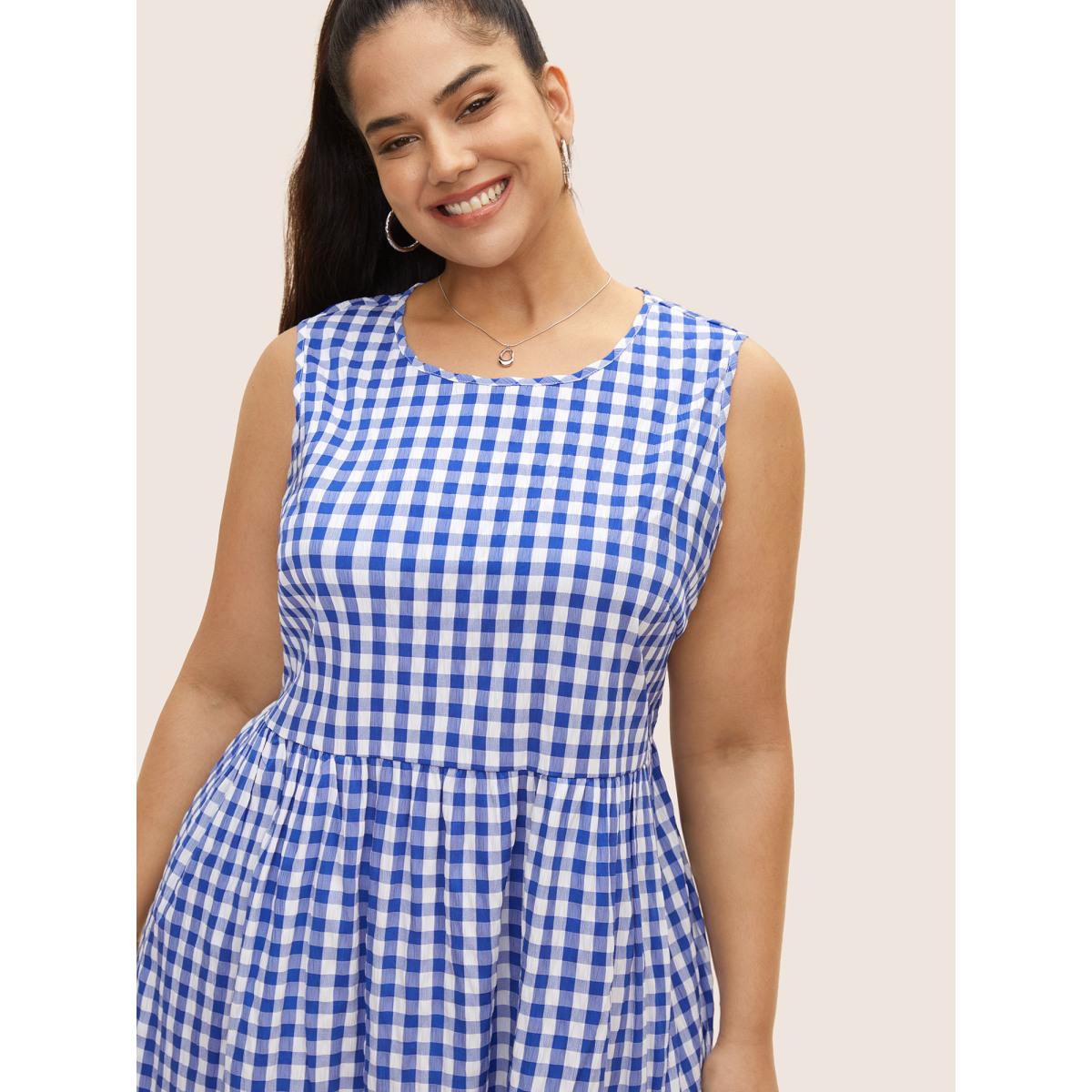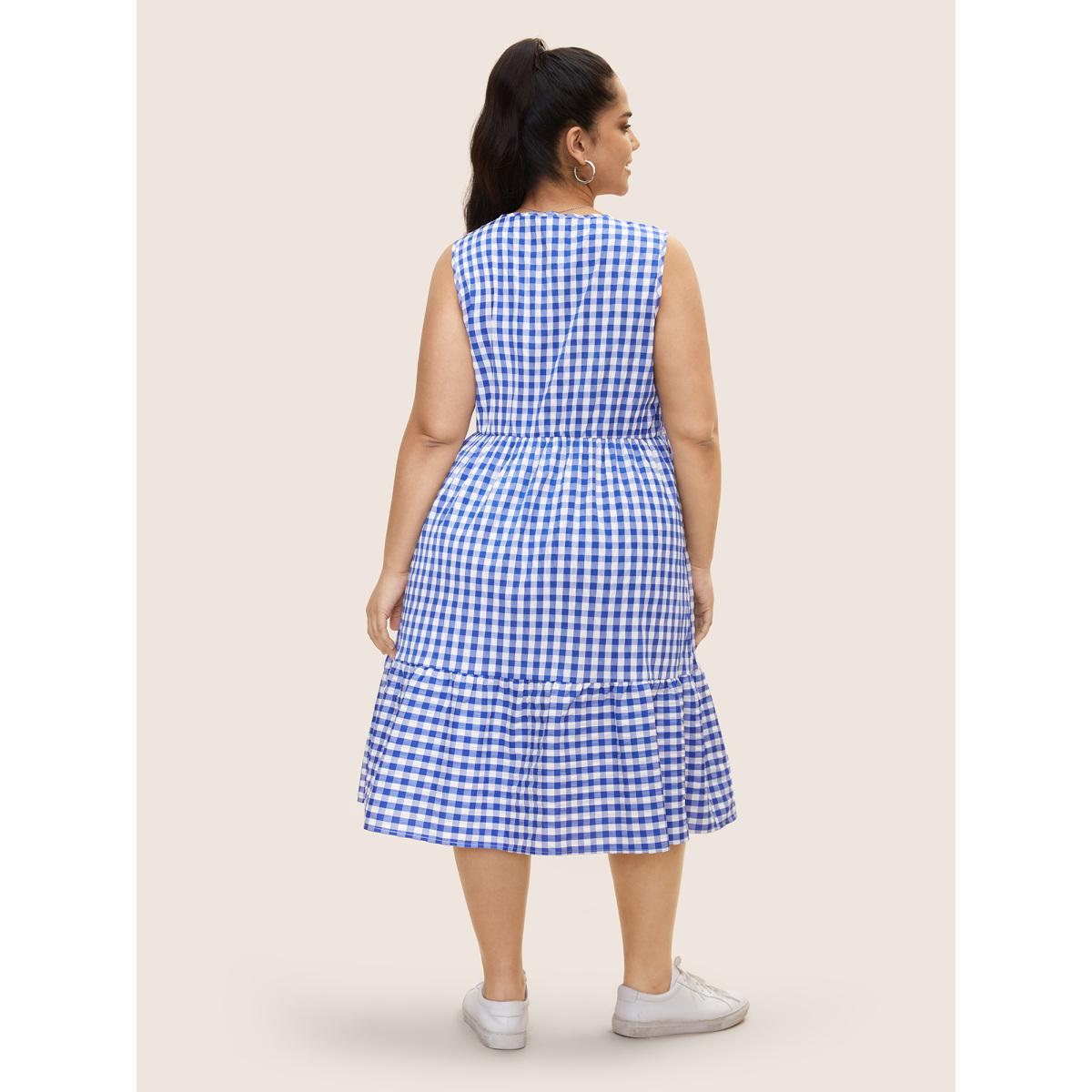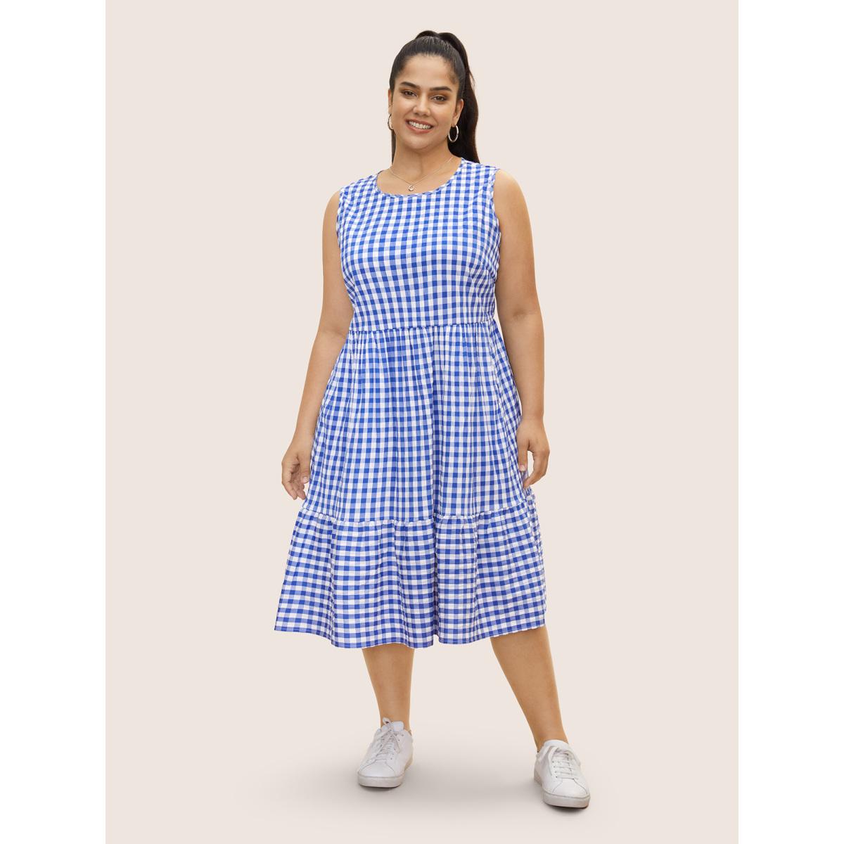 Plus Size Gingham Ruffle Layered Hem Tank Midi Dress Brightblue Women Casual Gathered Round Neck Sleeveless Curvy BloomChic 10/M