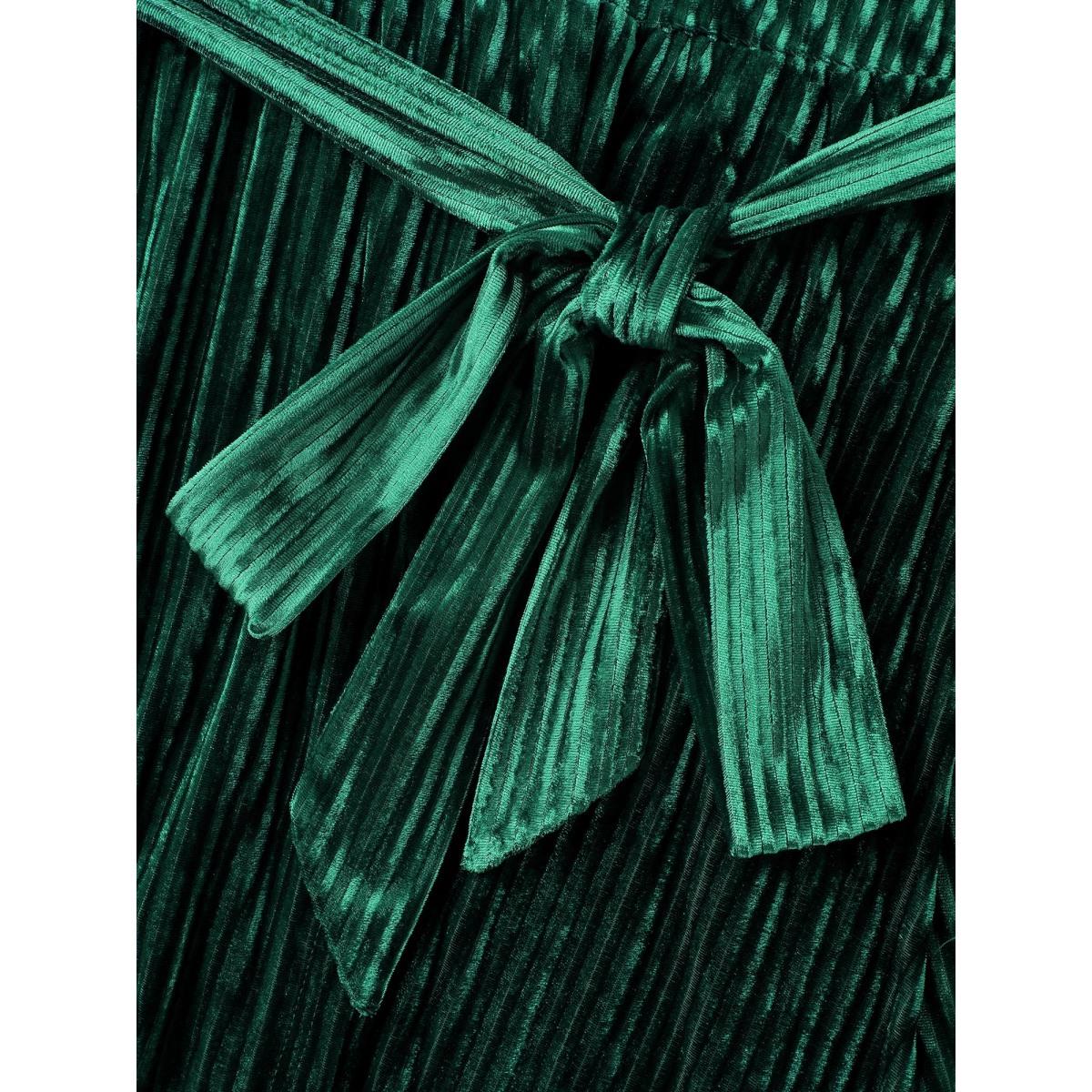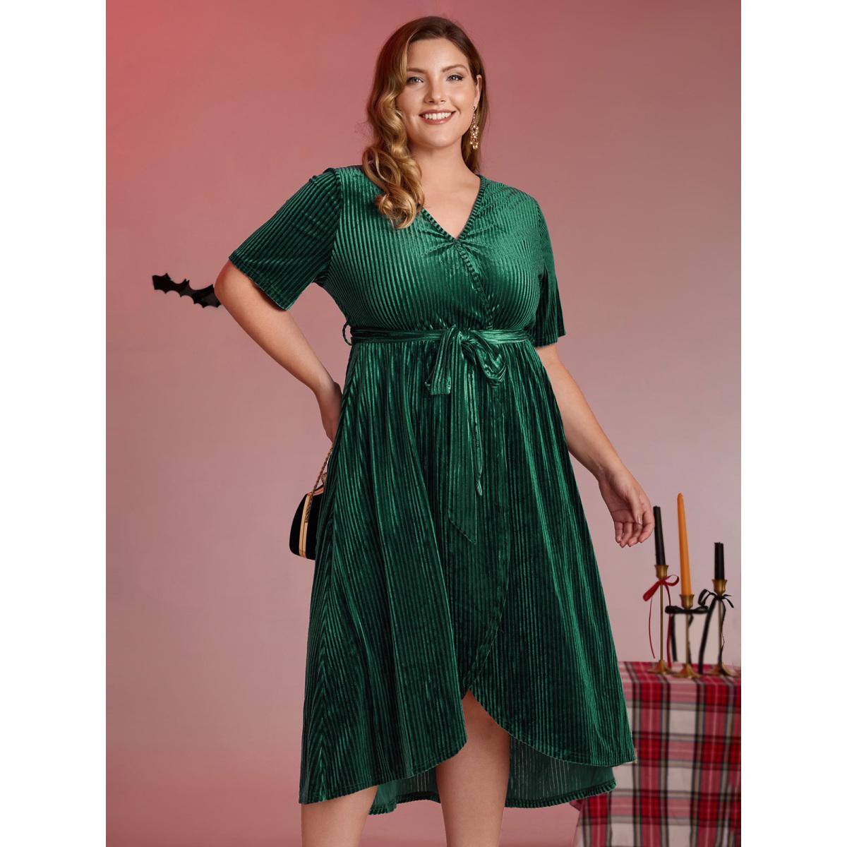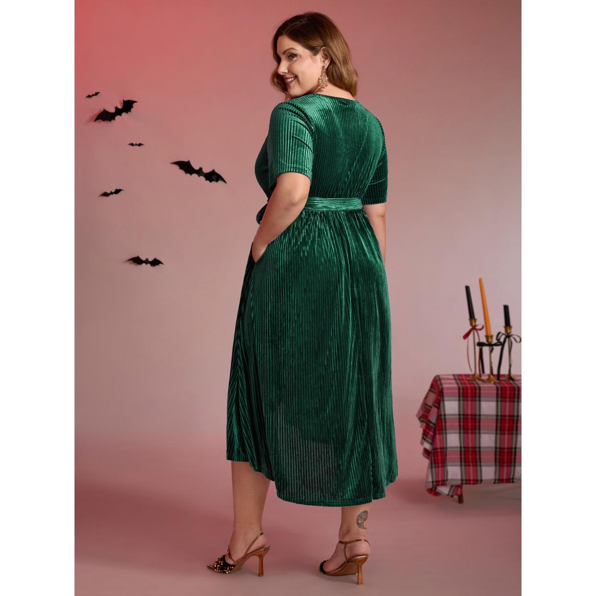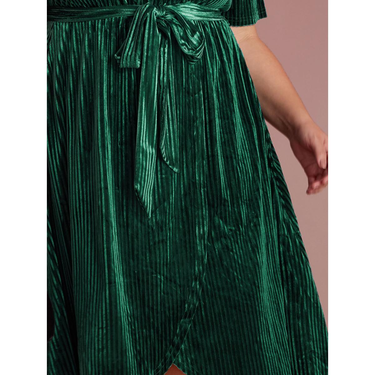 Plus Size Glossy Textured Velvet Wrap Tied Midi Dress DarkGreen Women Party&Cocktail Overlapping Overlap Collar Short sleeve Curvy BloomChic 18-20/2X