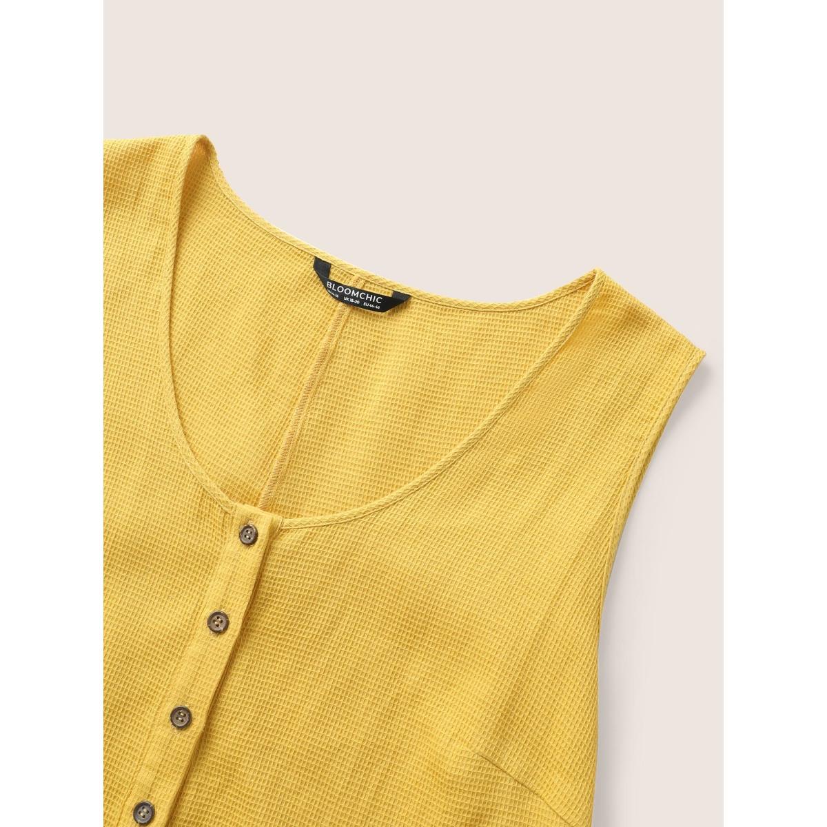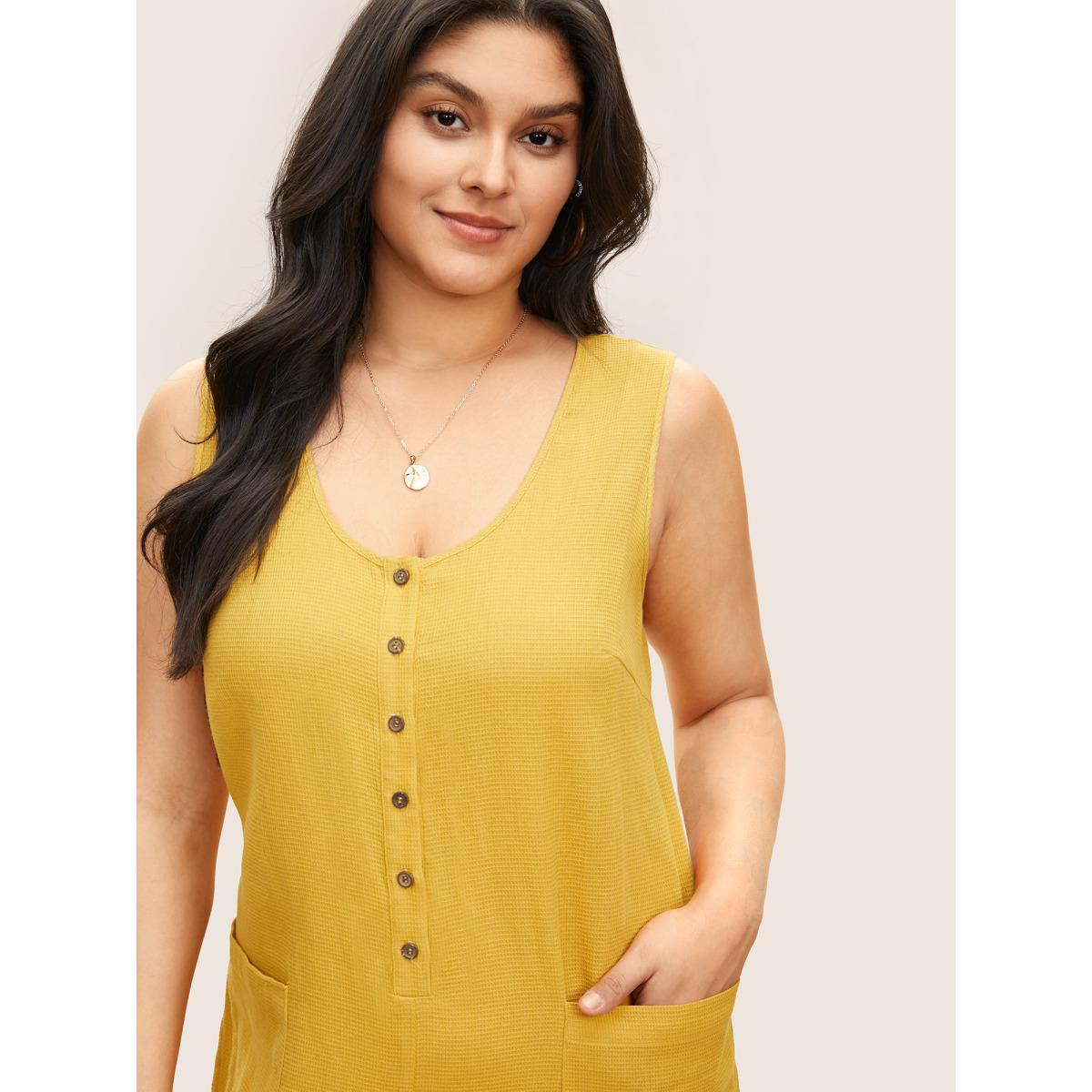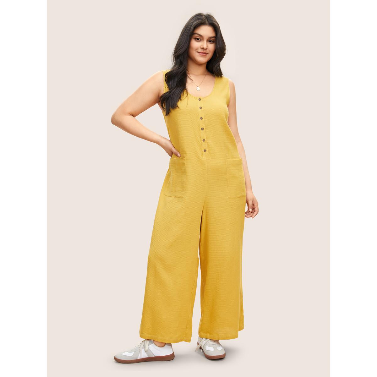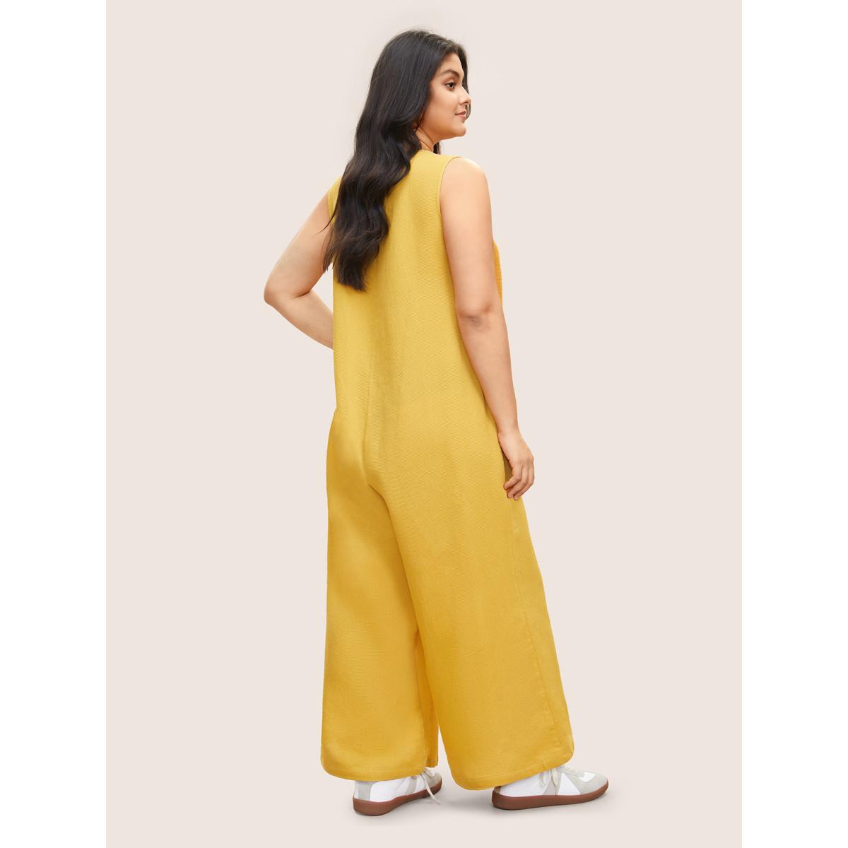 Plus Size Gold Solid Textured Scoop Neck Patched Pocket Jumpsuit Women Casual Sleeveless Everyday Loose Jumpsuits BloomChic 12/L