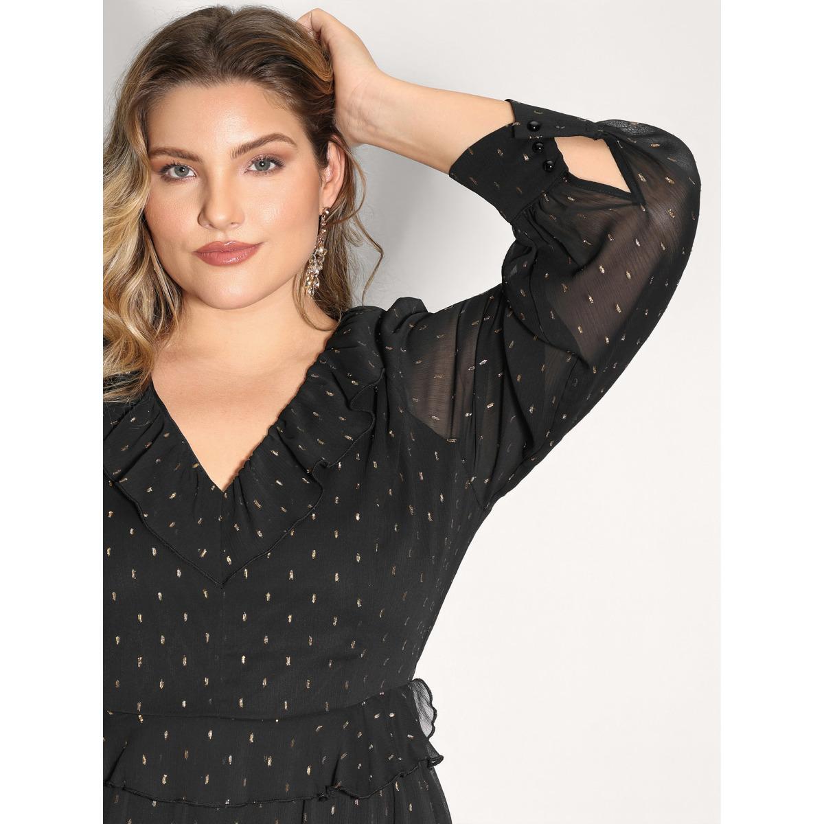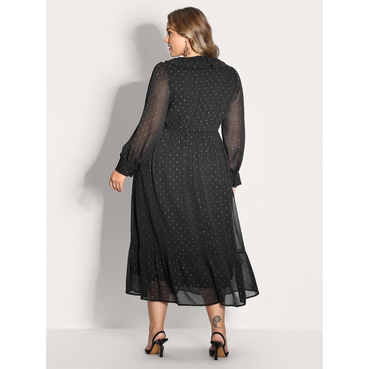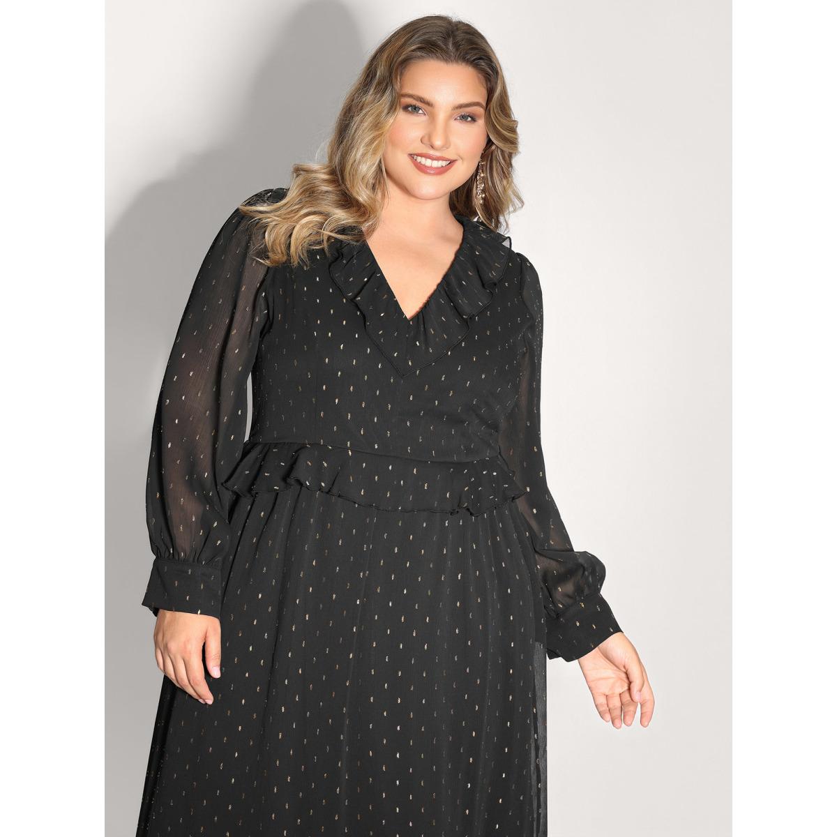 Plus Size Gold Stamp Ruffled Neck Maxi Dress Black Women Party&Cocktail V-neck Extra Long Sleeve Curvy BloomChic 14-16/1X