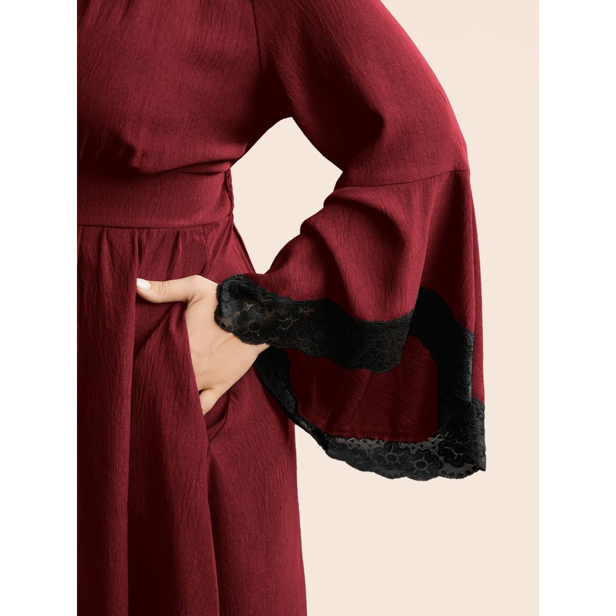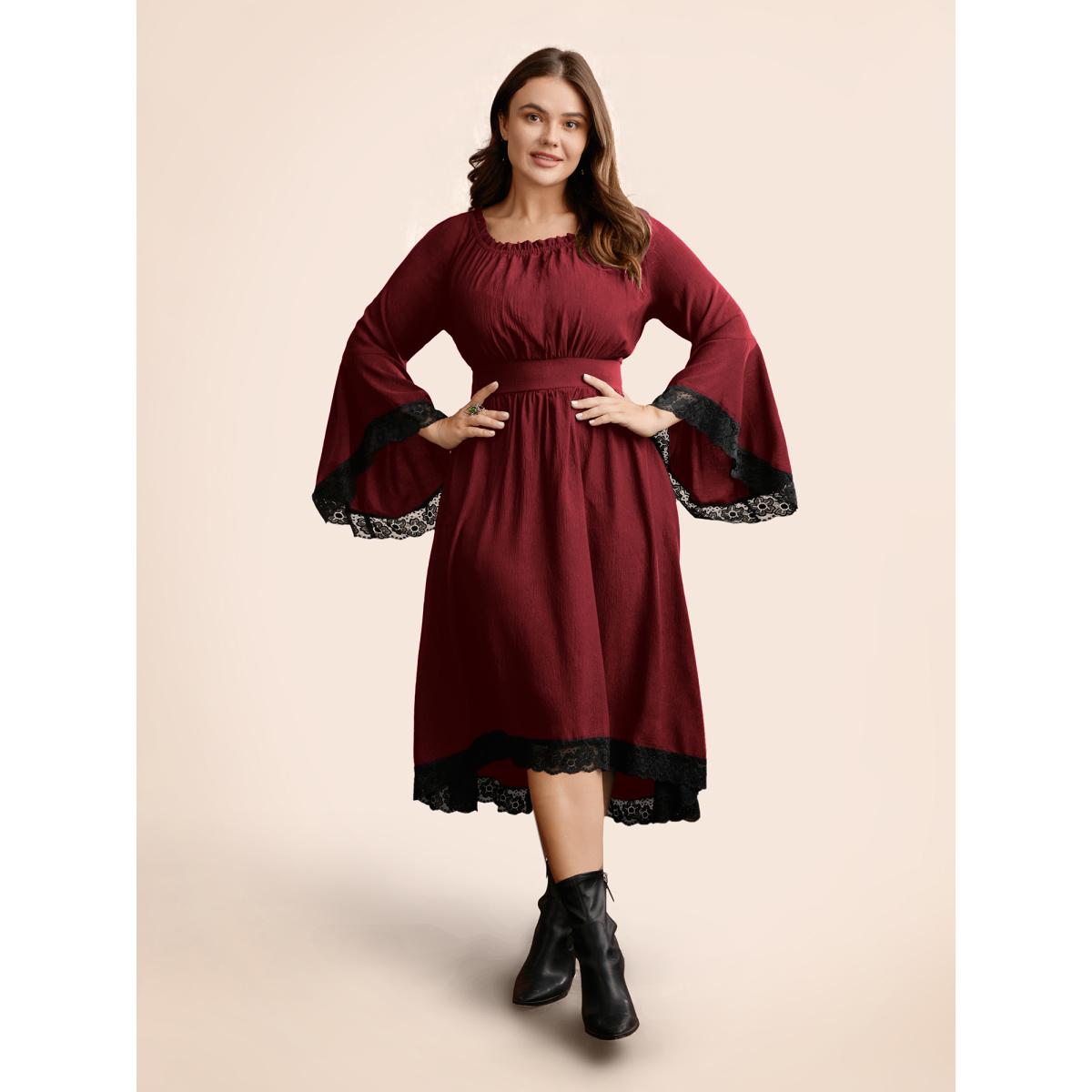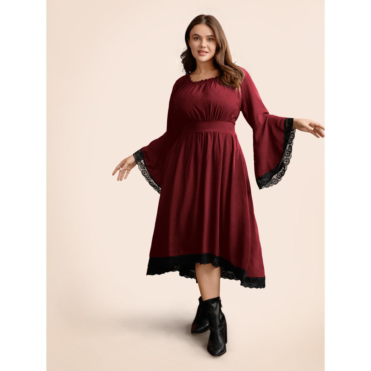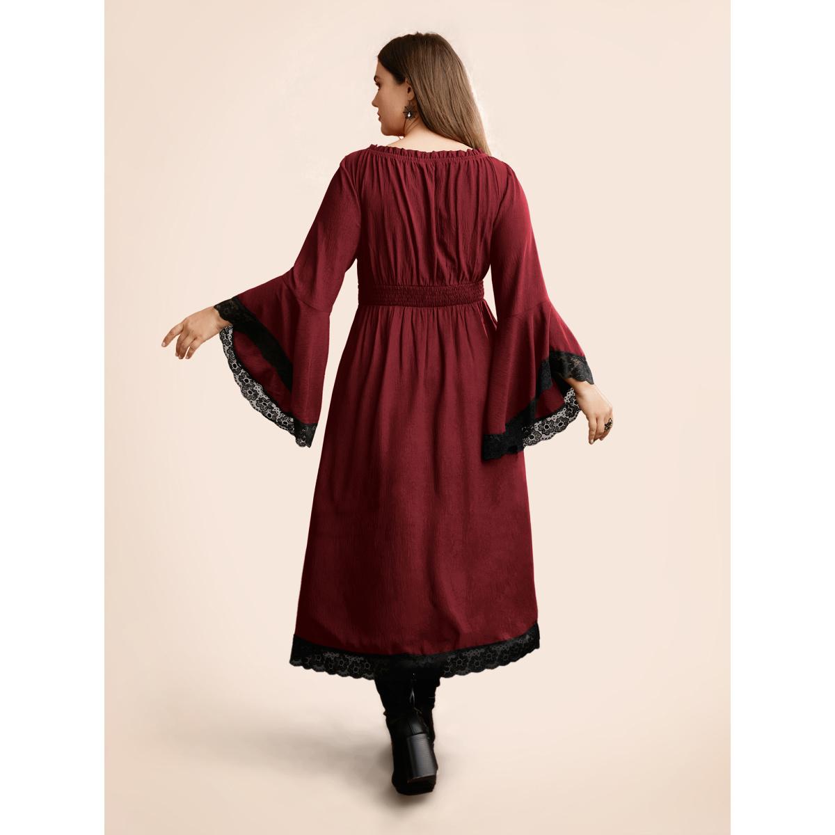 Plus Size Gothic Inspired Lotus Sleeves Midi Dress Deepred Women Cocktail Woven ribbon&lace trim Party Curvy Bloomchic 26/4X