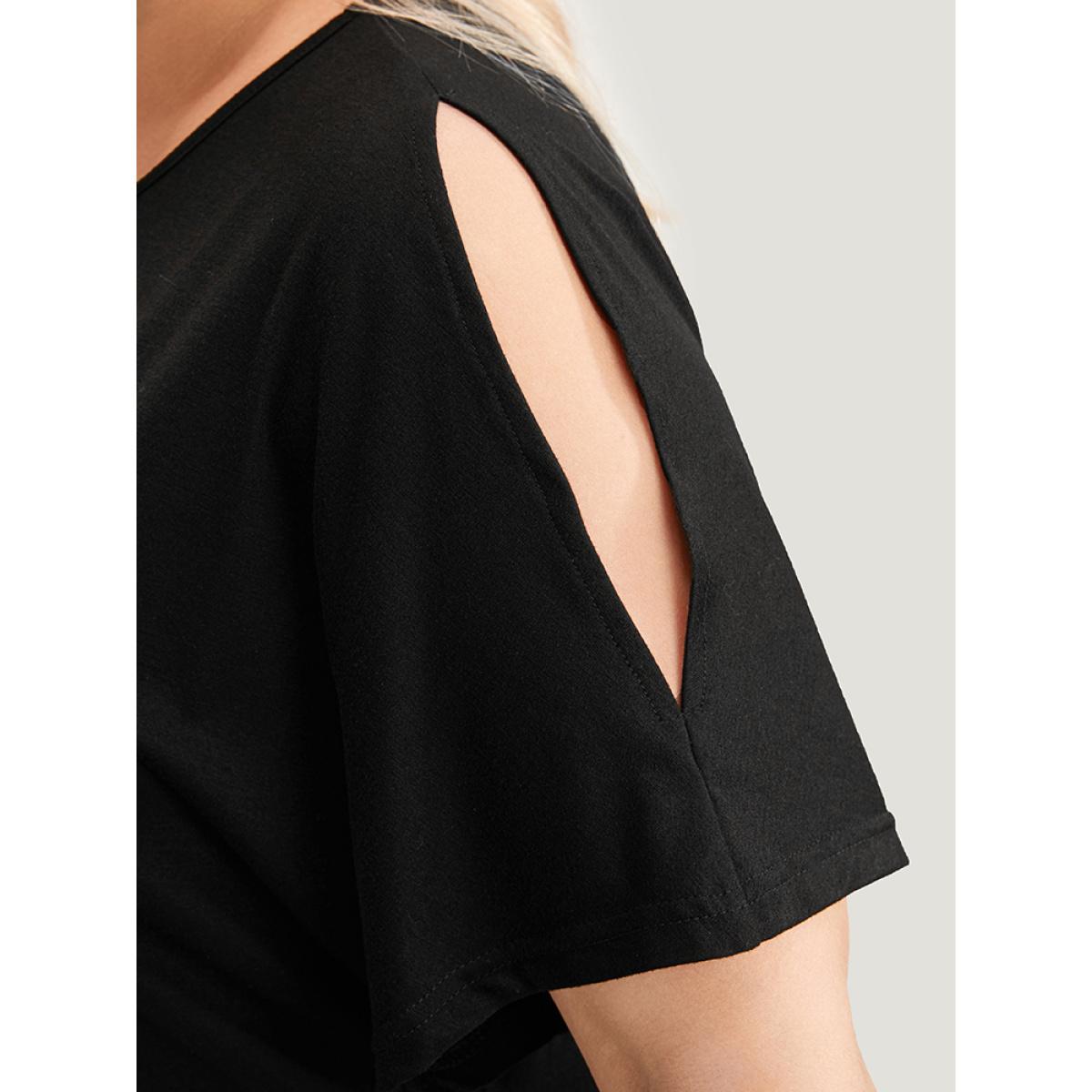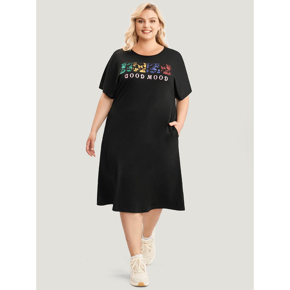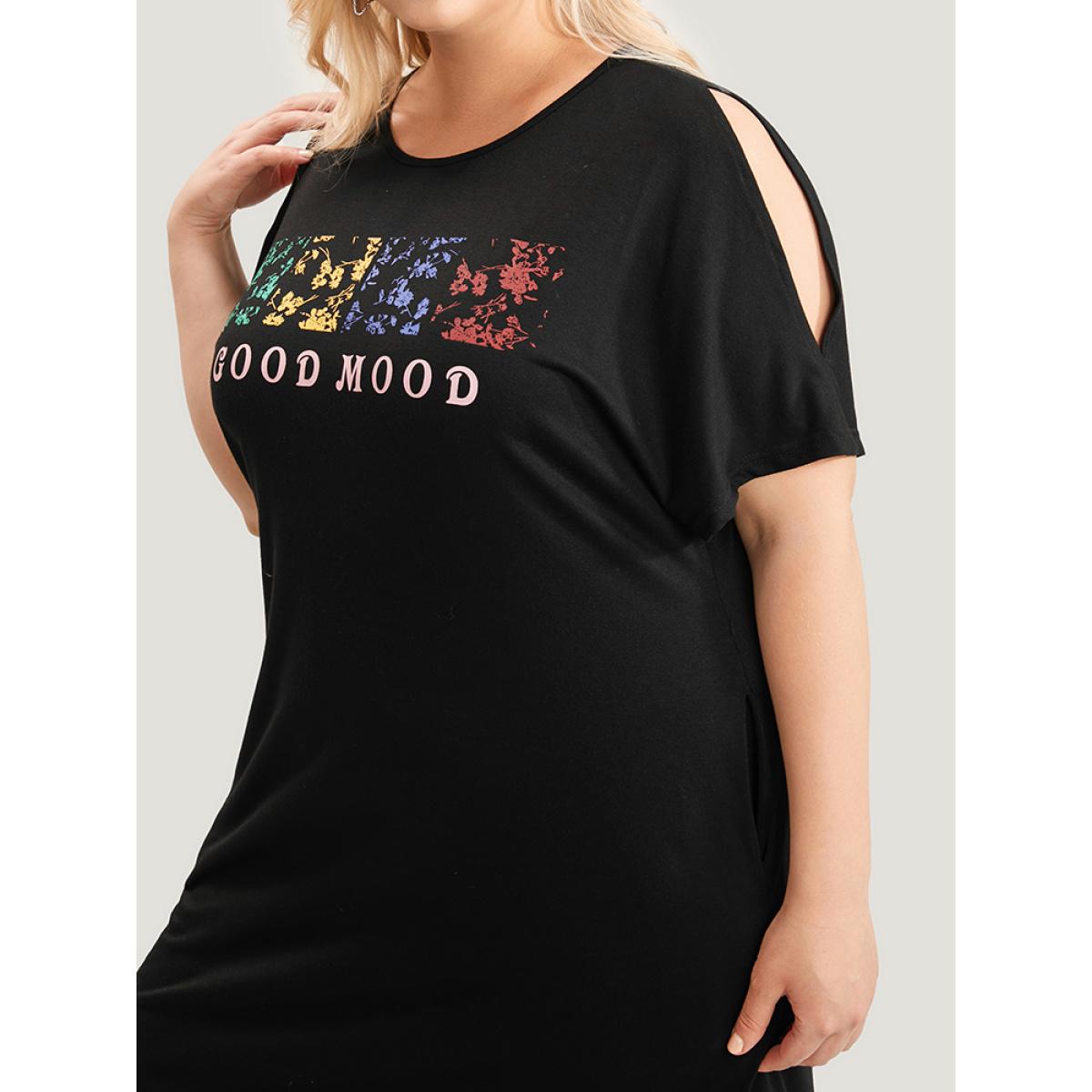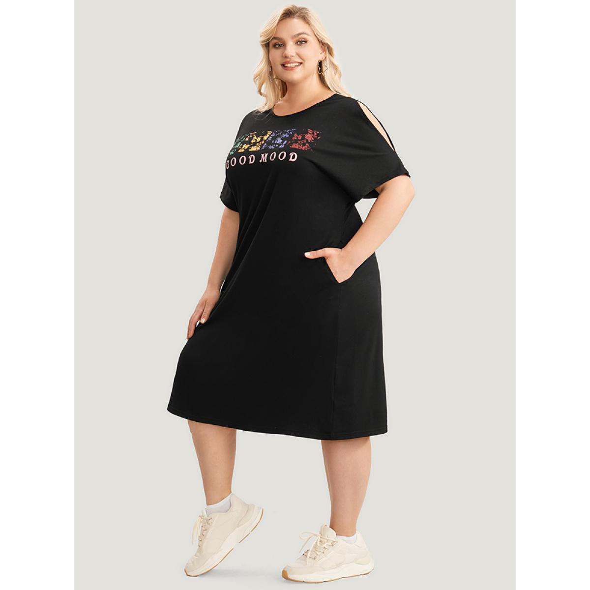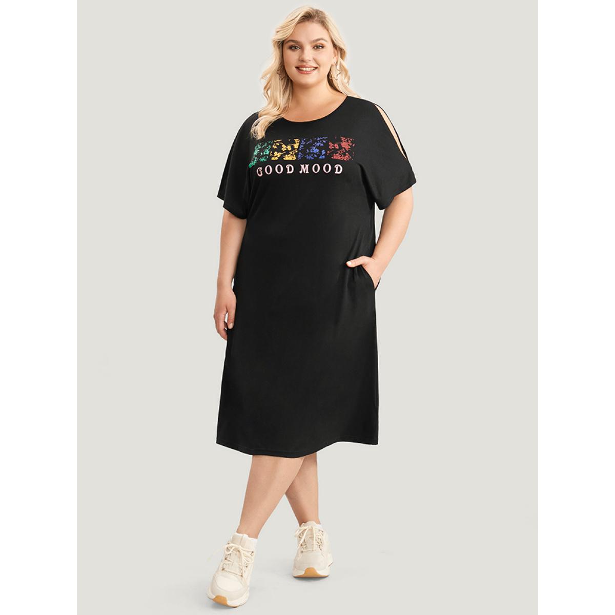 Plus Size Graphic & Letter Print Dolman Sleeve Pocket Cold Shoulder Tee Dress Black Women Casual Printed Curvy Knee Dress BloomChic 30/6X