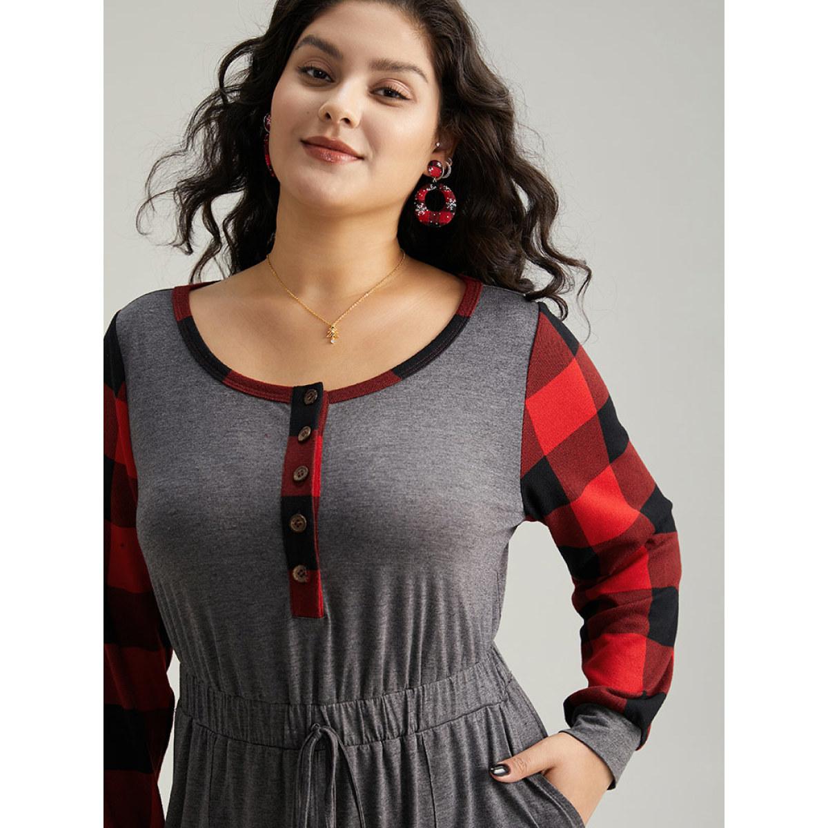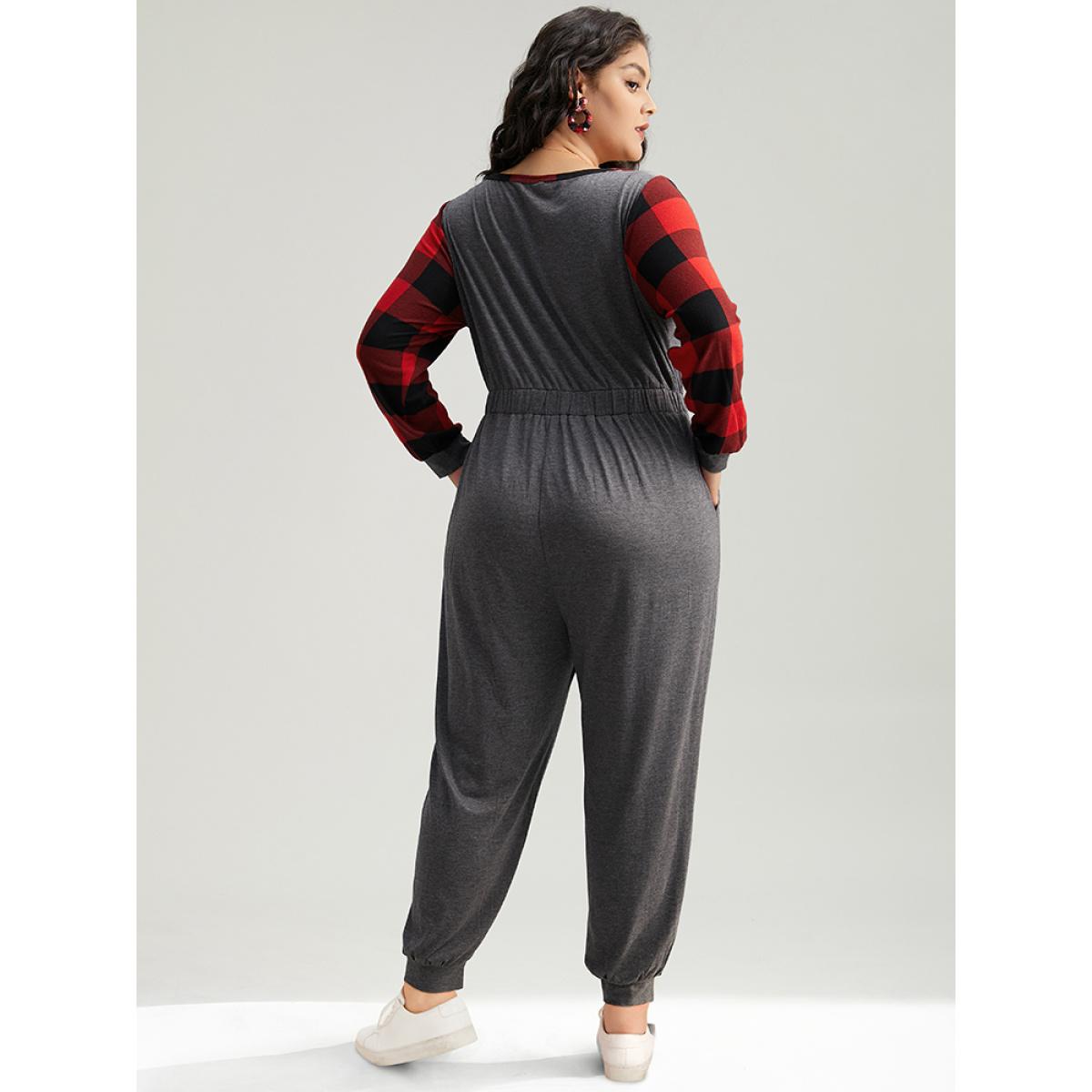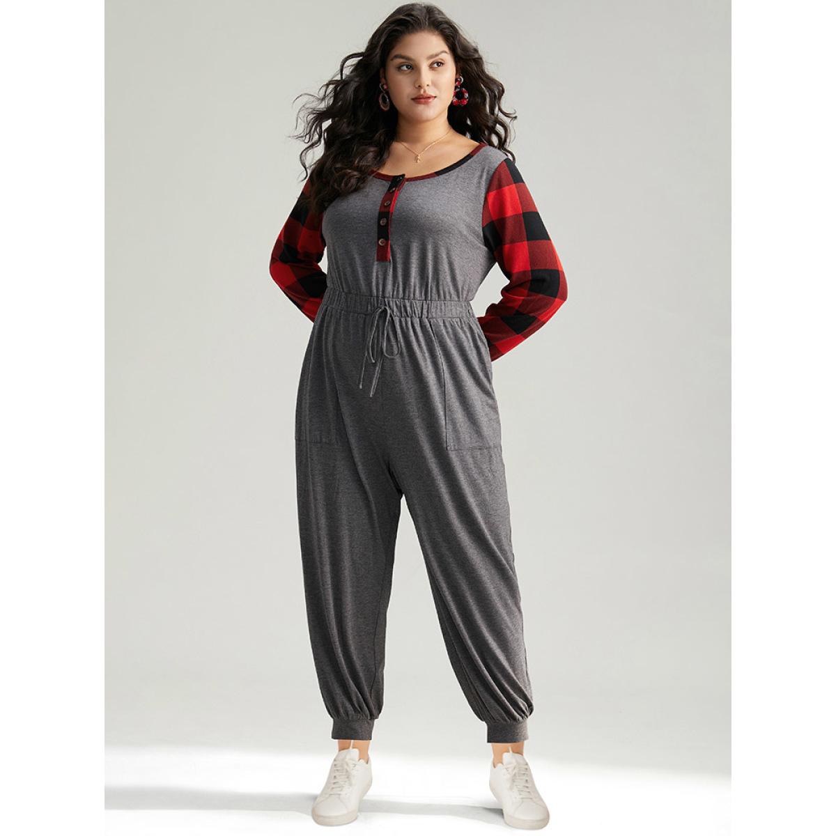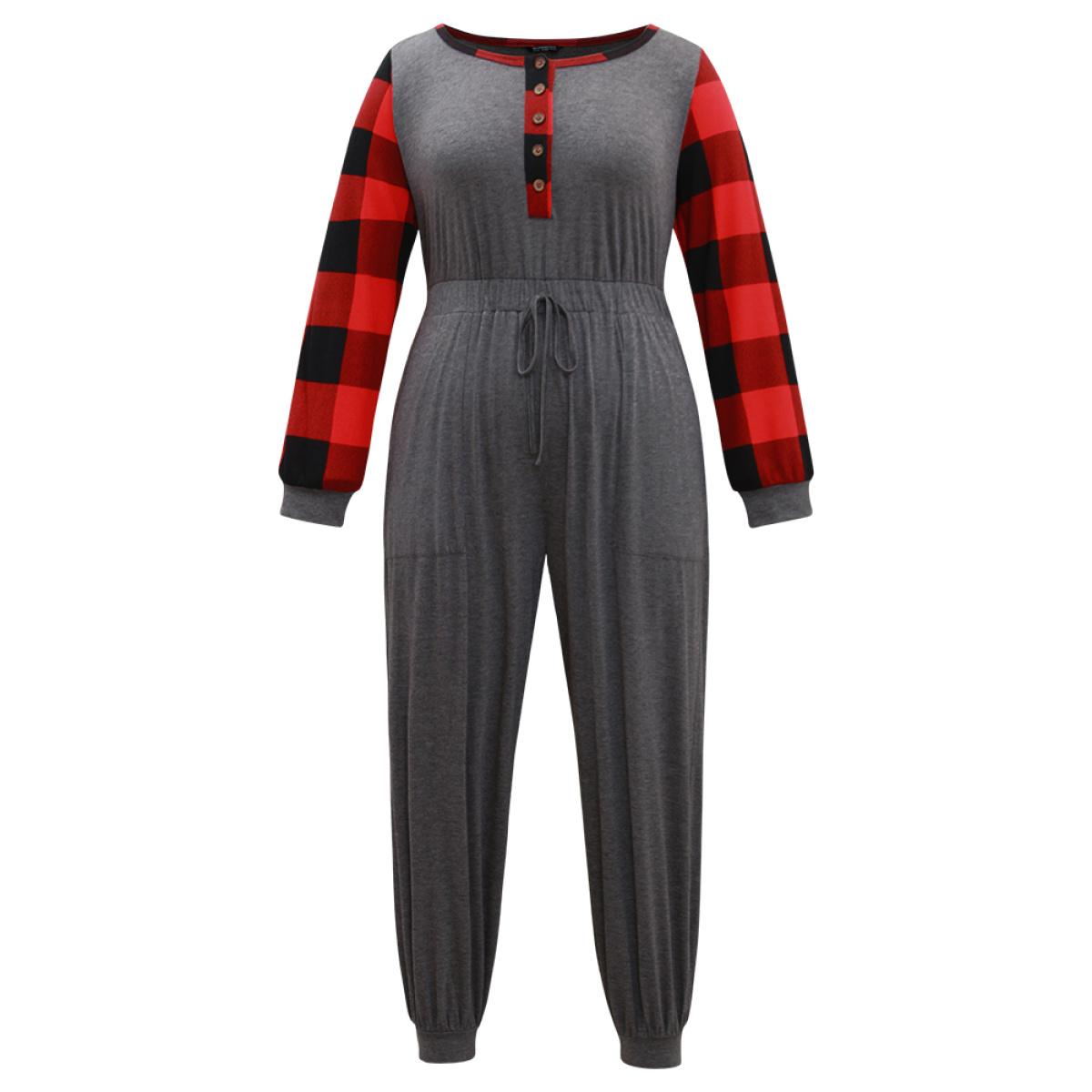 Plus Size Gray Plaid Patchwork Pocket Button Up Bowknot Jumpsuit Women Casual Long Sleeve Round Neck Festival-Christmas Loose Jumpsuits BloomChic 10/M