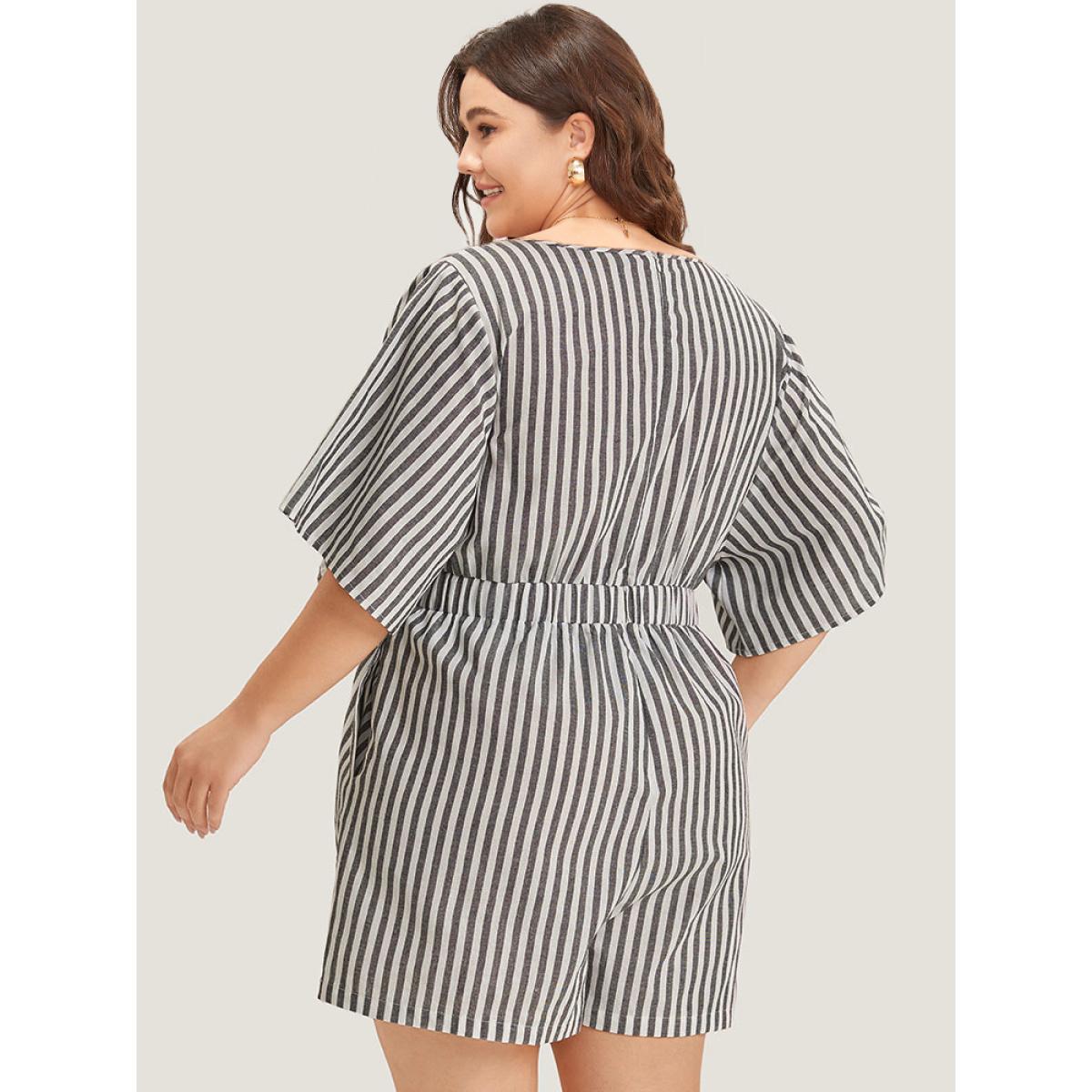 Plus Size Gray Striped Print Pocket Knot Flutter Sleeve Jumpsuit Women Elegant Half Sleeve V-neck Dailywear Loose Jumpsuits BloomChic 22-24/3X