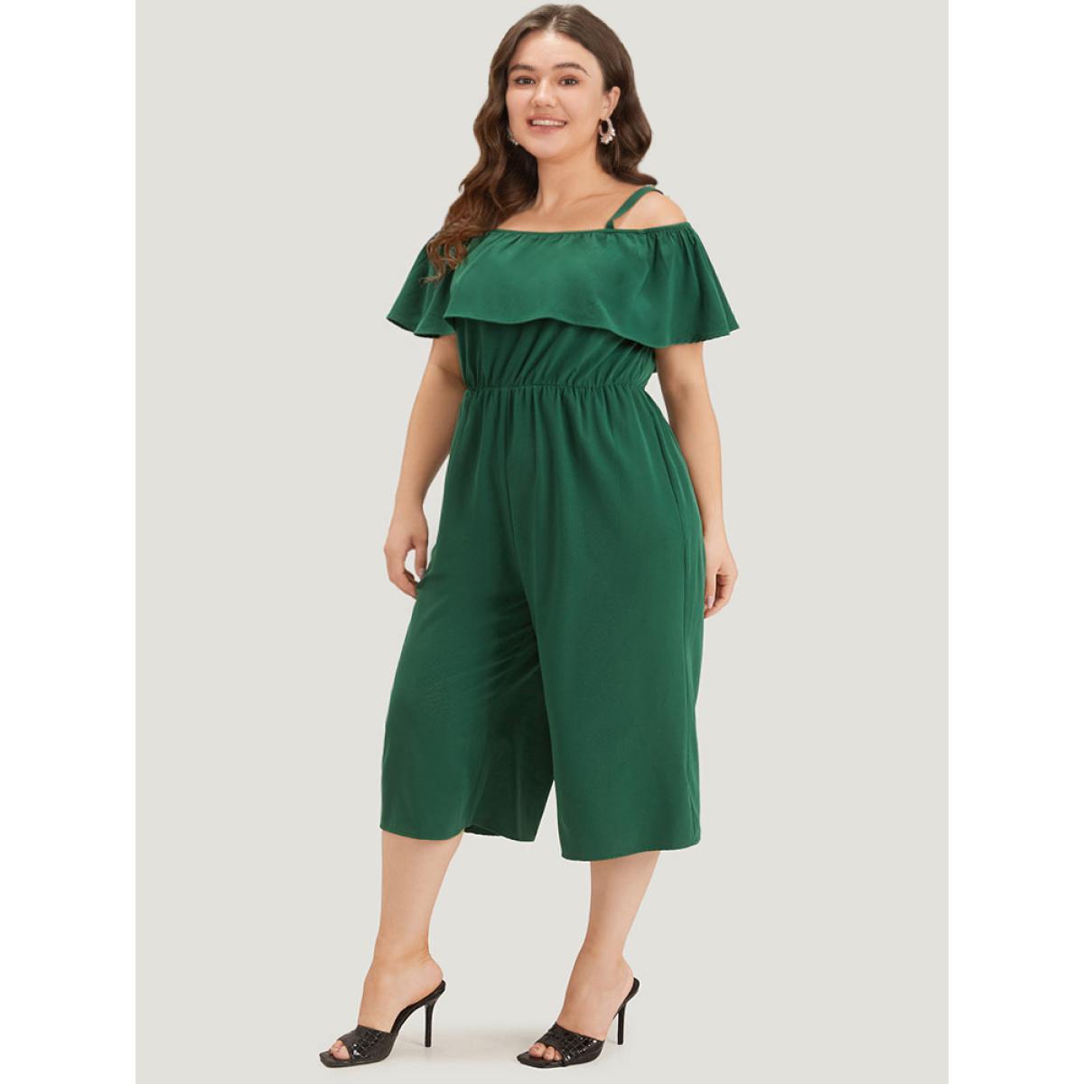 Plus Size Green Off Shoulder Ruffles Pocket Elastic Waist Cami Jumpsuit Women Elegant Half Sleeve One-shoulder neck Dailywear Loose Jumpsuits BloomChic 12/L