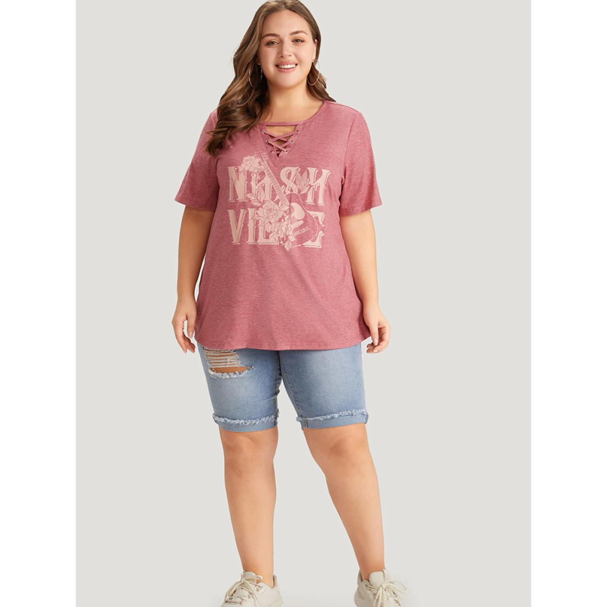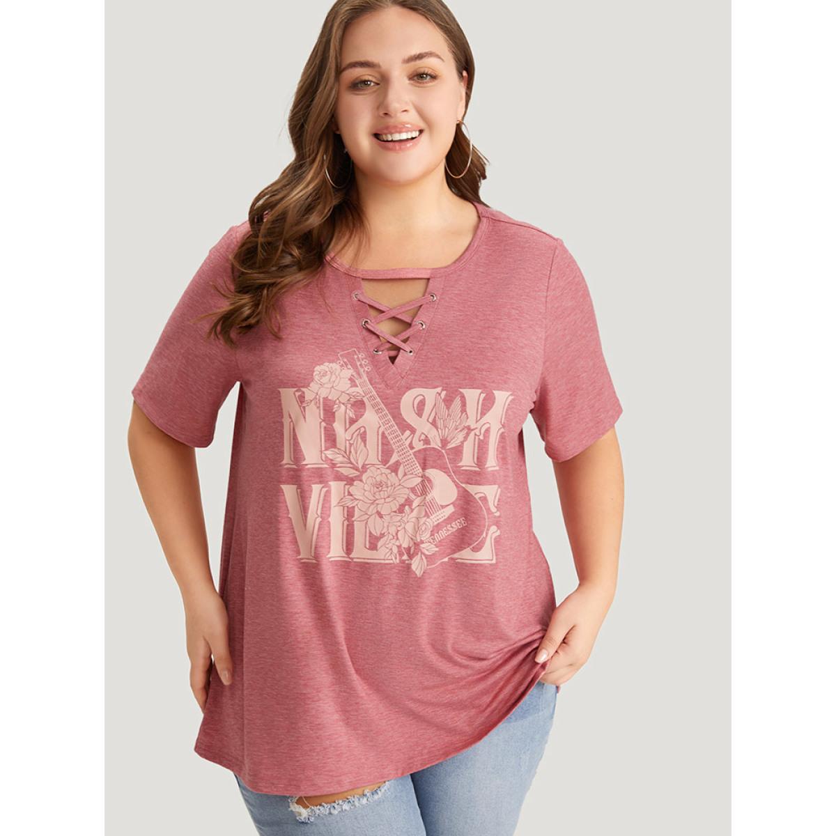 Plus Size Guitar & Letter Print Heather Crisscross Neck Graphic T-shirt Russet Women Casual Art&design Dailywear T-shirts BloomChic 12/L