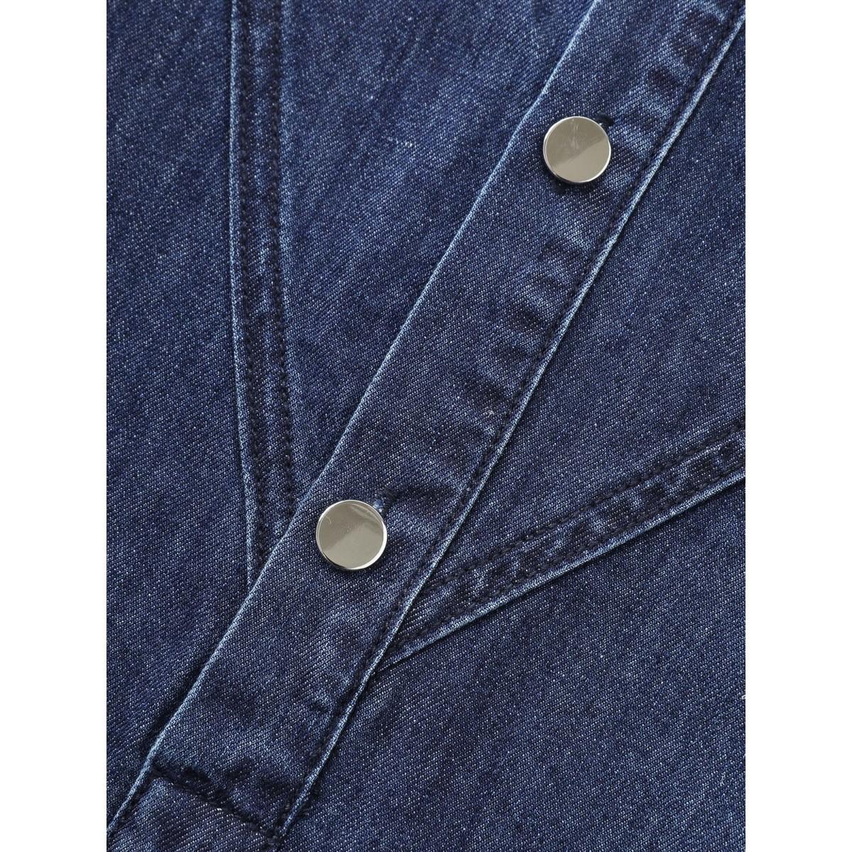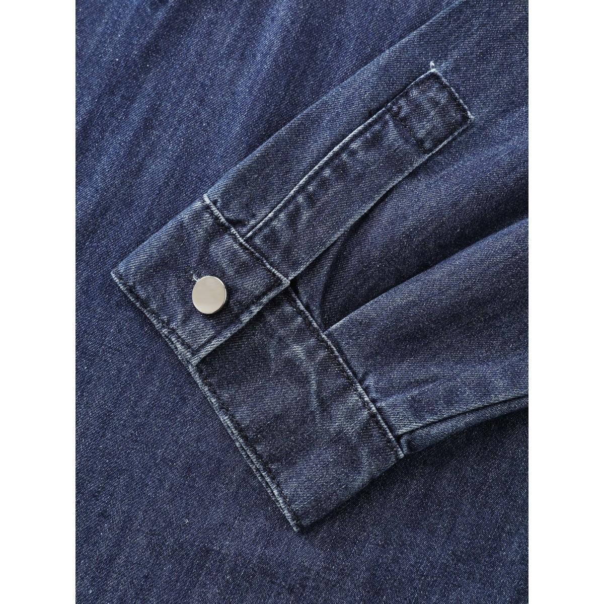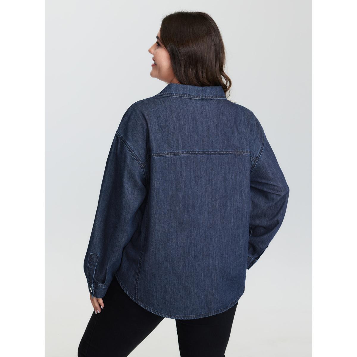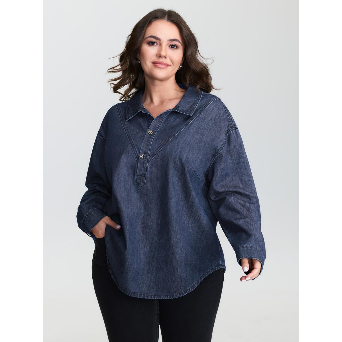 Plus Size Half Placket Button Curvy Hem Denim Shirt Lightbluevintage Women No stretch Extra Long Sleeve Drop shoulder sleeve Casual Leisure Denim Tops BloomChic 28/5X