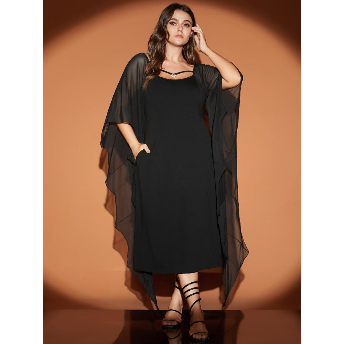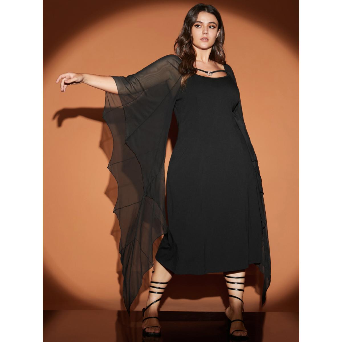 Plus Size Halloween Asymmetrical Dolman Sleeve Backless Ties Neck Bodycon Dress Black Women Glamour Patchwork Square Neck Extra Long Sleeve Curvy Midi Dress BloomChic 30/6X