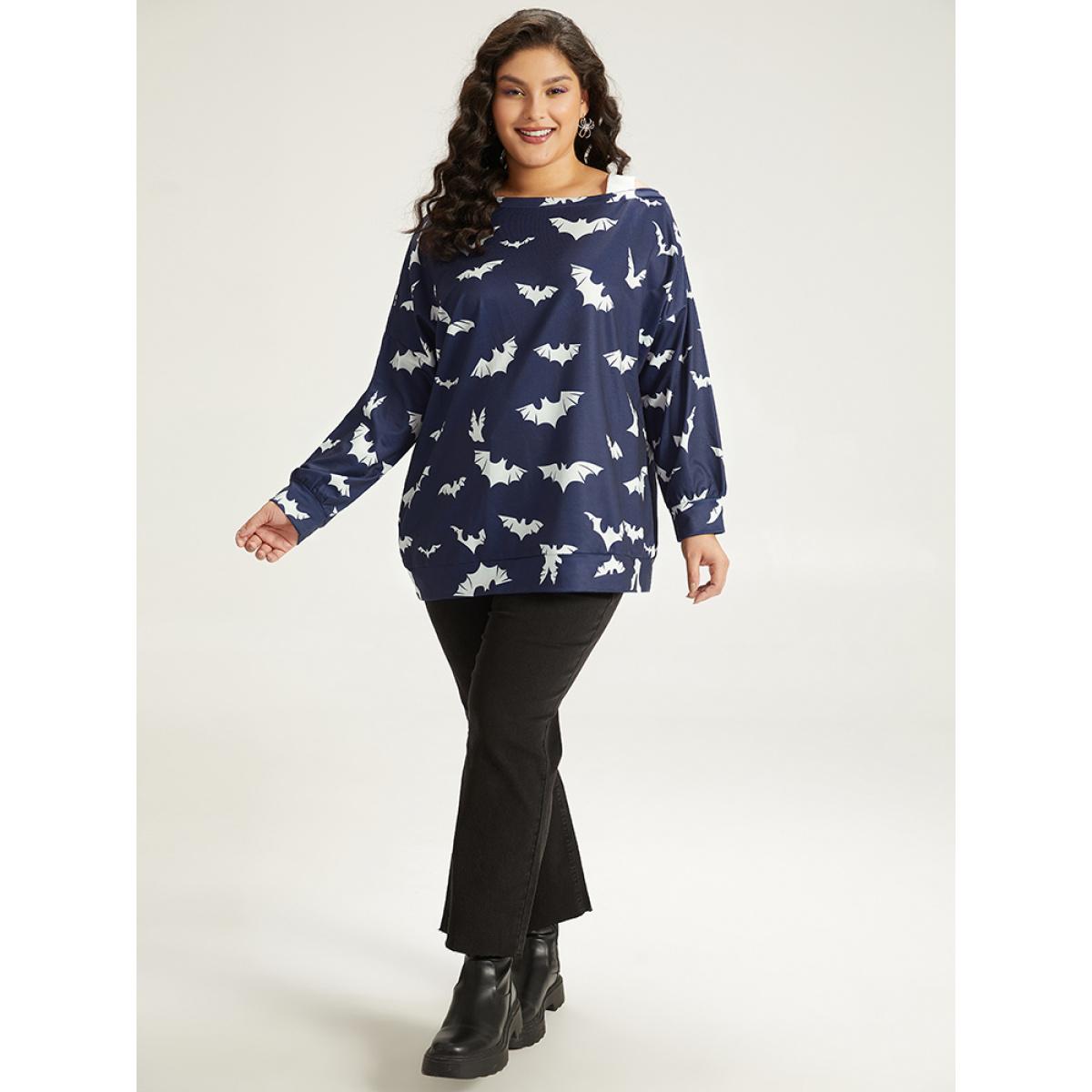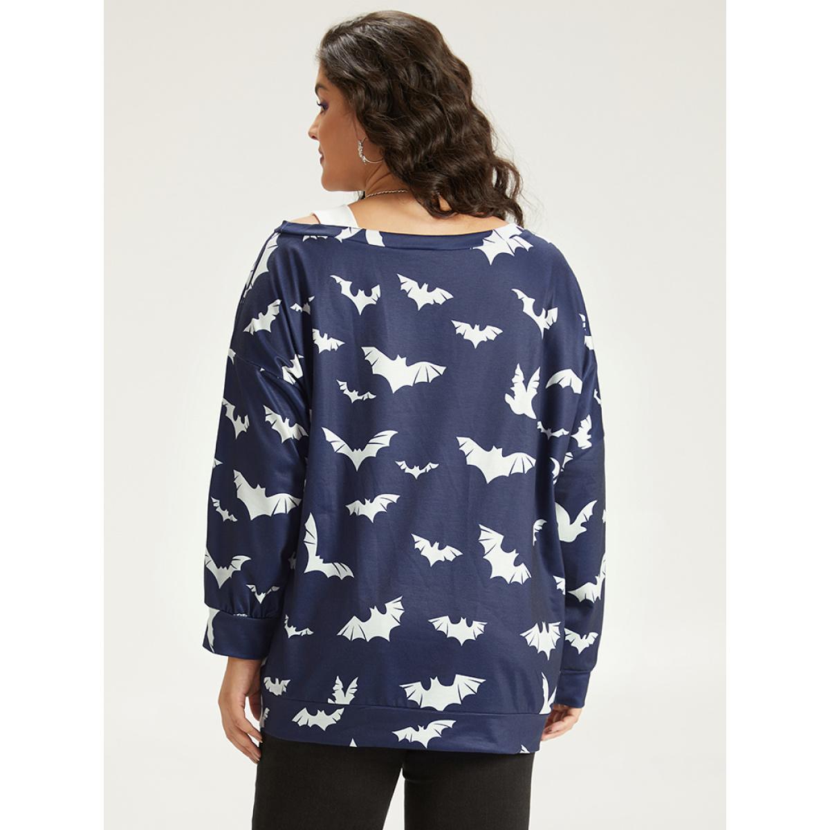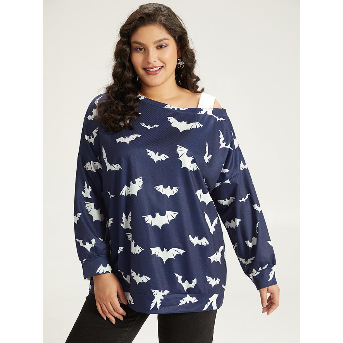 Plus Size Halloween Bat Print Elastic Cuffs Cold Shoulder Sweatshirt Women Indigo Casual Elastic cuffs Cold Shoulder Dailywear Sweatshirts BloomChic 30/6X
