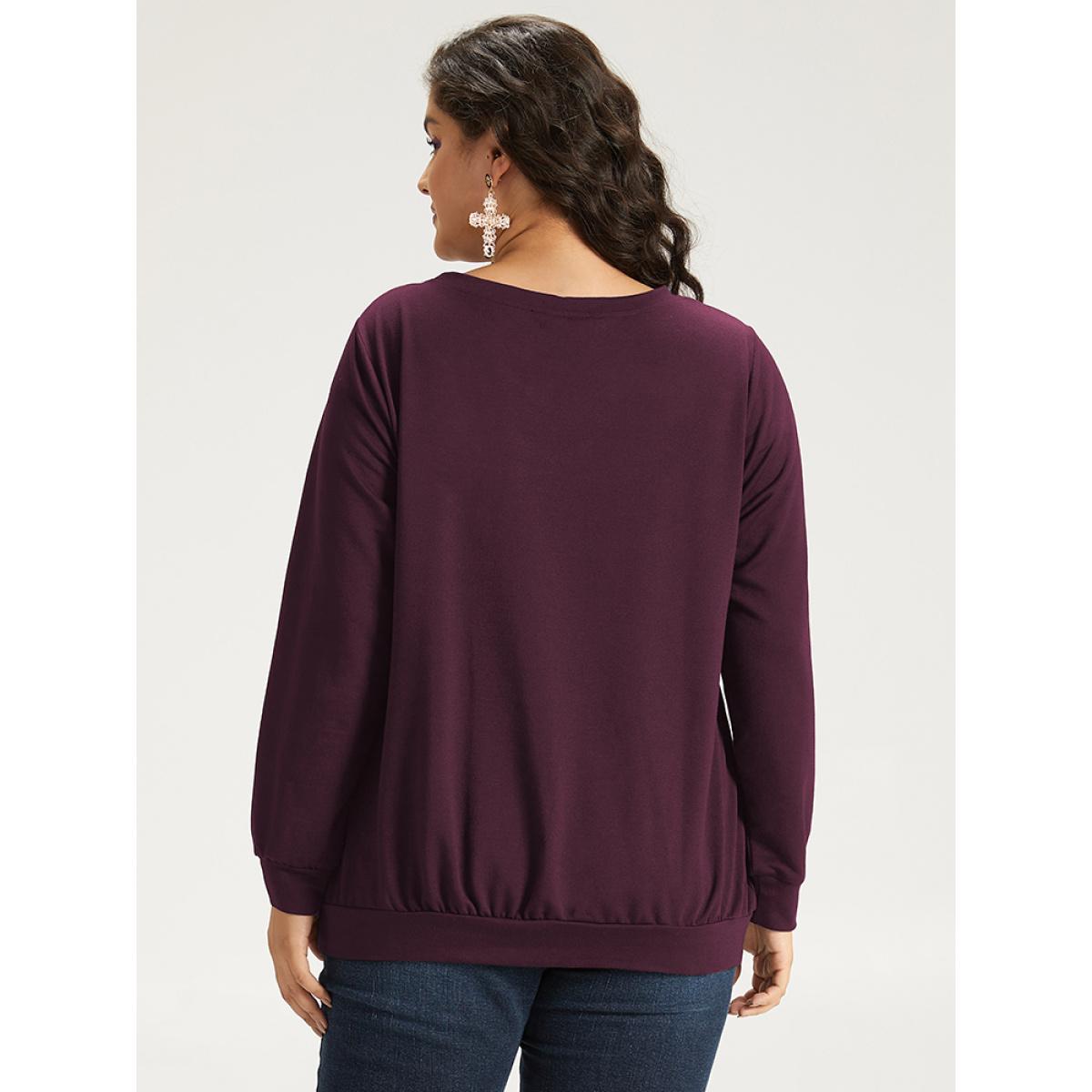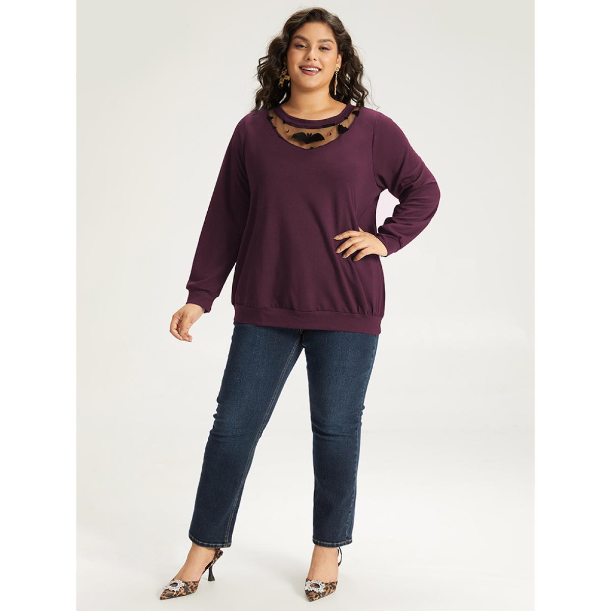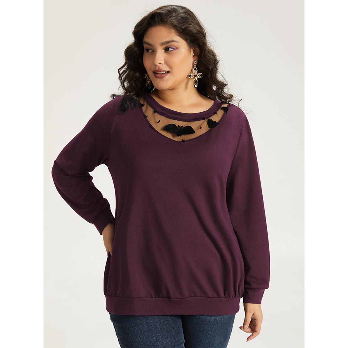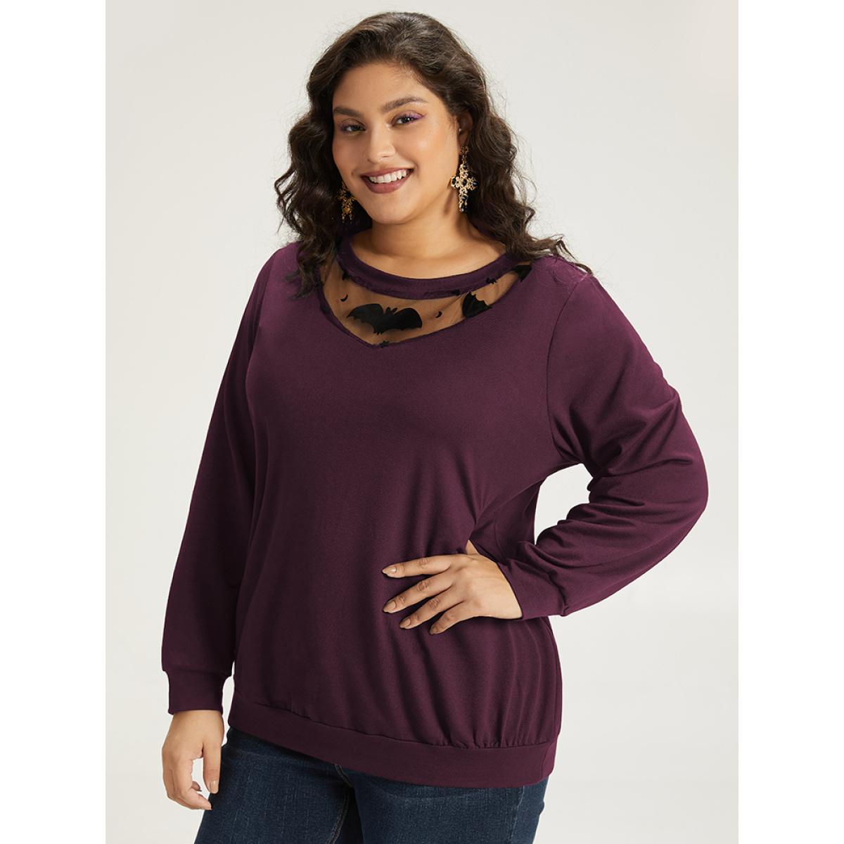 Plus Size Halloween Bat Print Mesh Patchwork Sweatshirt Women Burgundy Elegant Elastic cuffs Round Neck Festival-Halloween Sweatshirts BloomChic 10/M