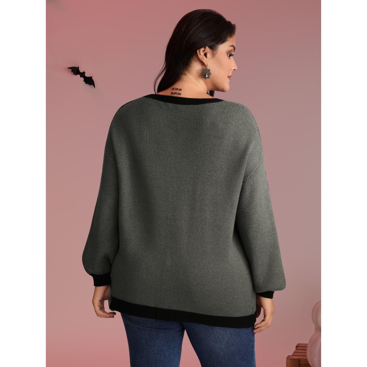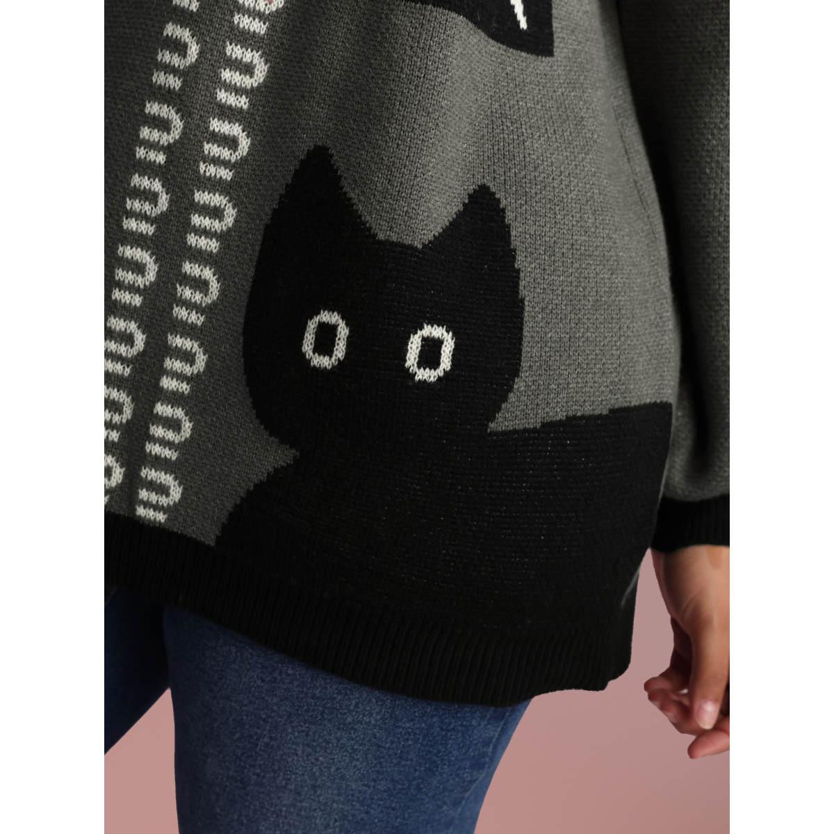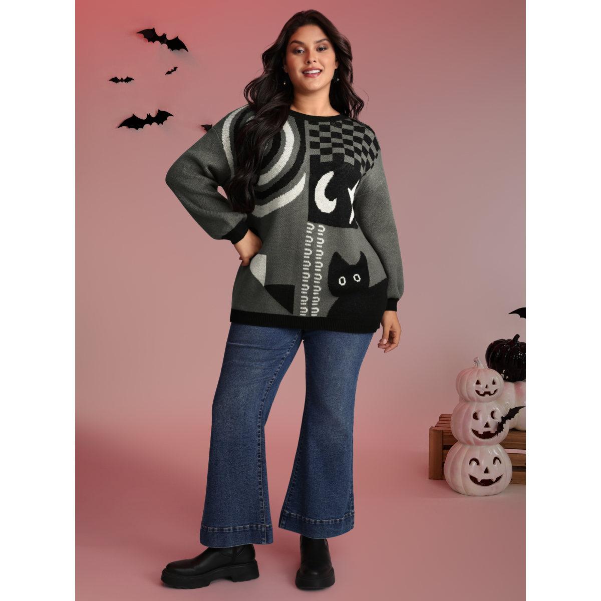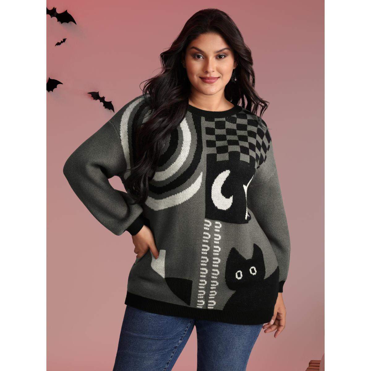 Plus Size Halloween Cat Print Contrast Pullover DimGray Women Playful Loose Long Sleeve Round Neck Casual Pullovers BloomChic 12/L