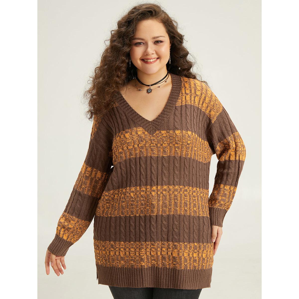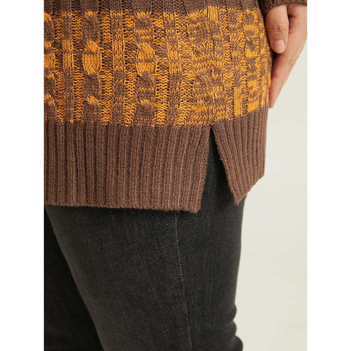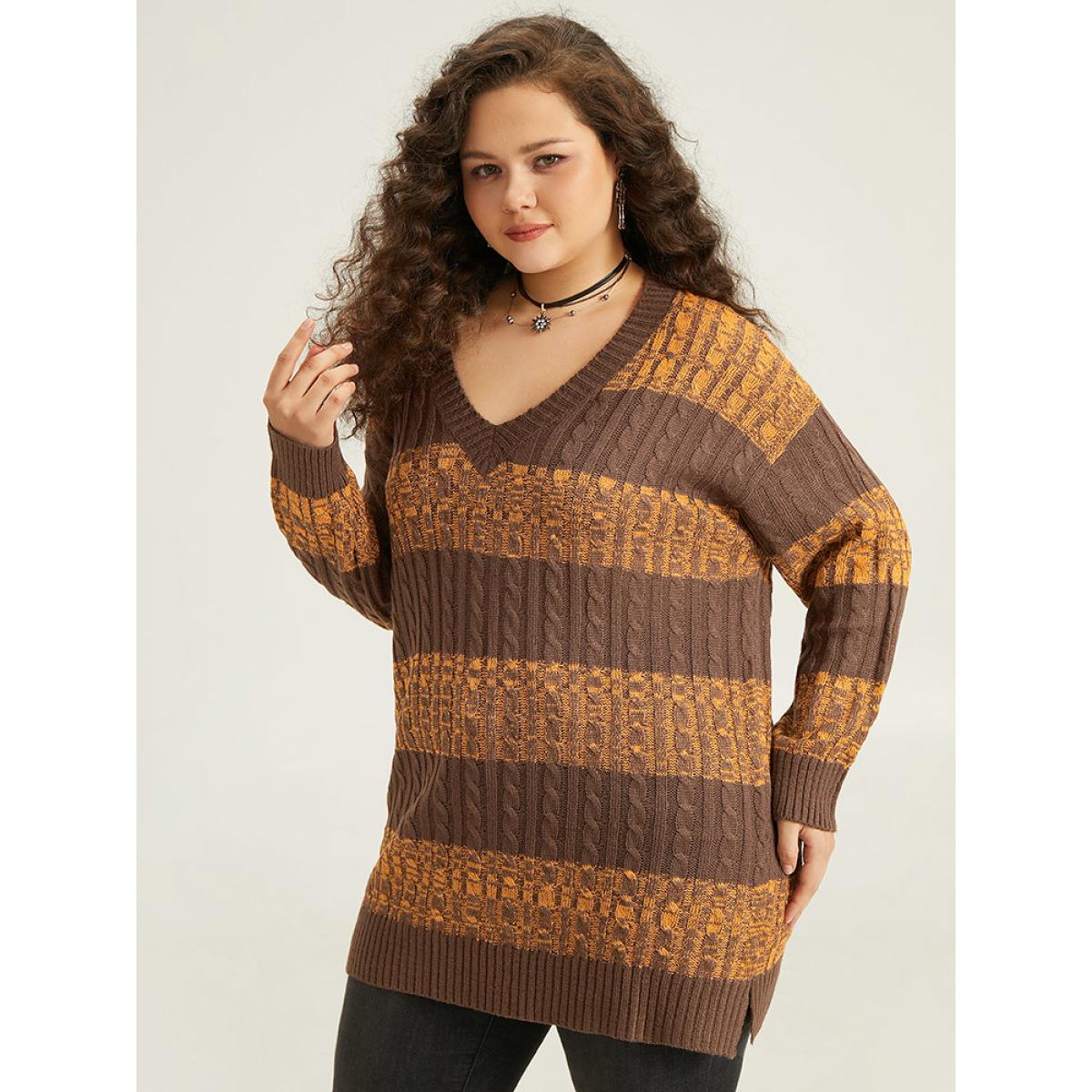 Plus Size Halloween Colorblock Plisse Split Side Pullover Bronze Women Casual Loose Long Sleeve V-neck Festival-Halloween Pullovers BloomChic 10/M