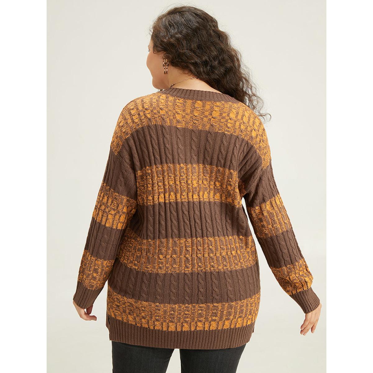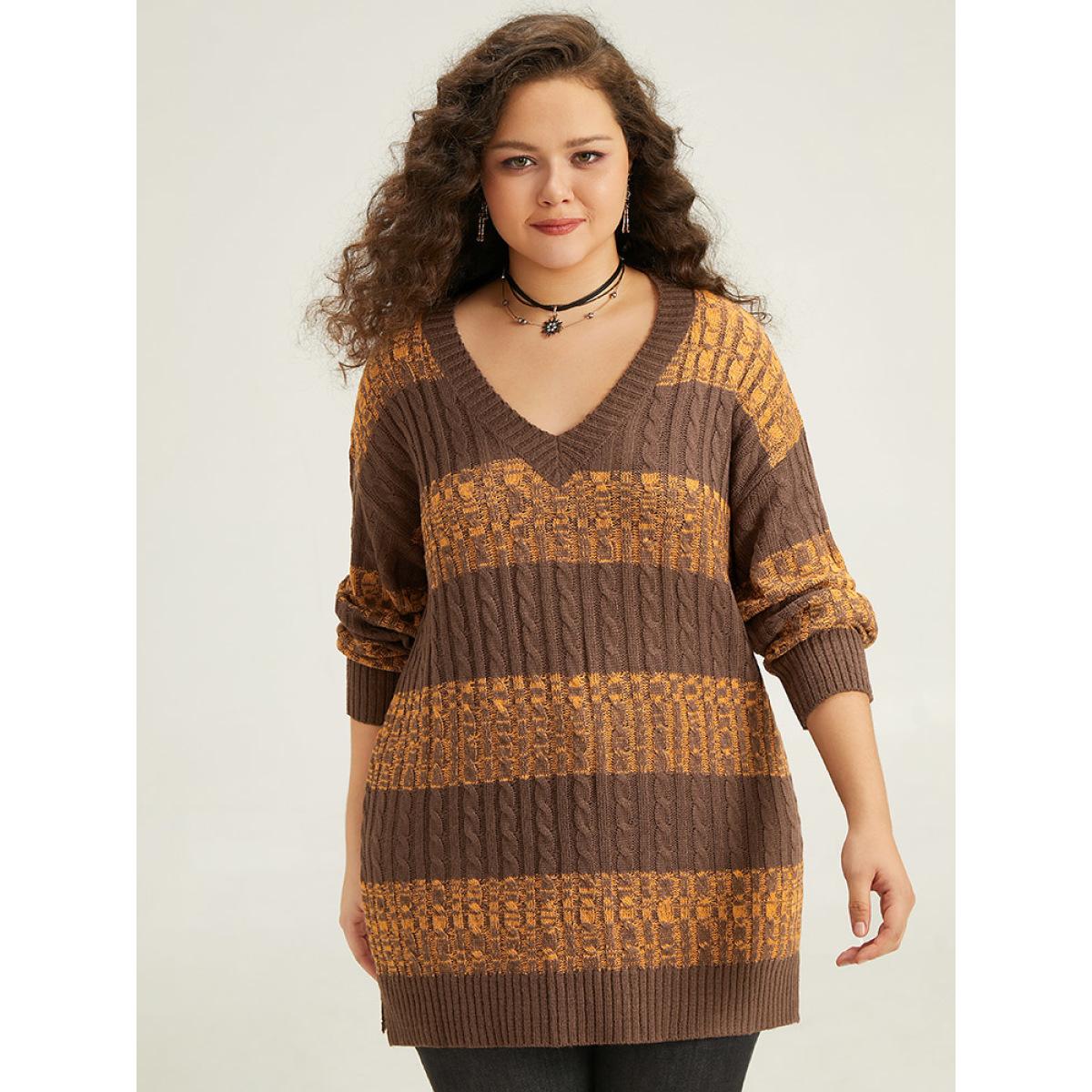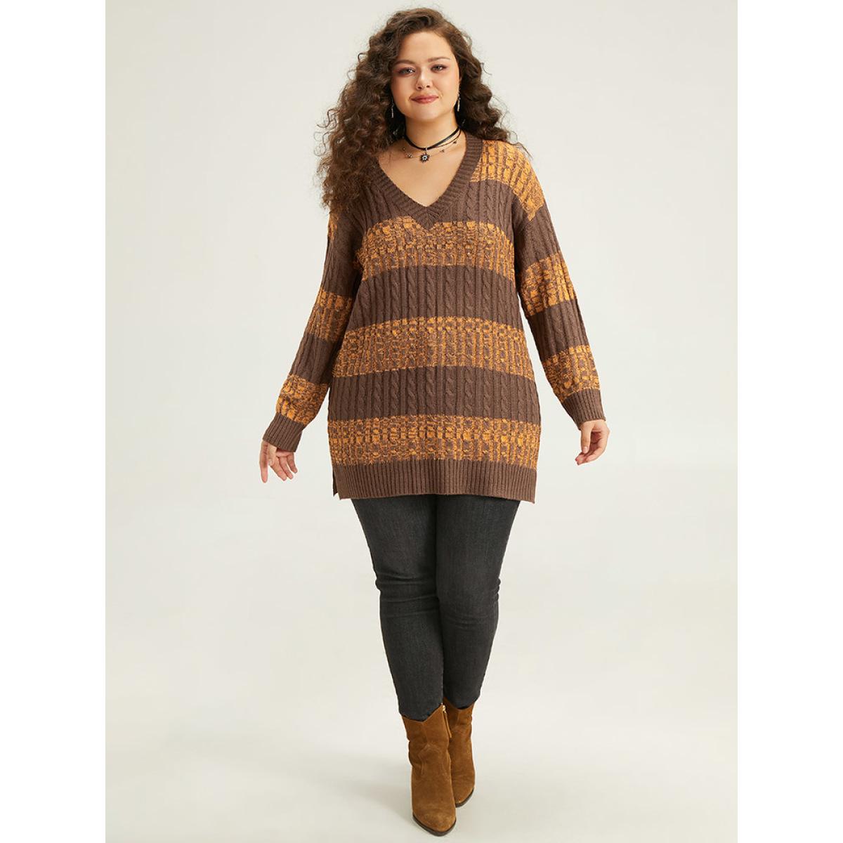 Plus Size Halloween Colorblock Plisse Split Side Pullover Bronze Women Casual Loose Long Sleeve V-neck Festival-Halloween Pullovers BloomChic 10/M
