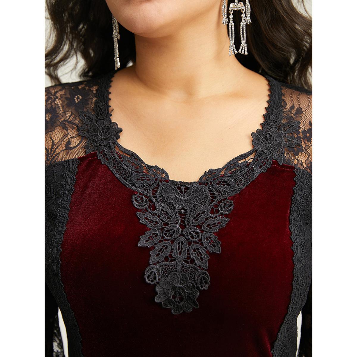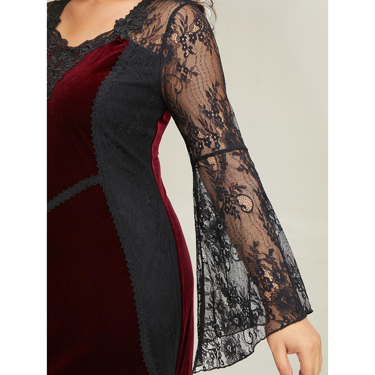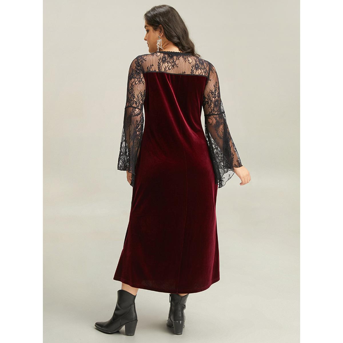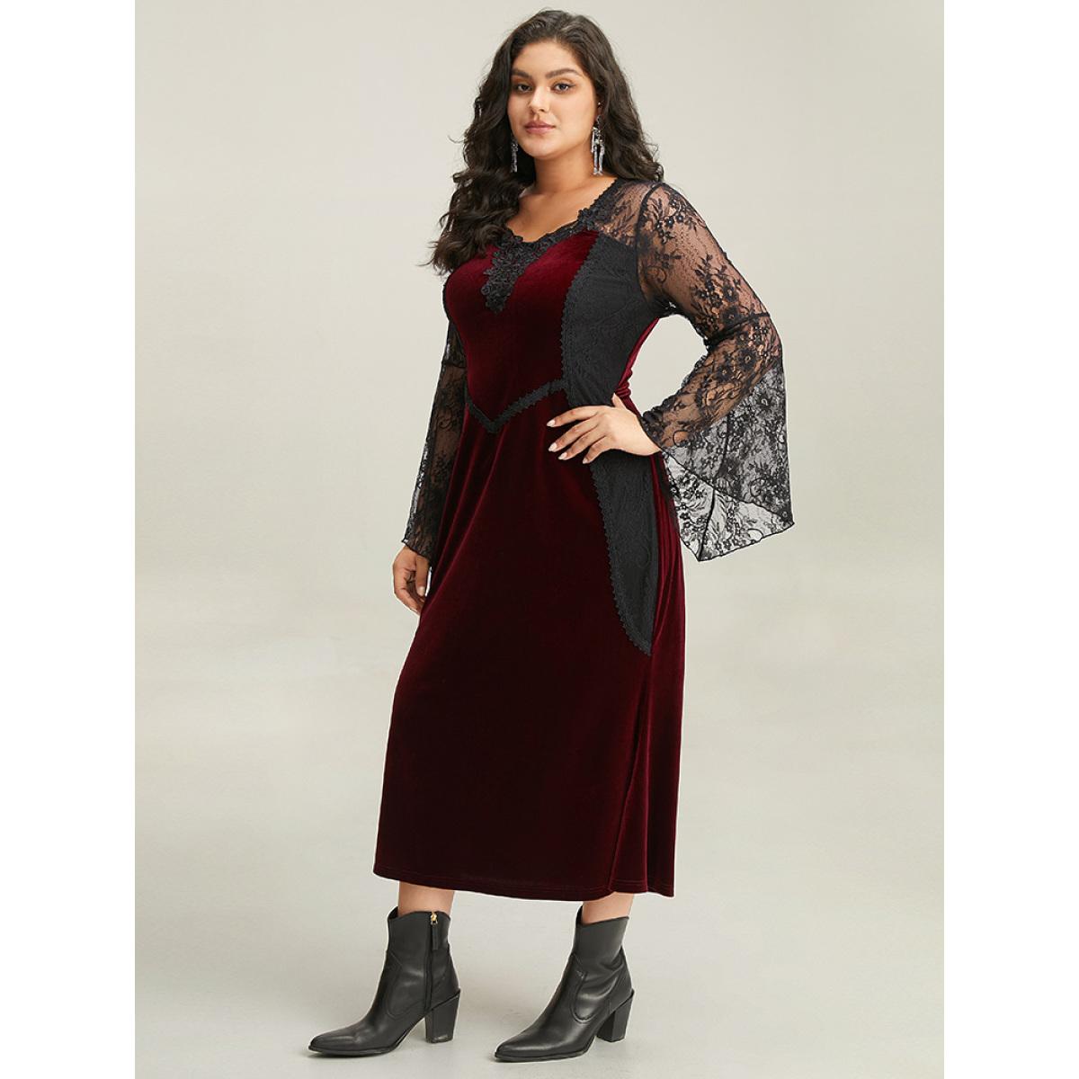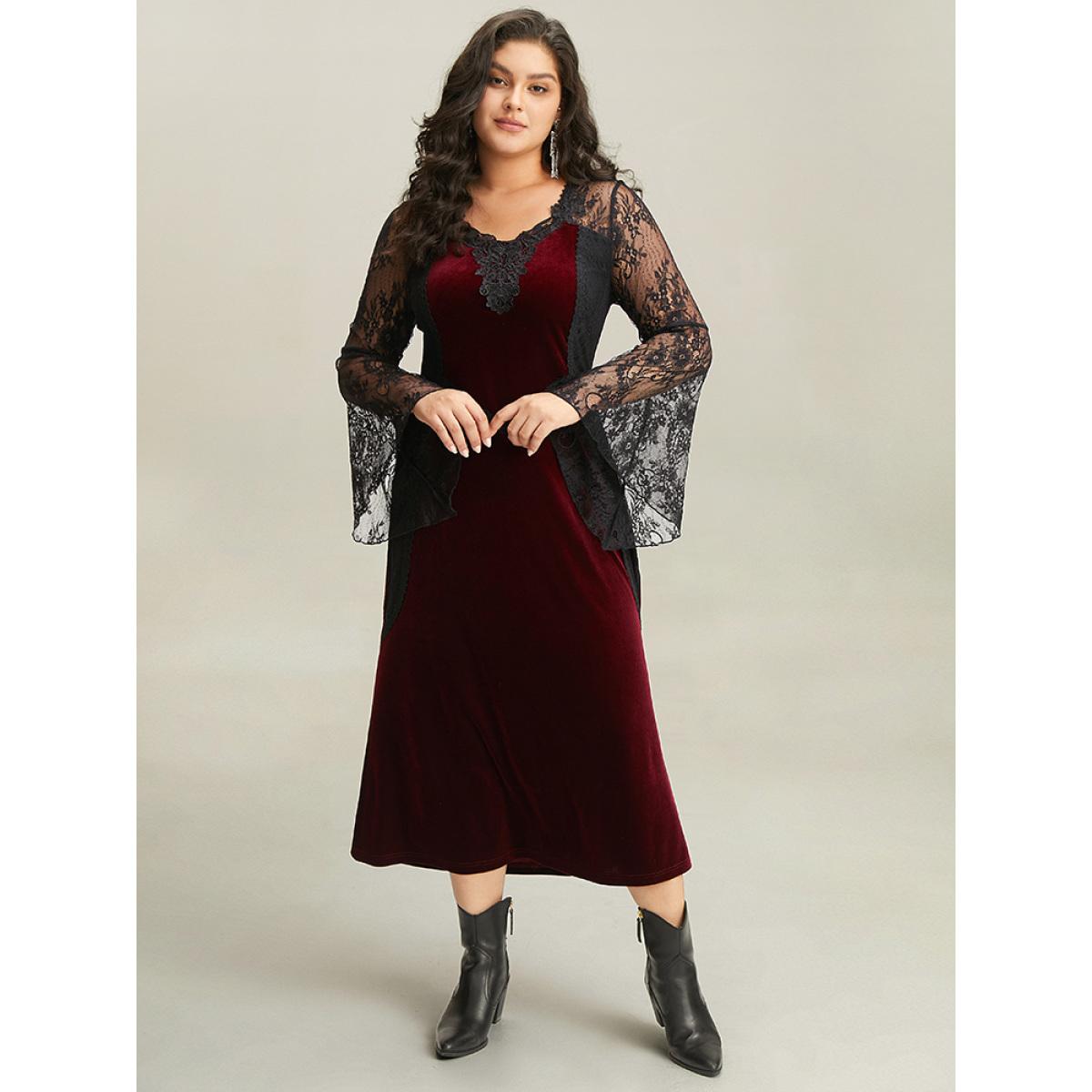 Plus Size Halloween Eyelet Lace Mesh Bell Sleeve Dress Scarlet Women Elegant See through Round Neck Long Sleeve Curvy Midi Dress BloomChic 28/5X