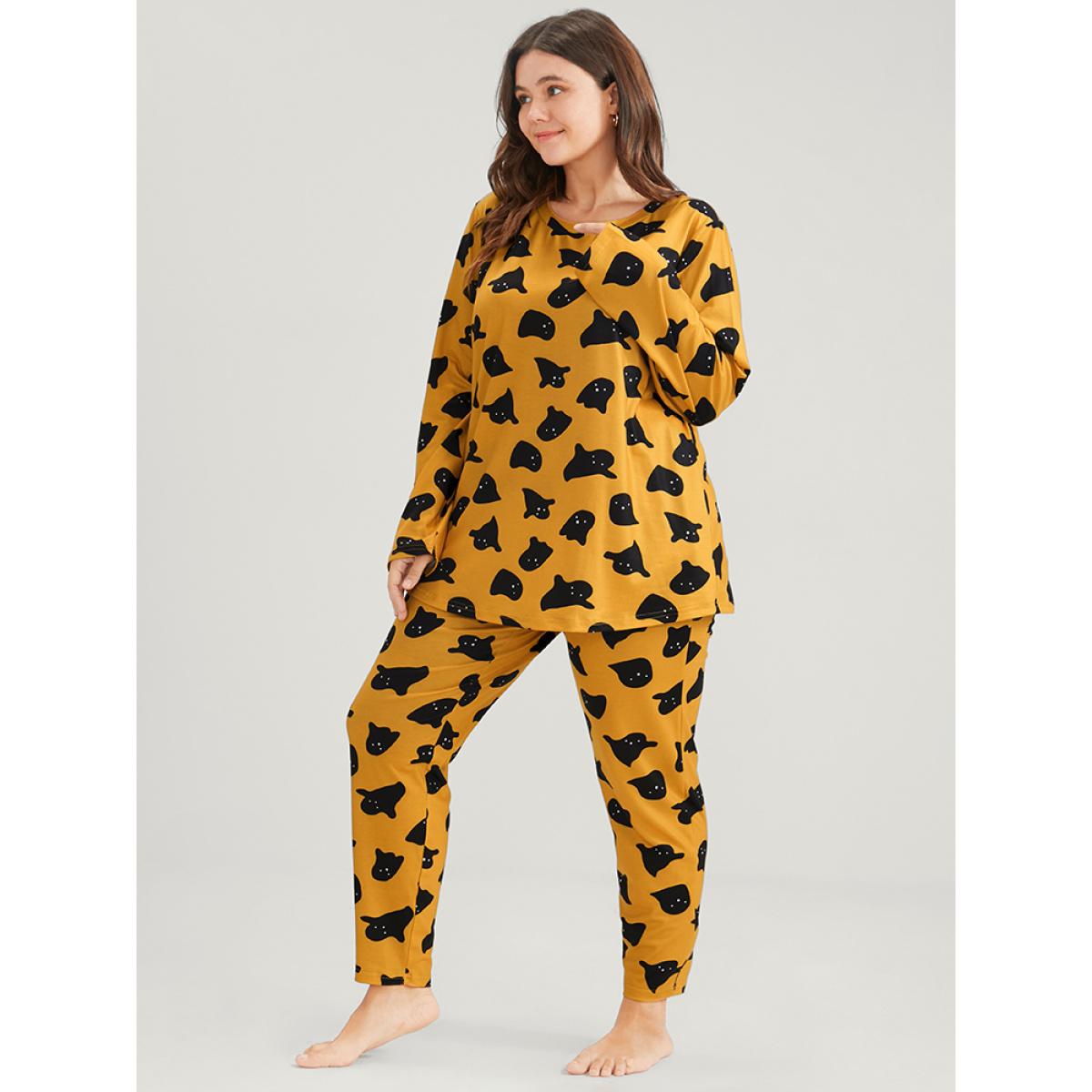 Plus Size Halloween Ghost Print Pajama Set Women Orange Graphic-Halloween Printed Long Sleeve Round Neck Casual Loungewear Sets BloomChic 10/M