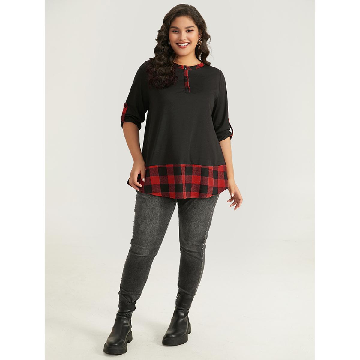 Plus Size Halloween Gingham Patchwork Notched Button Up Arc Hem T-shirt Red Women Casual Contrast Plaid Round Neck Festival-Halloween T-shirts BloomChic 10/M