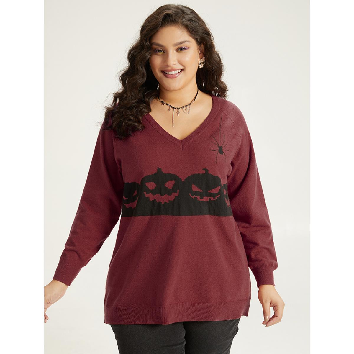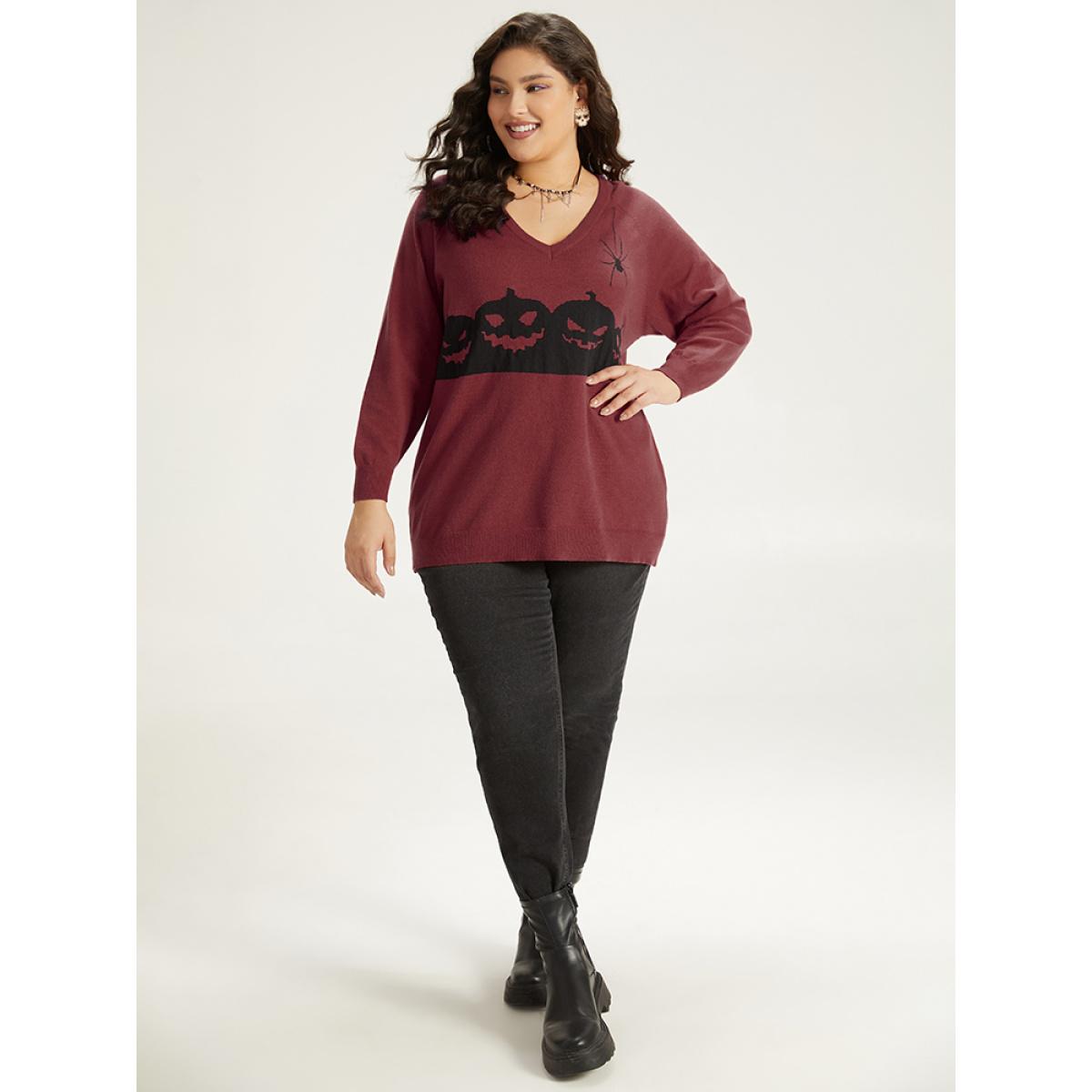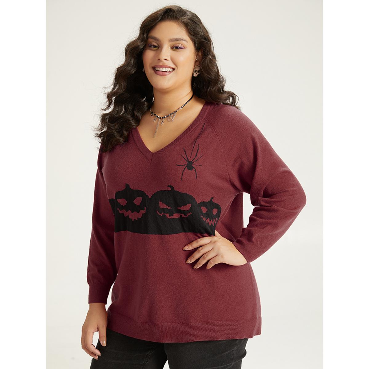 Plus Size Halloween Graphic Pumpkin V Neck Pullover Scarlet Women Casual Loose Long Sleeve V-neck Dailywear Pullovers BloomChic 12/L