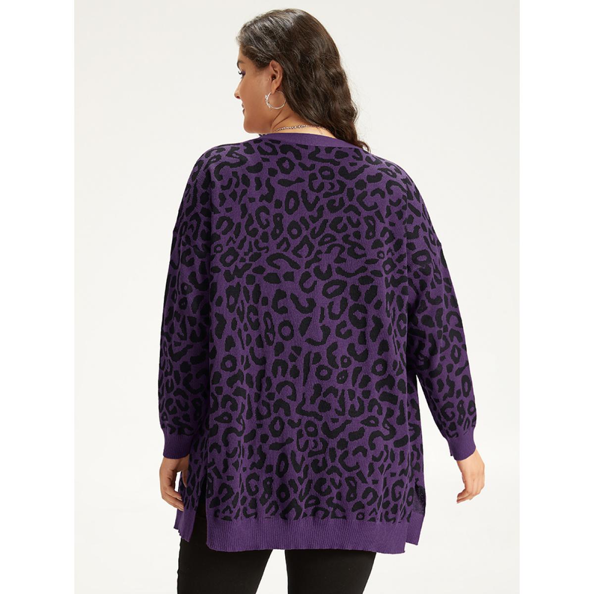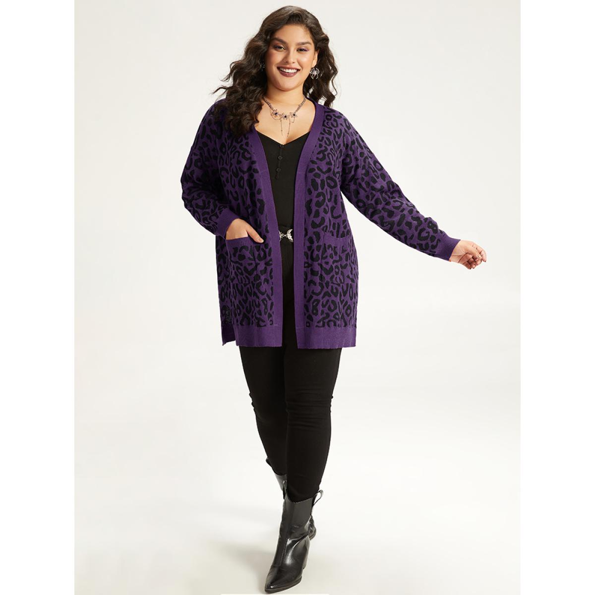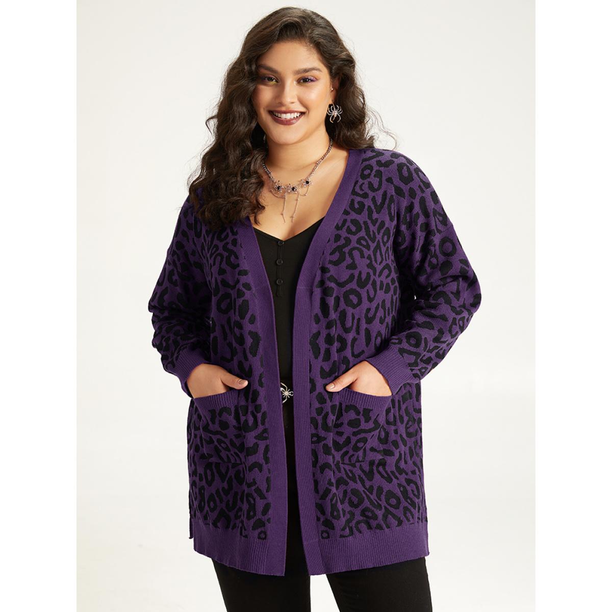 Plus Size Halloween Leopard Print Patched Pocket Split Side Cardigan Purple Women Casual Loose Long Sleeve Festival-Halloween Cardigans BloomChic 10/M