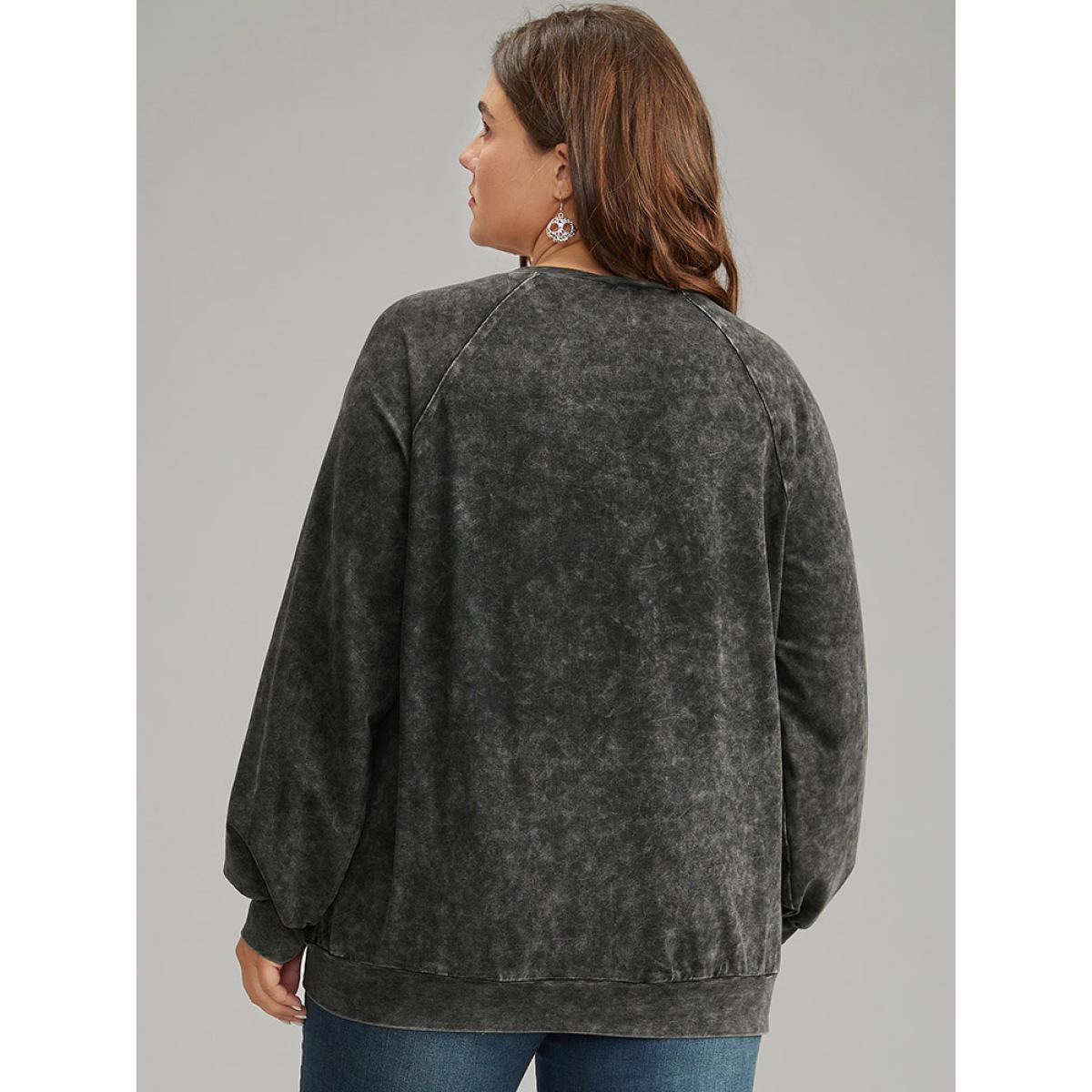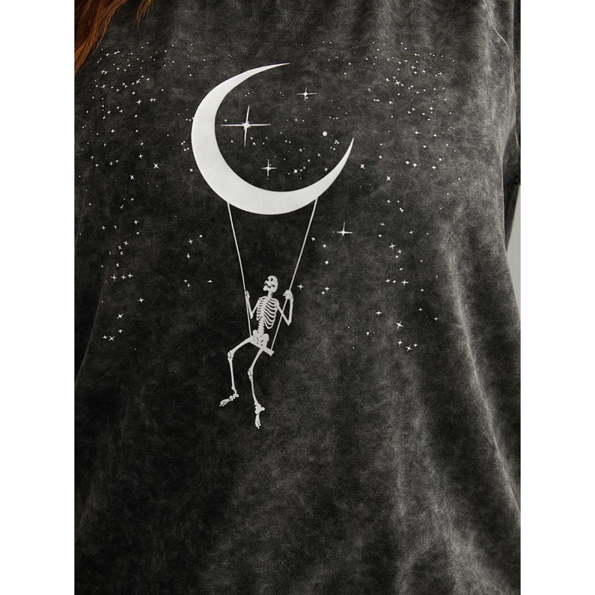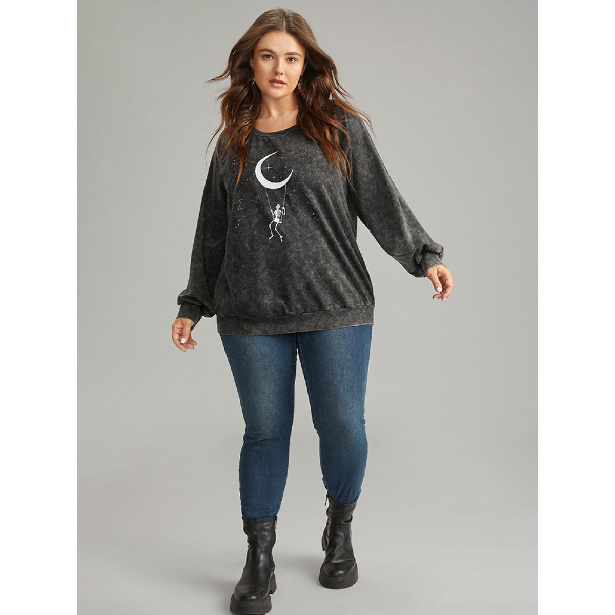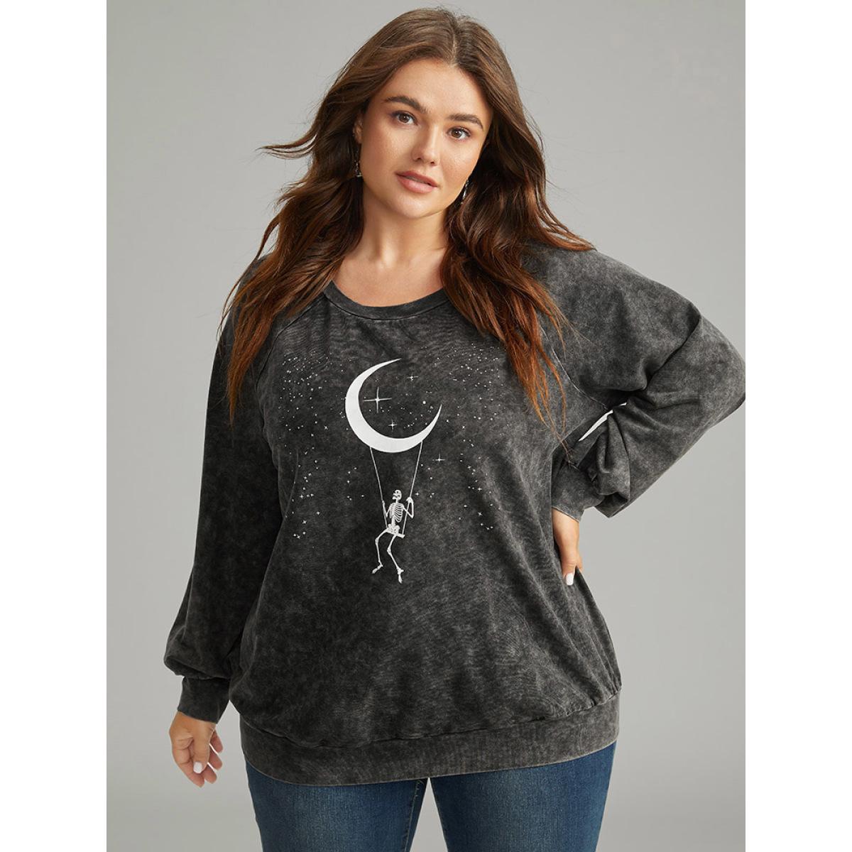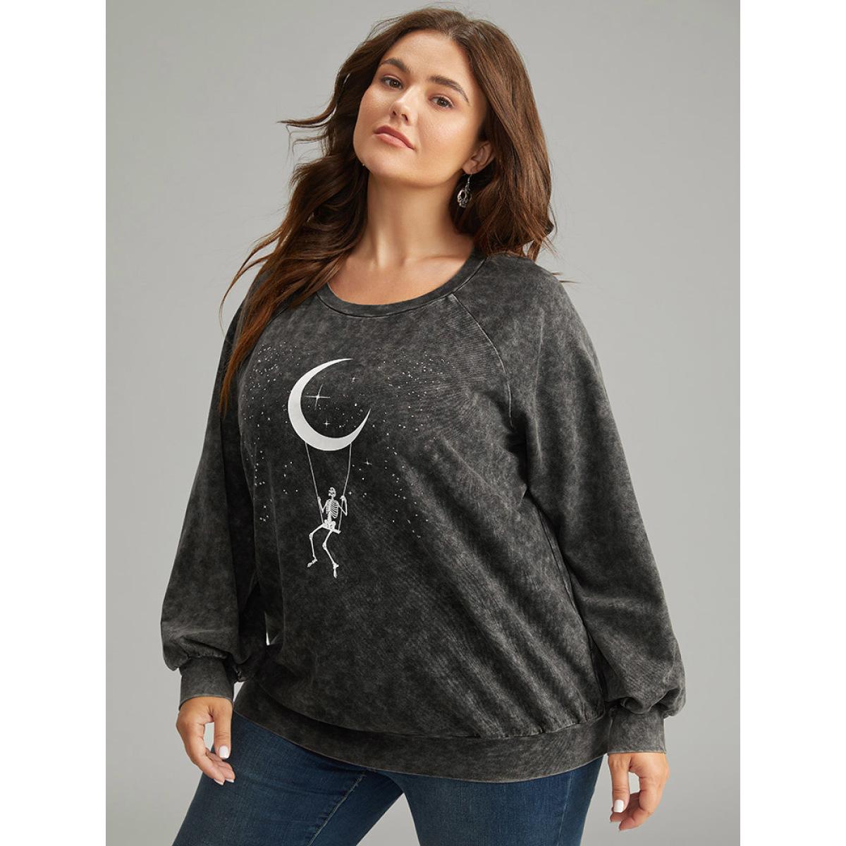 Plus Size Halloween Moon & Star Print Raglan Sleeve Sweatshirt Women Black Casual Printed Festival-Halloween Sweatshirts BloomChic 14-16/1X