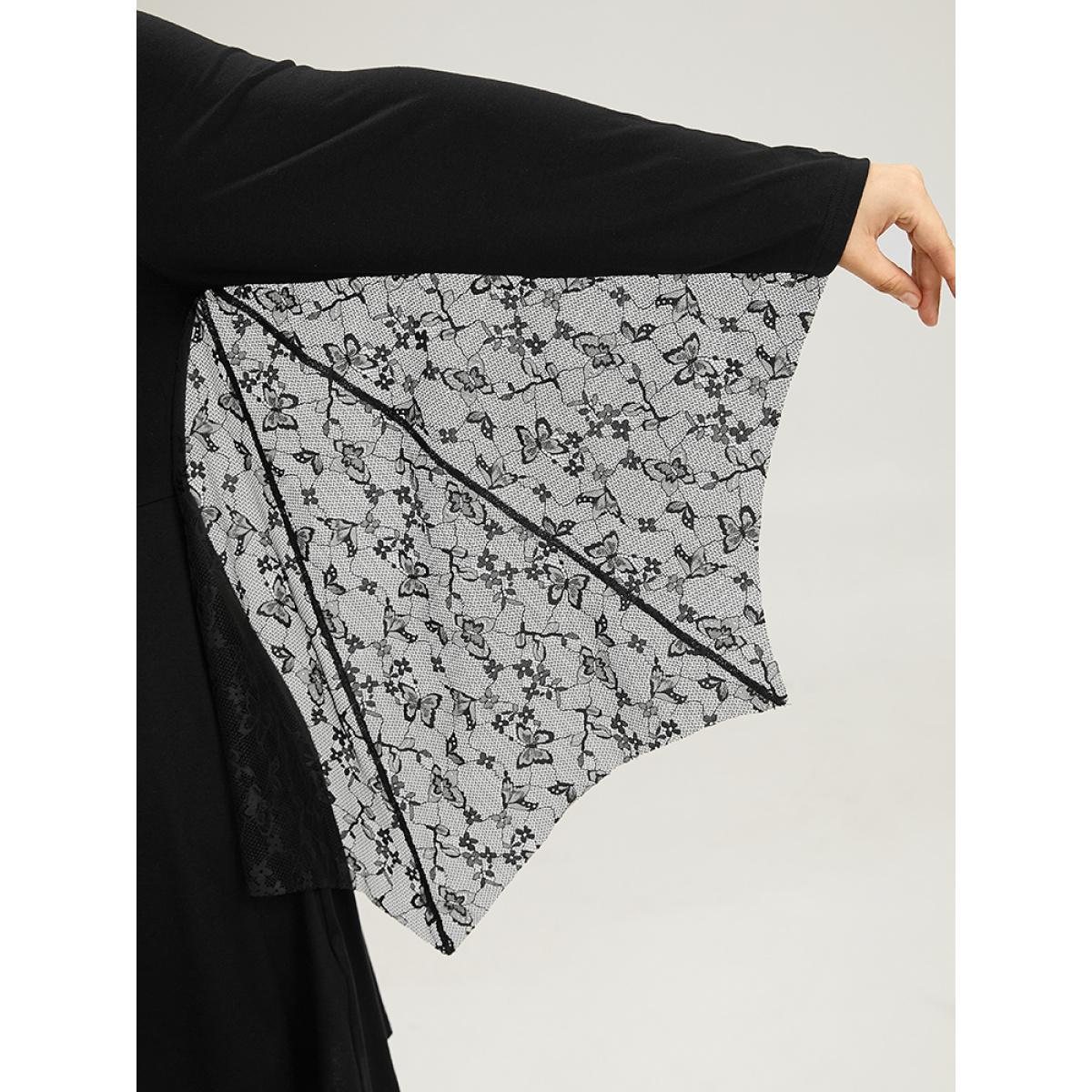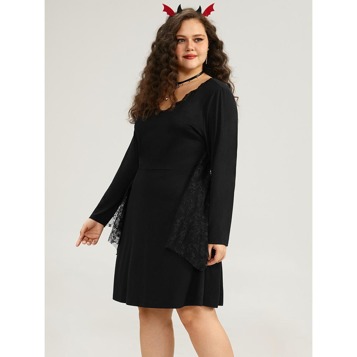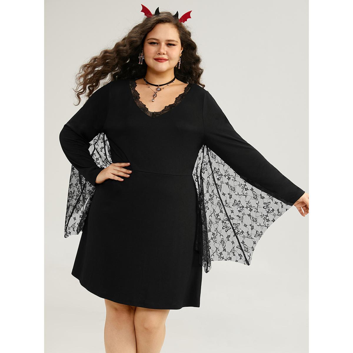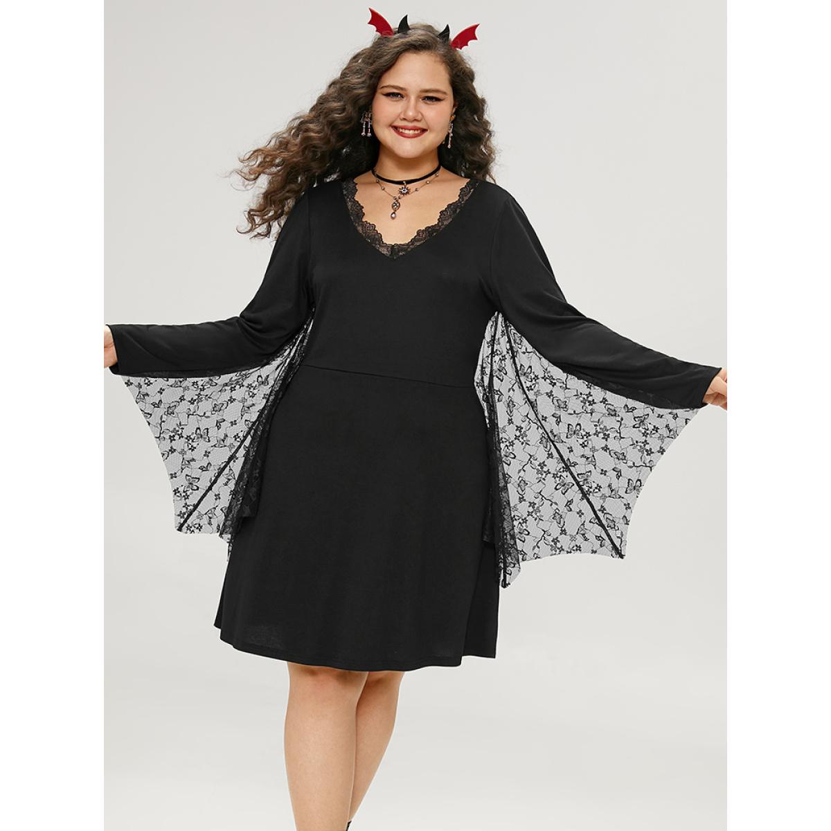 Plus Size Halloween Plain Contrast Lace Flutter Hem Dress DarkGreen Women Casual See through V-neck Long Sleeve Curvy Knee Dress BloomChic 26/4X