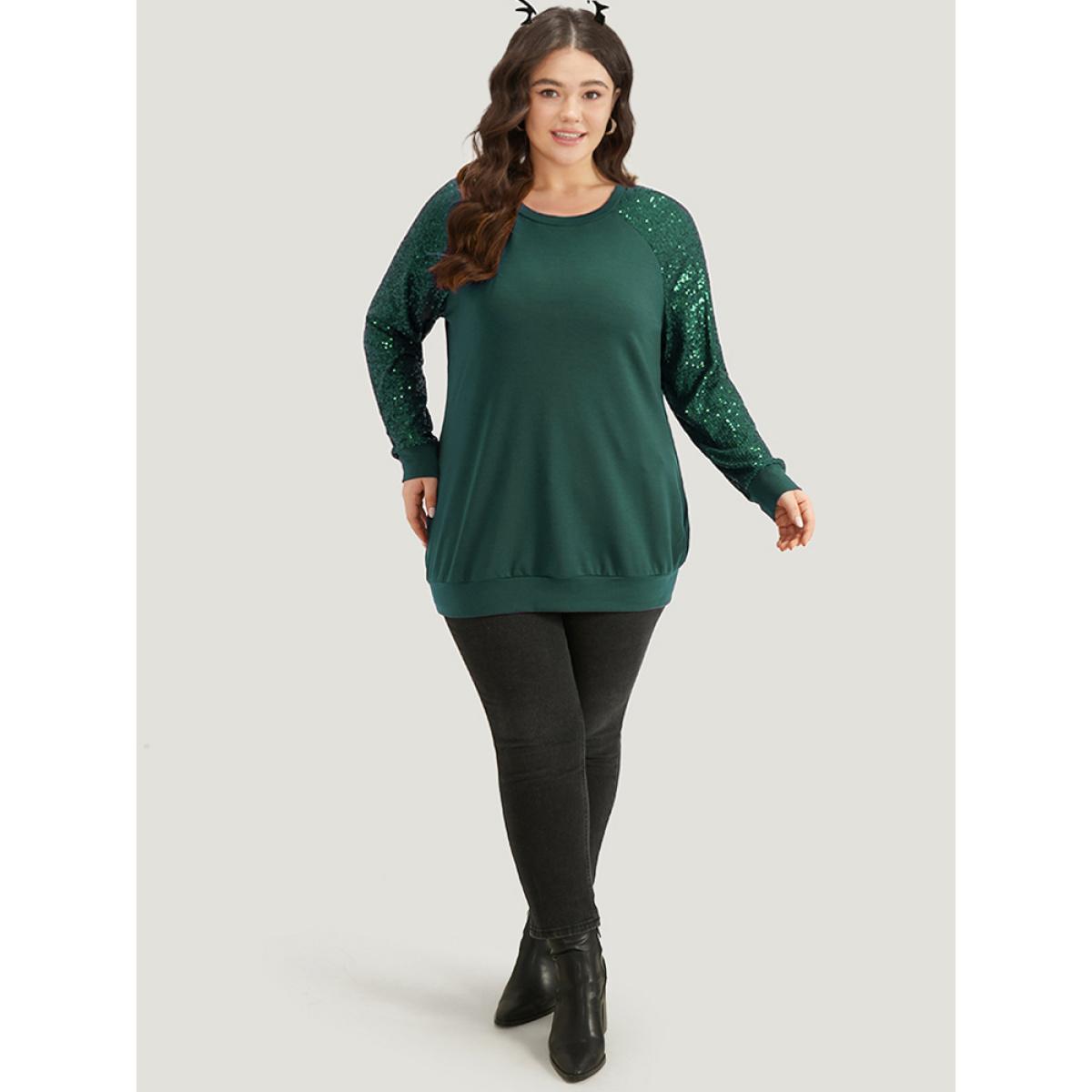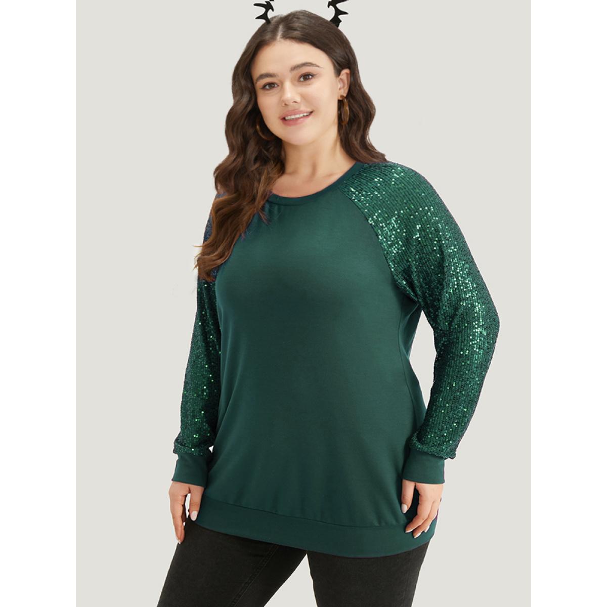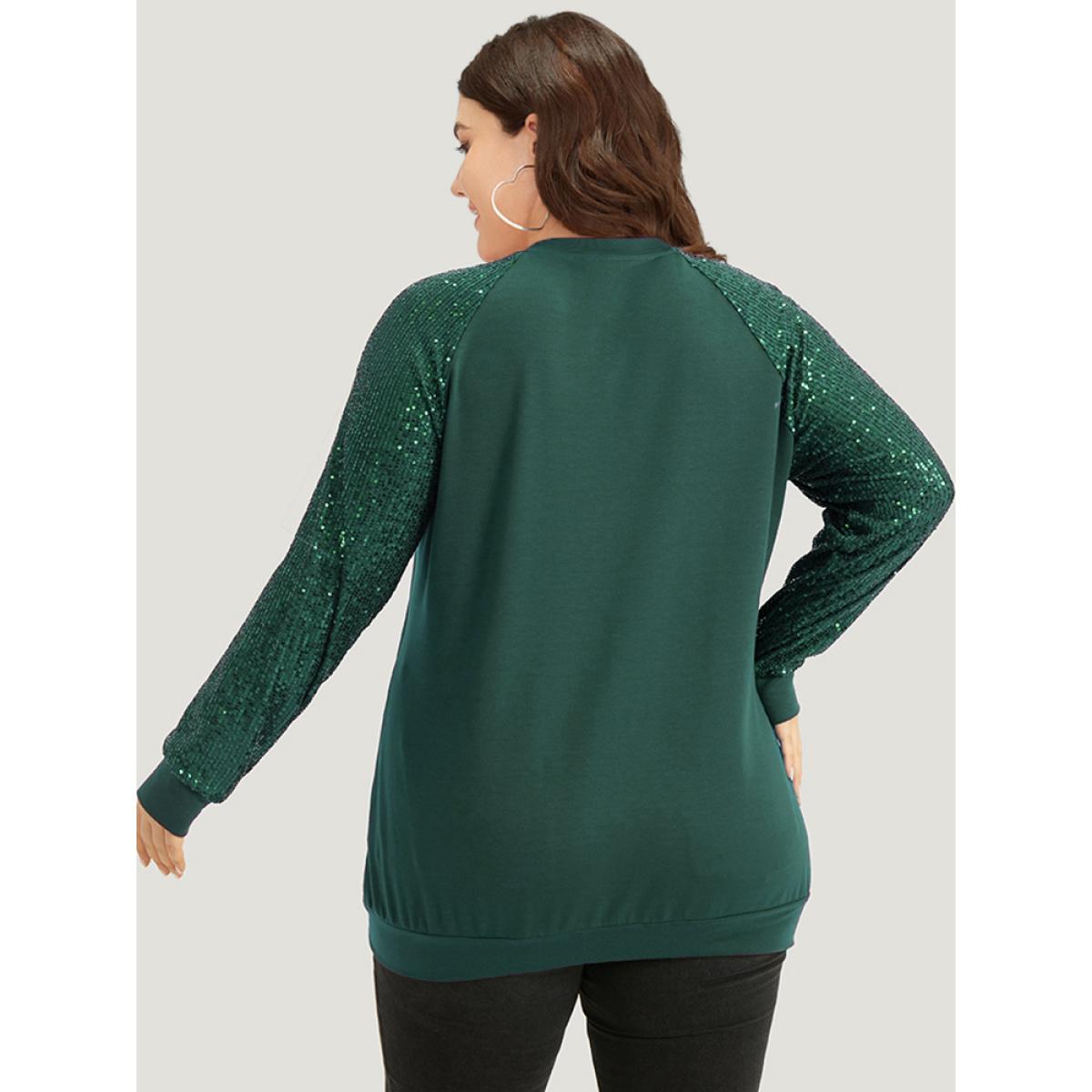 Plus Size Halloween Sequin Round Neck Raglan Sleeve Sweatshirt Women Green Elegant Plain Round Neck Festival-Halloween Sweatshirts BloomChic 22-24/3X