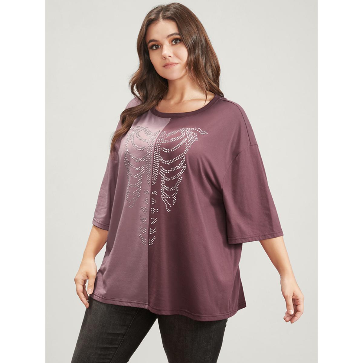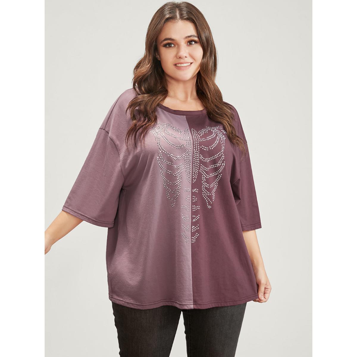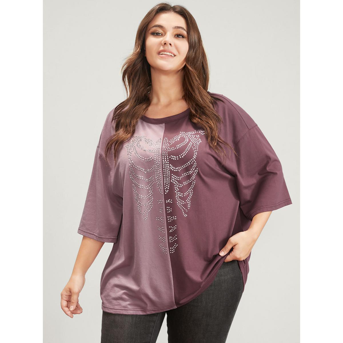 Plus Size Halloween Skeleton Print Colorblock Contrast T-shirt Heather Women Casual Contrast Graphic-Halloween Round Neck Dailywear T-shirts BloomChic 14-16/1X