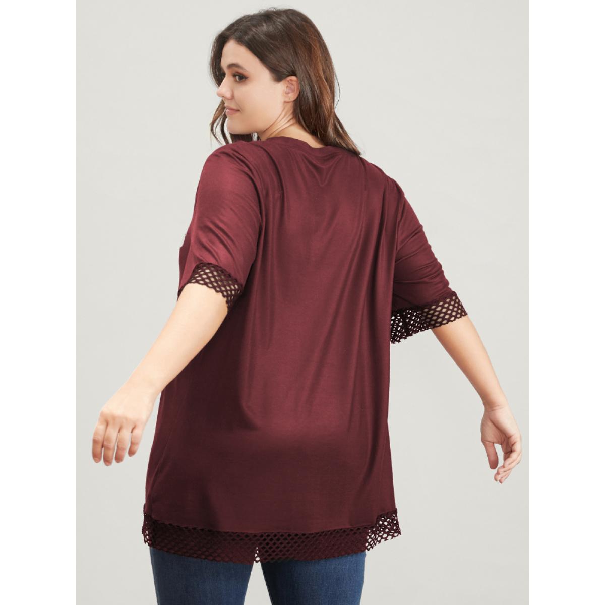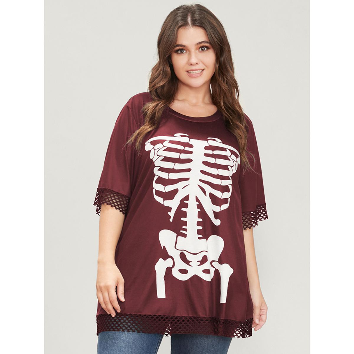 Plus Size Halloween Skeleton Print Fishnet Patch T-shirt Burgundy Women Casual Printed Graphic-Halloween Round Neck Dailywear T-shirts BloomChic 30/6X