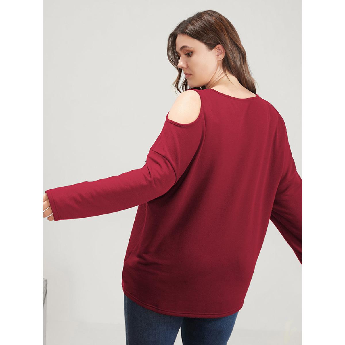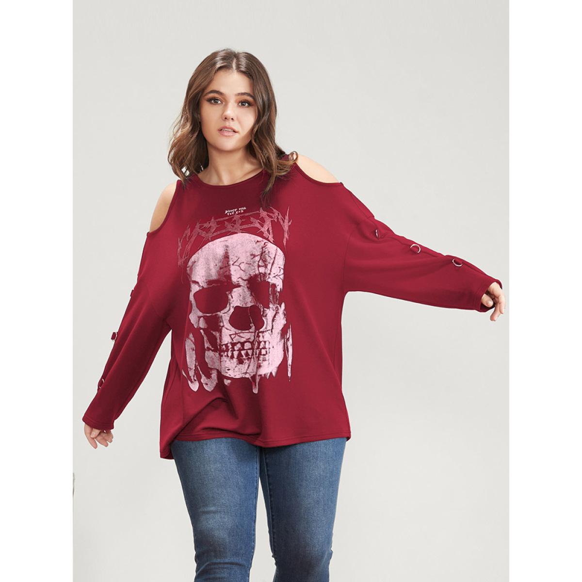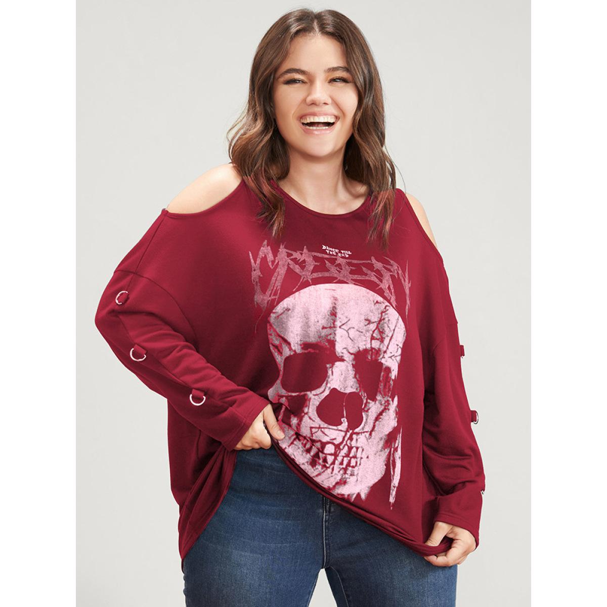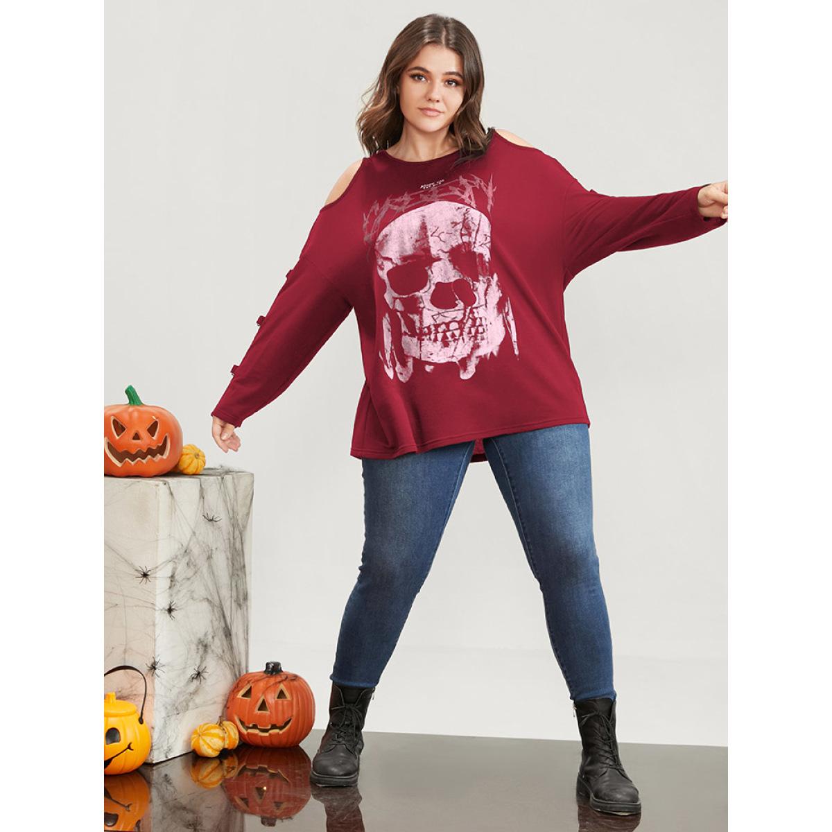 Plus Size Halloween Skull Print Cold Shoulder Sweatshirt Women Scarlet Elegant Printed Round Neck Dailywear Sweatshirts BloomChic 22-24/3X