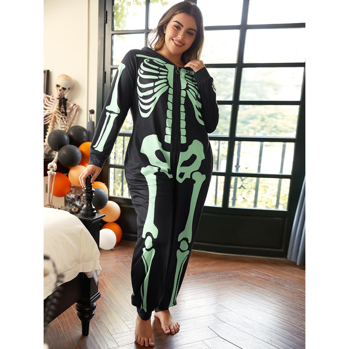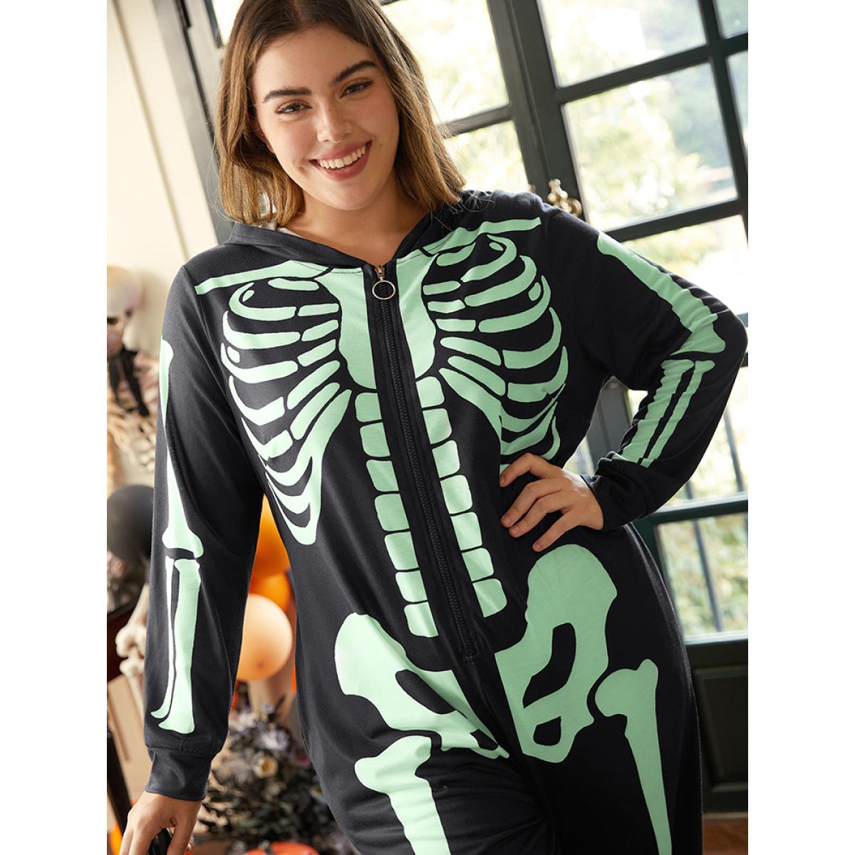 Plus Size Halloween Skull Print Hooded Zipper Sleep Jumpsuit Women Green Casual Graphic-Halloween Printed Hooded Pocket Loungewear BloomChic 12/L