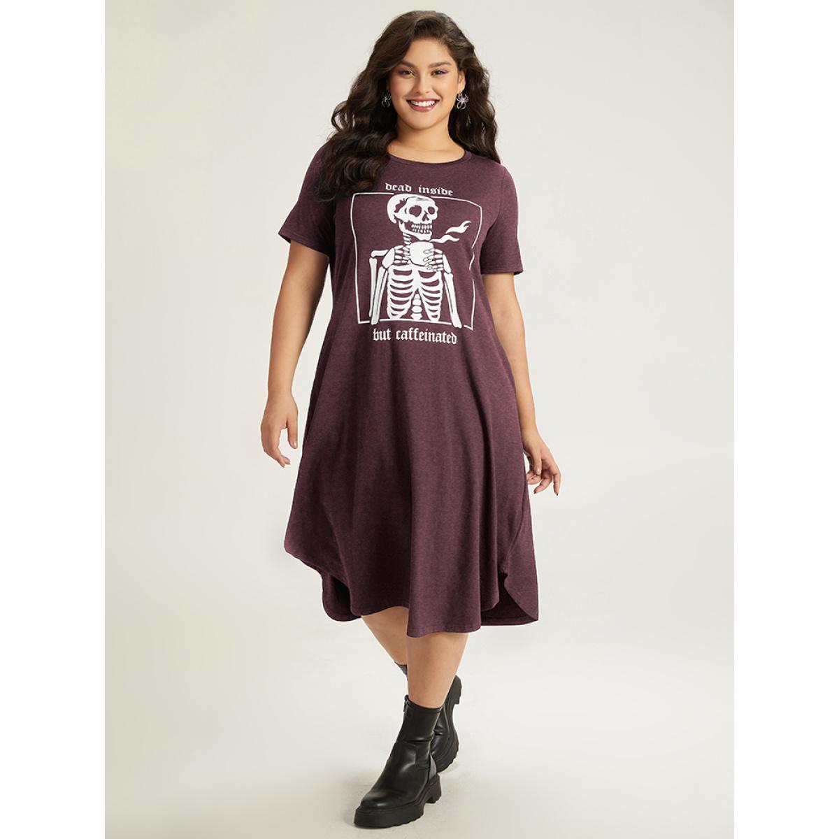 Plus Size Halloween Skull Print Pocket Arc Hem Dress DarkBrown Women Casual Printed Curvy Midi Dress BloomChic 30/6X