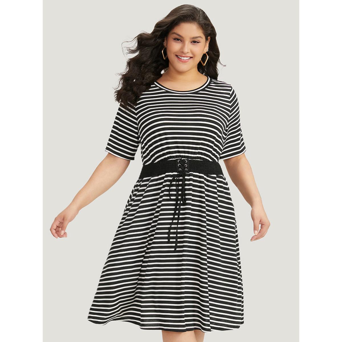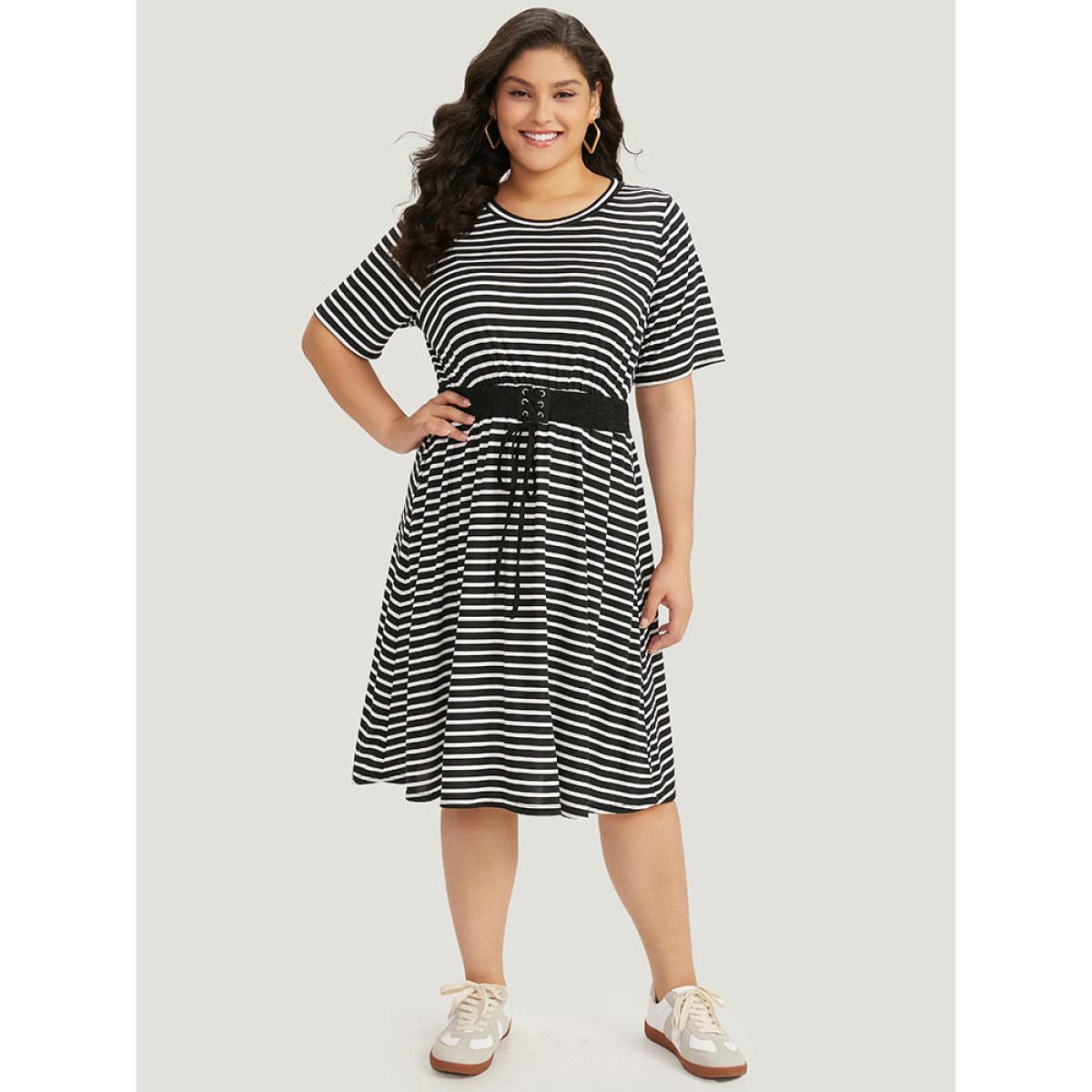 Plus Size Halloween Striped Patchwork Pocket Round Neck Ties Dress Black Women Casual Contrast Round Neck Short sleeve Curvy Midi Dress BloomChic 28/5X
