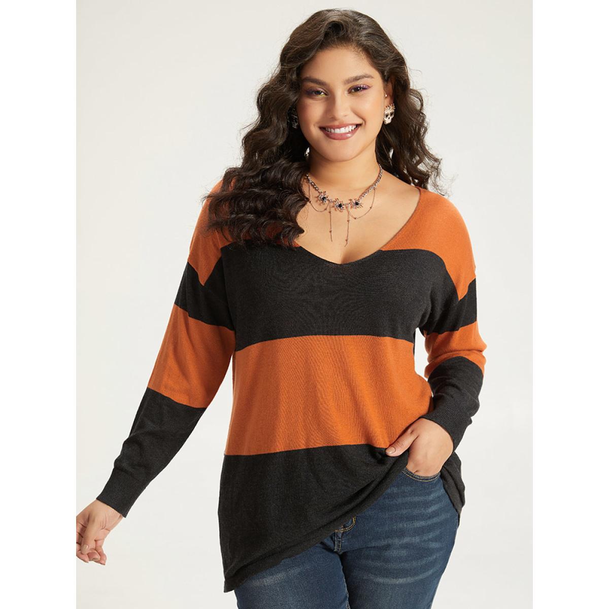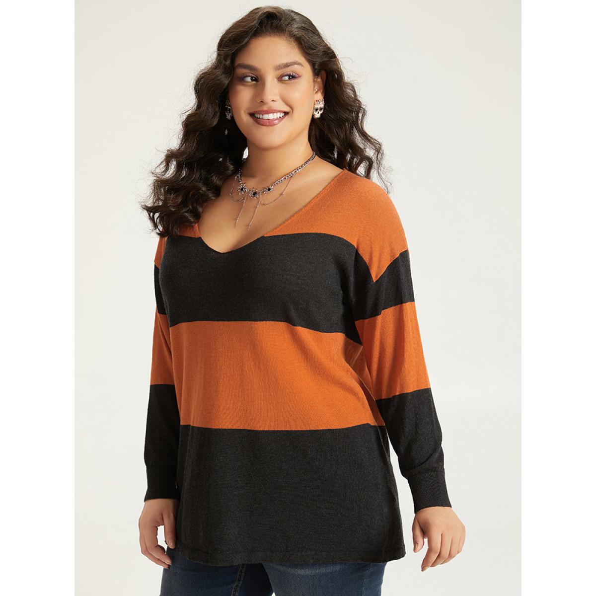 Plus Size Halloween Supersoft Essentials Colorblock Contrast Elastic Cuffs Pullover Orange Women Casual Loose Long Sleeve V-neck Everyday Pullovers BloomChic 12/L