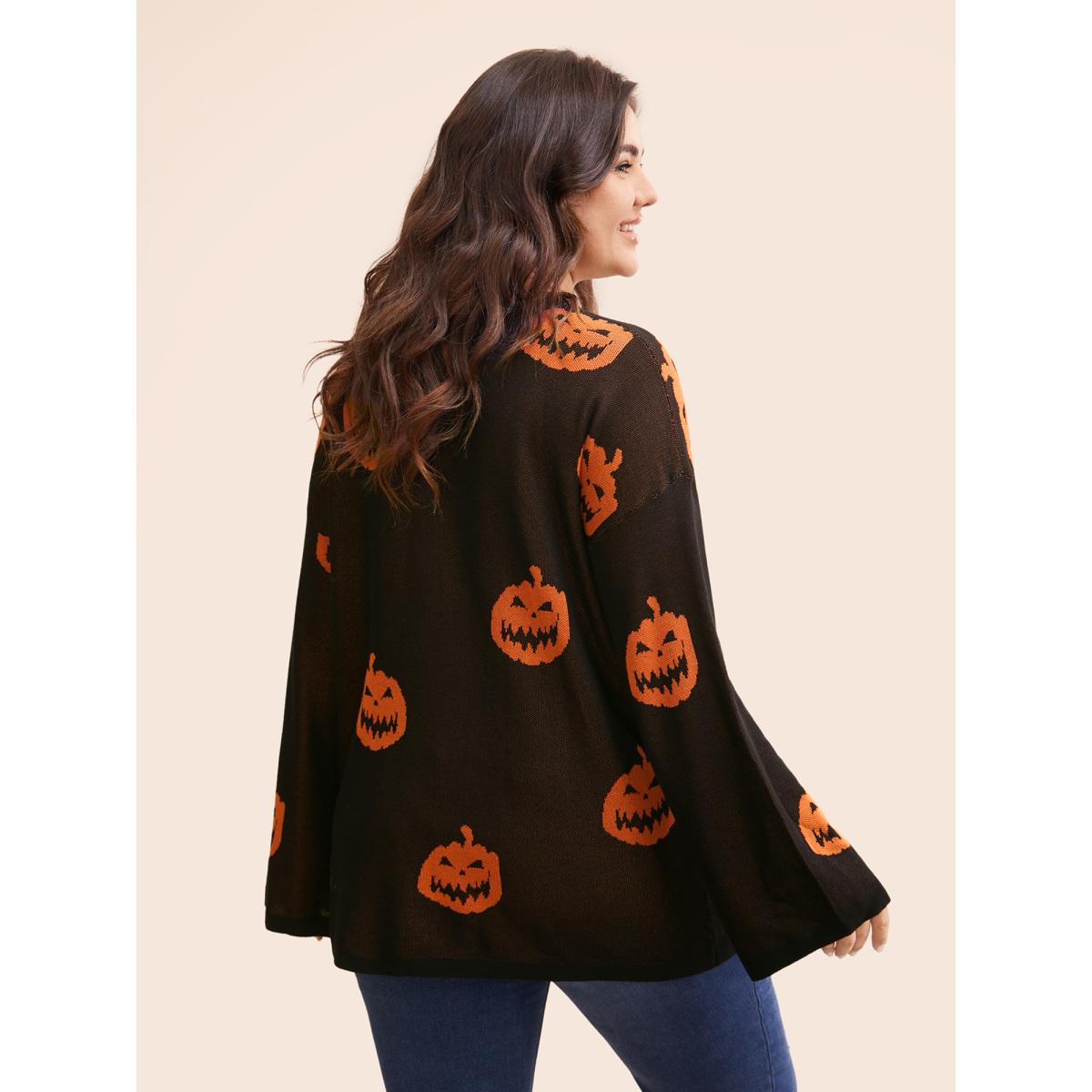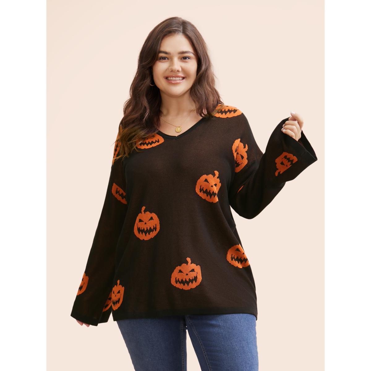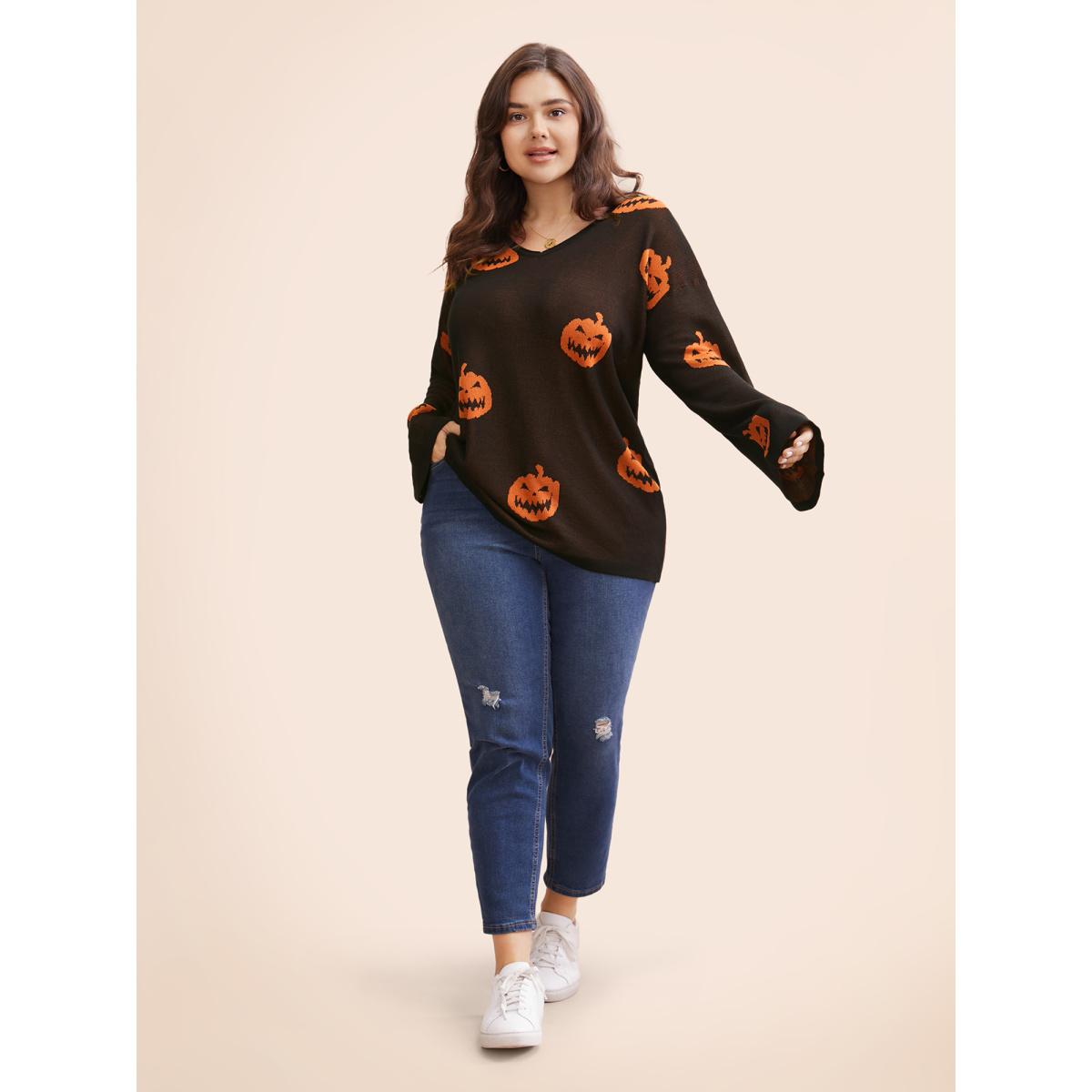 Plus Size Halloween V Neck Bell Sleeve Pullover Black Women Playful Loose V-neck Casual Pullovers BloomChic 26/4X Product Image