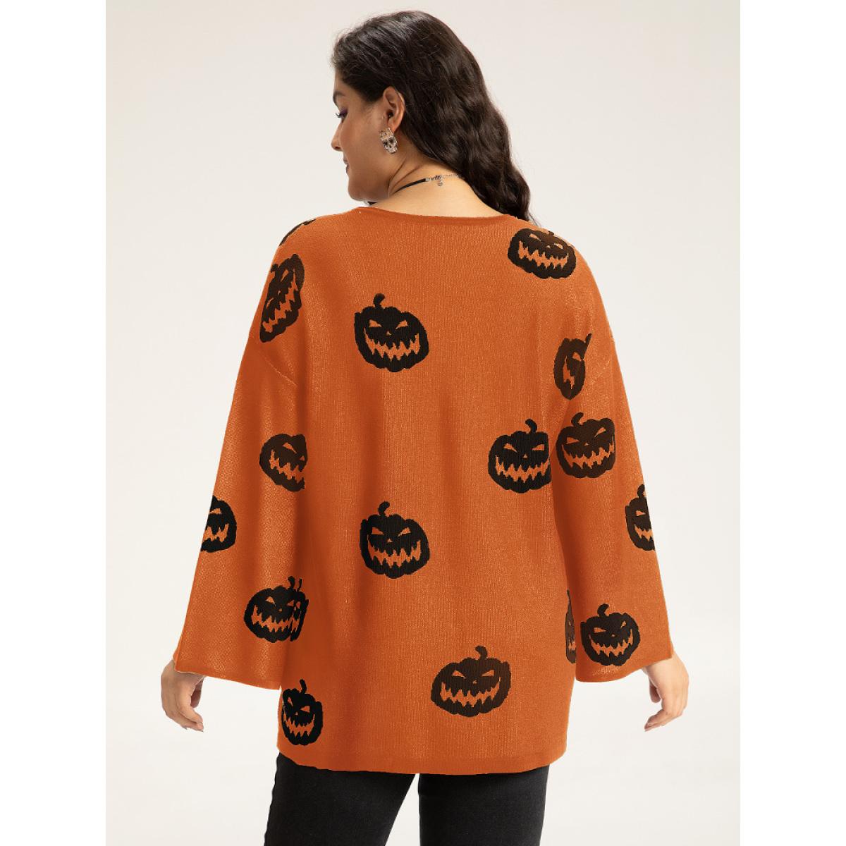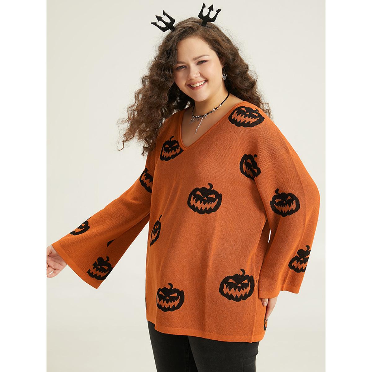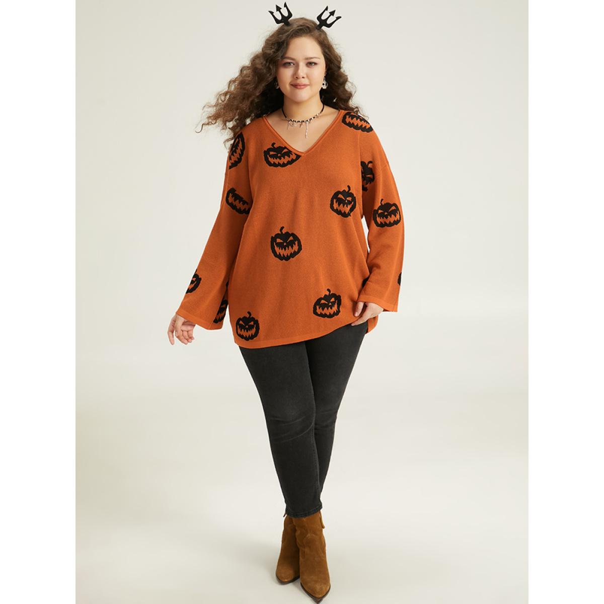 Plus Size Halloween Graphic Pumpkin V Neck Pullover Scarlet Women Casual Loose Long Sleeve V-neck Dailywear Pullovers BloomChic 12/L