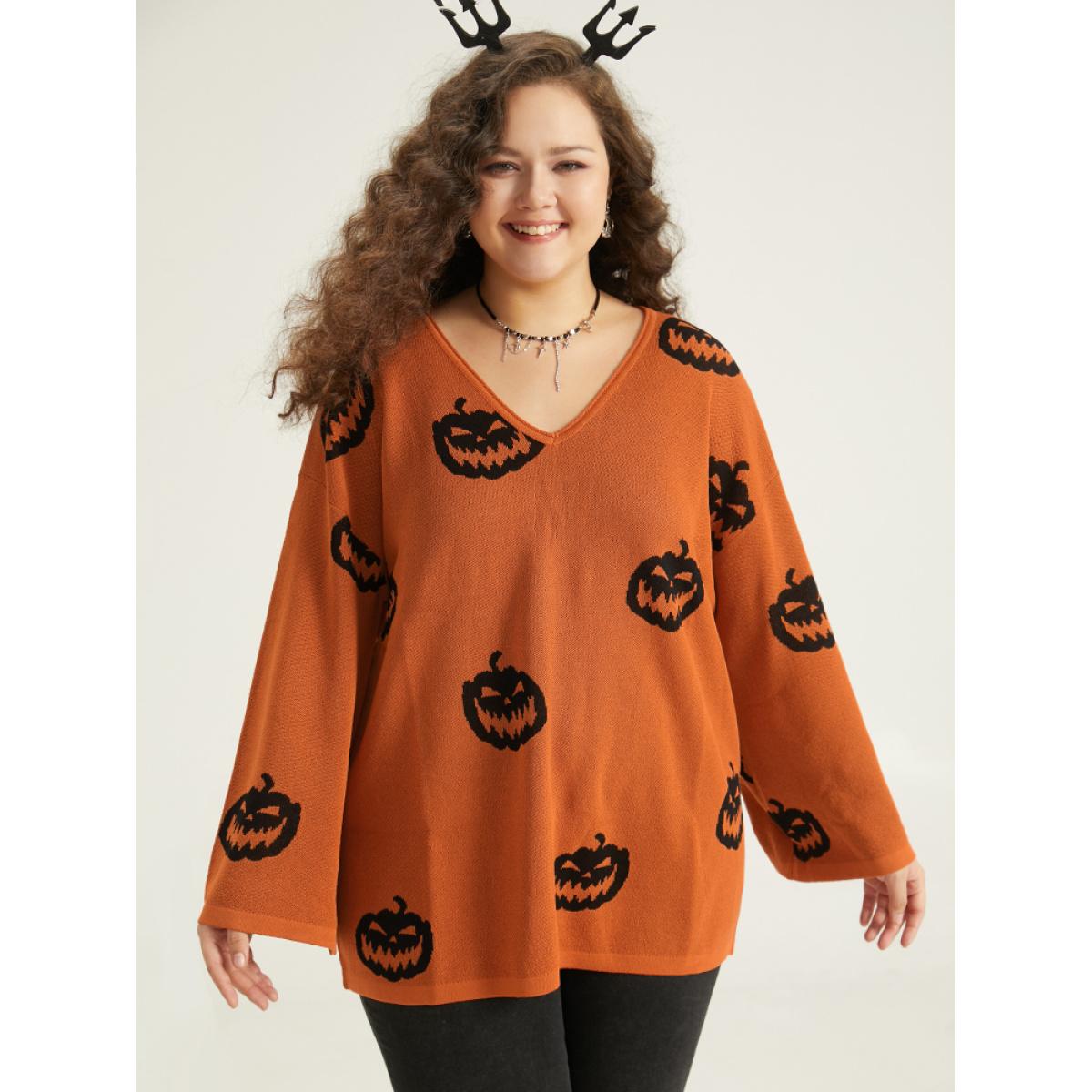 Plus Size Halloween V Neck Bell Sleeve Pullover Chocolate Women Playful Loose V-neck Casual Pullovers BloomChic 18-20/2X Product Image