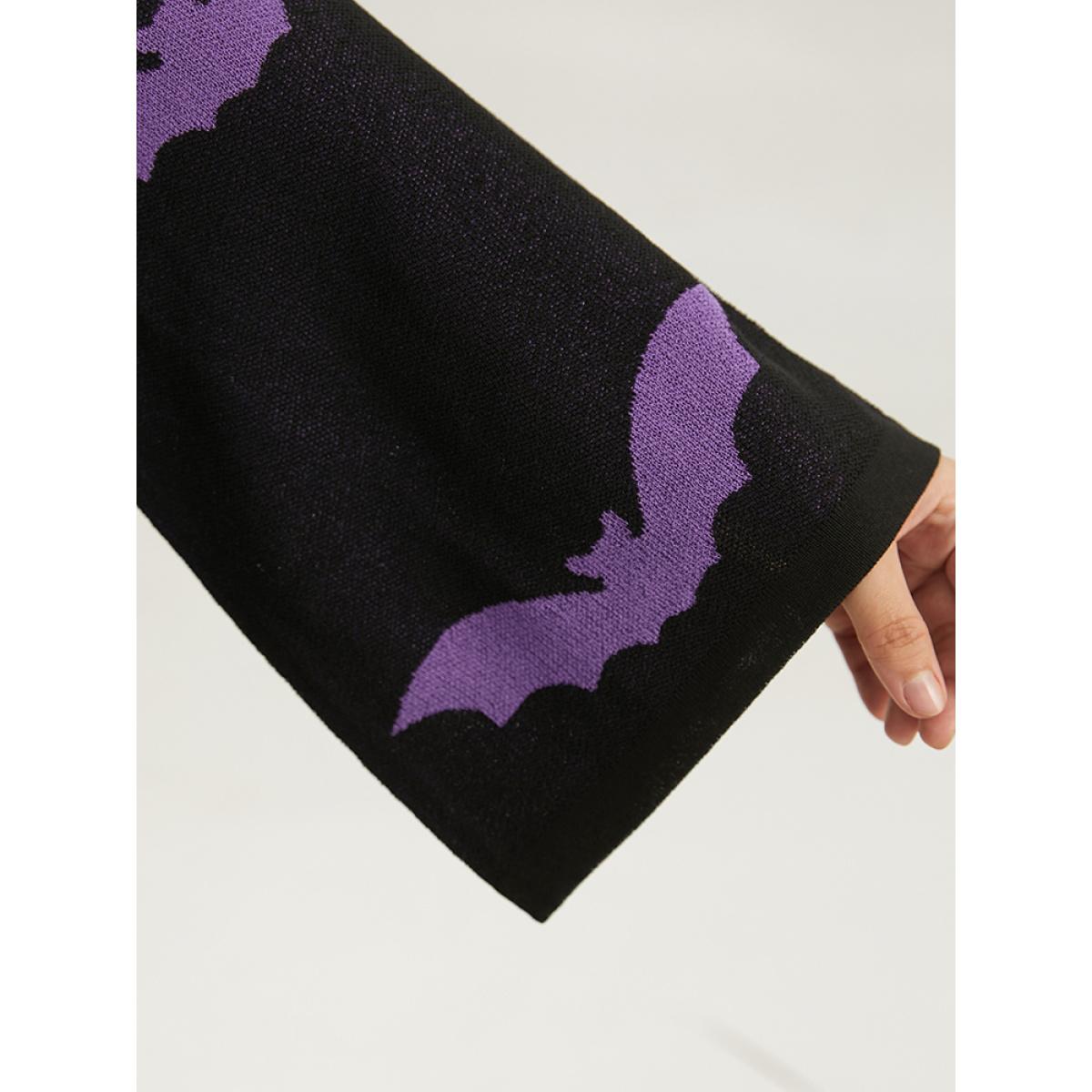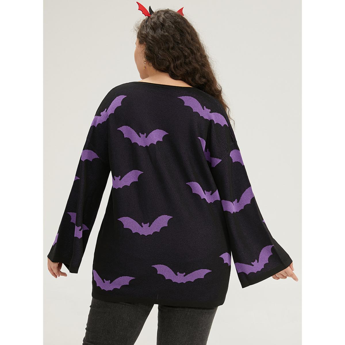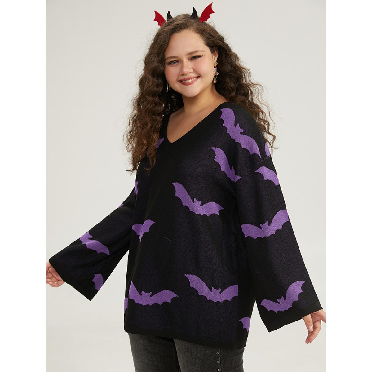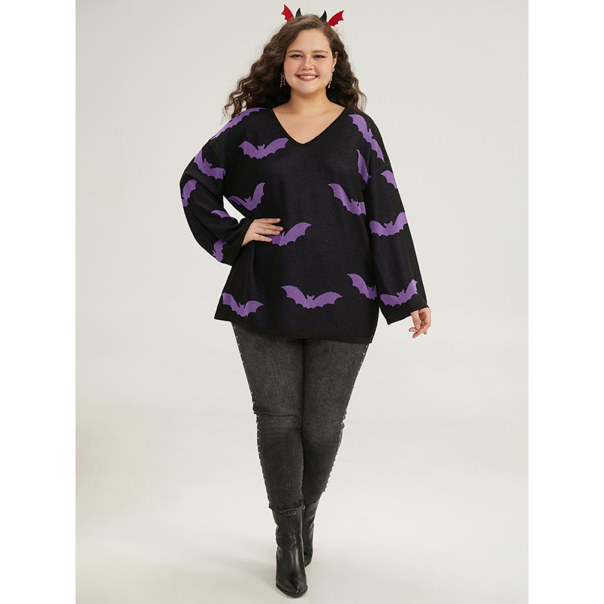 Plus Size Halloween V Neck Bell Sleeve Pullover Black Women Playful Loose V-neck Casual Pullovers BloomChic 26/4X