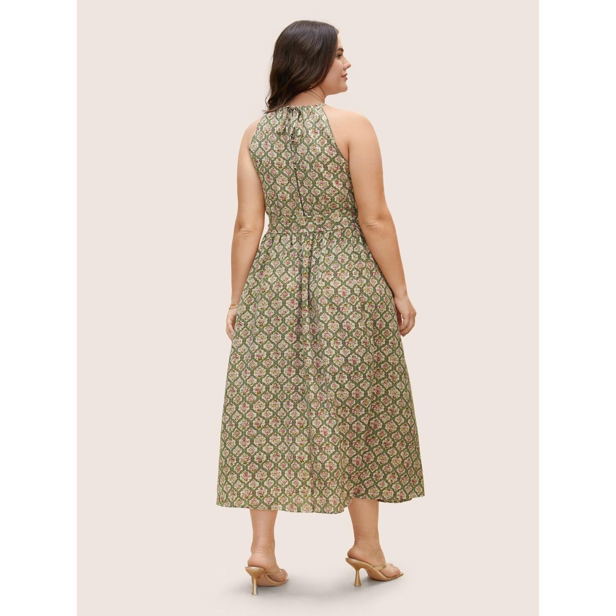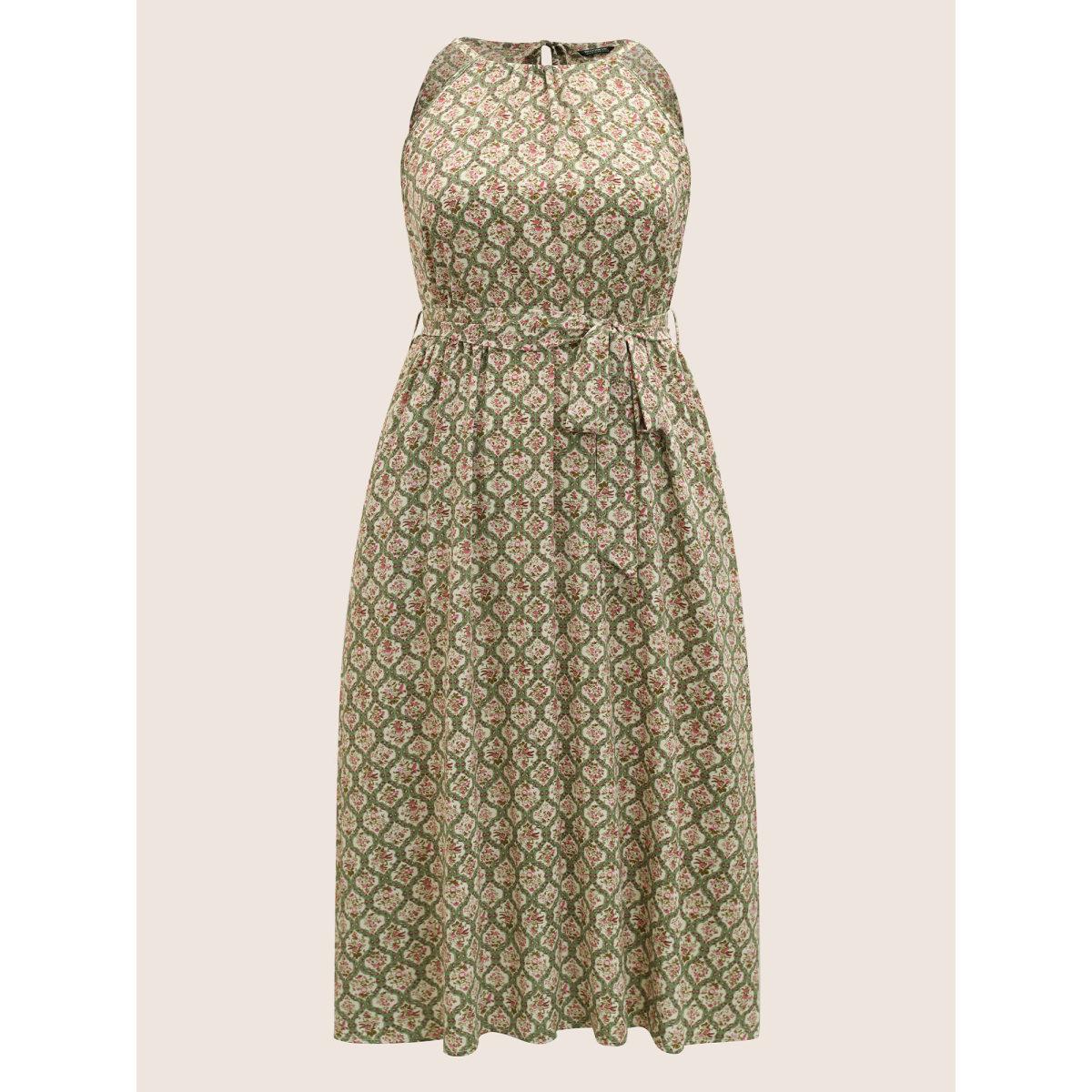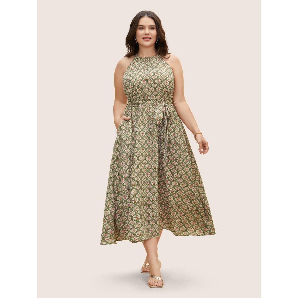 Plus Size Allover Print Halter Keyhole Pocket Belted Ties Dress Green Women Elegant Belted Halter neck Sleeveless Curvy Midi Dress BloomChic 30/6X